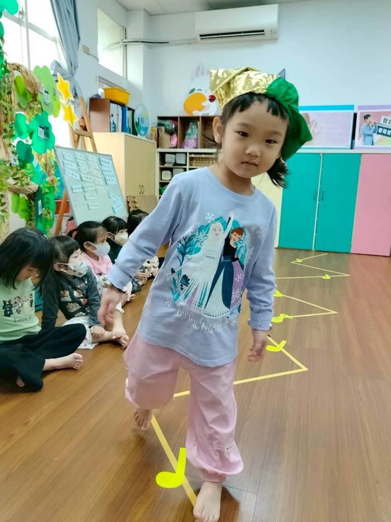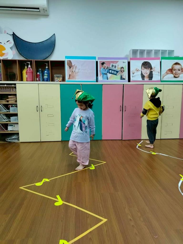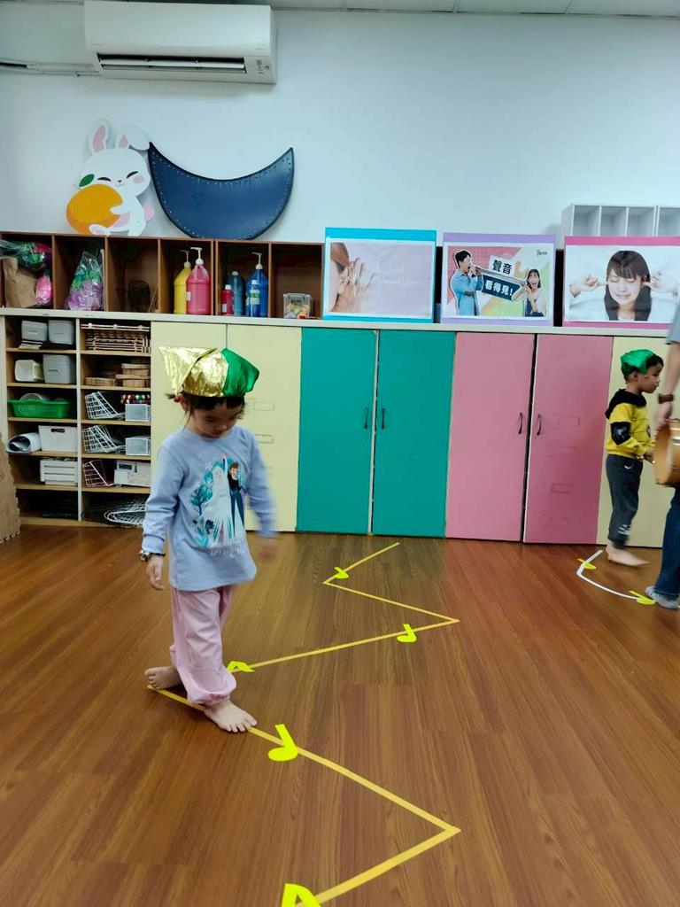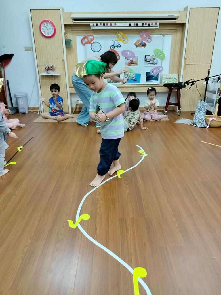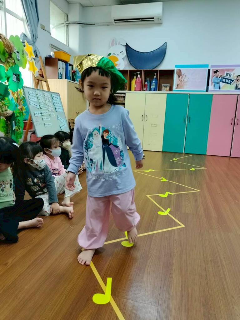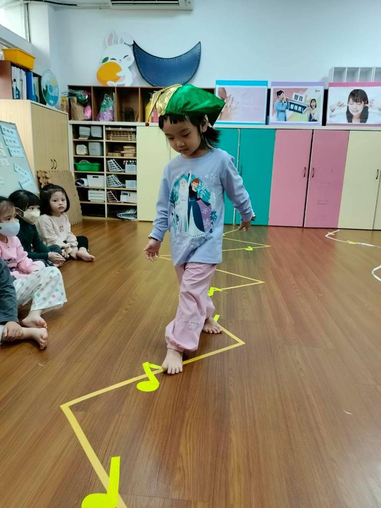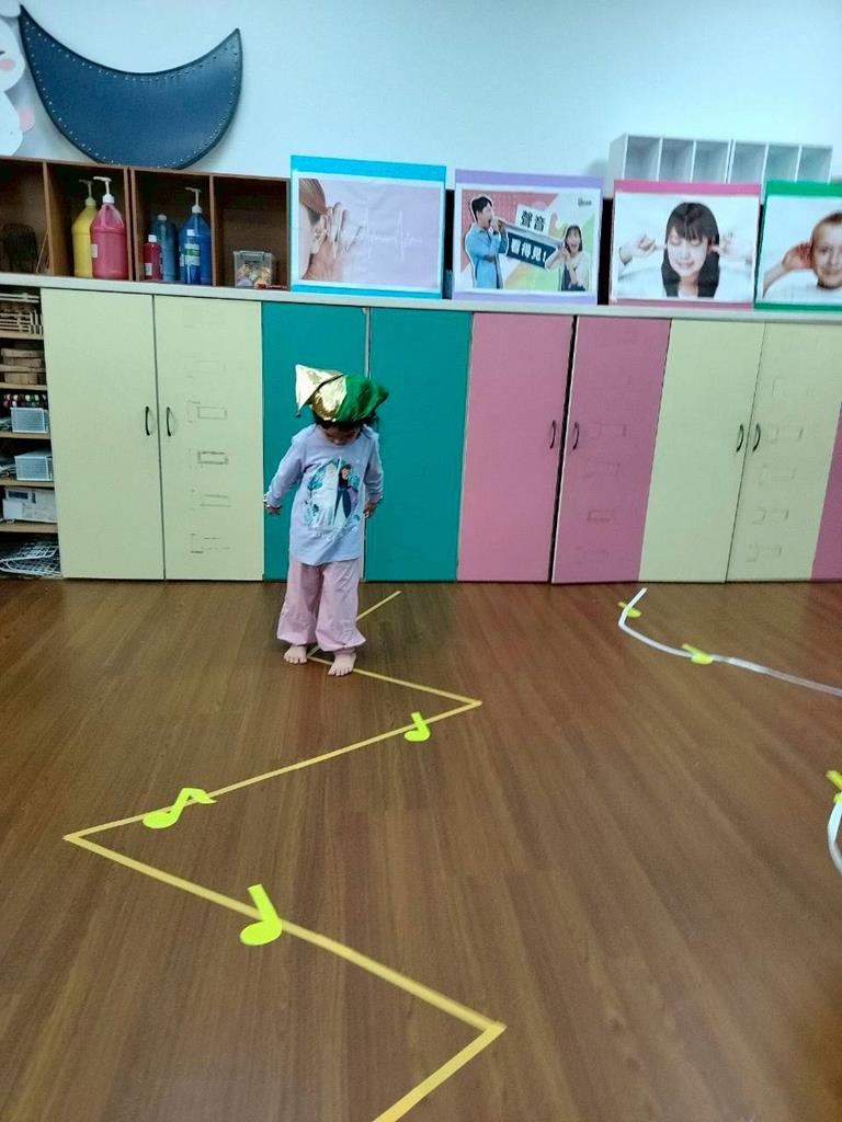 老師在地板貼出三條不同線條,讓孩子跟著節奏拍手走出不伐