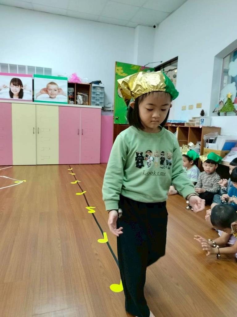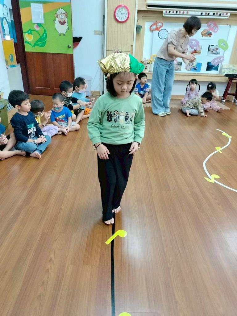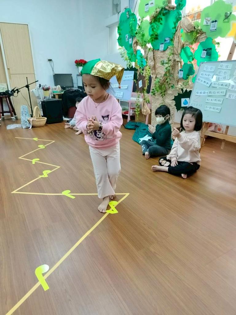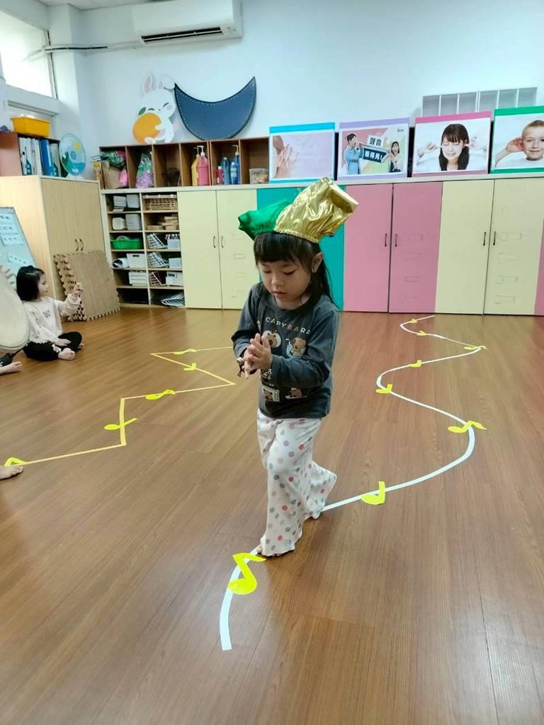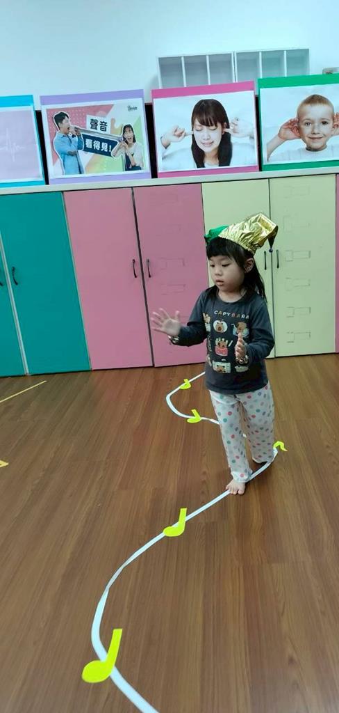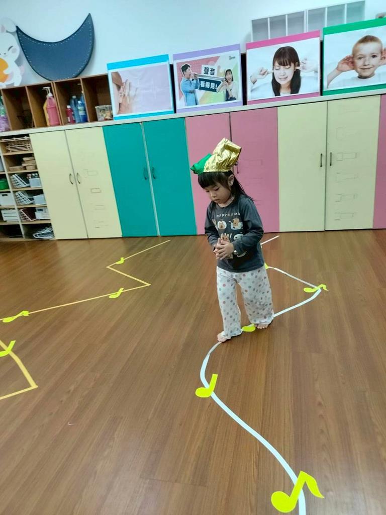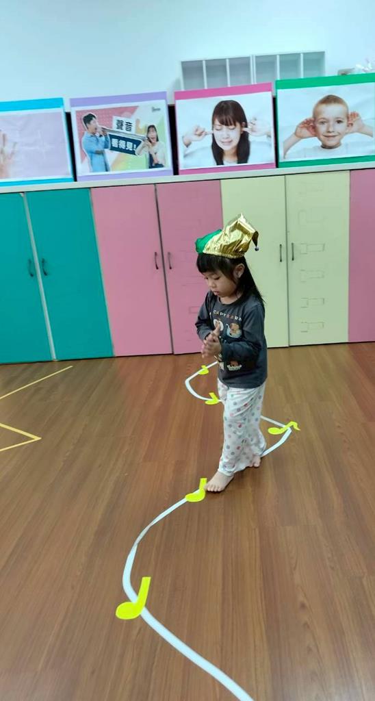 老師在地板貼出三條不同線條,讓孩子跟著節奏拍手走出不伐