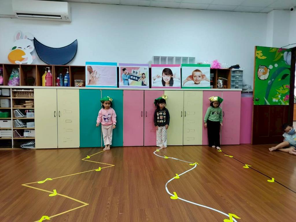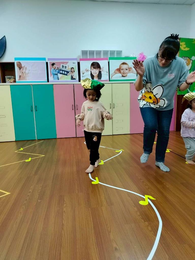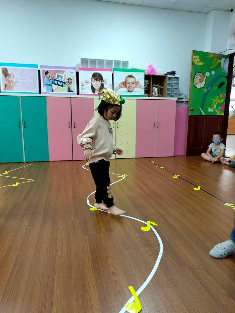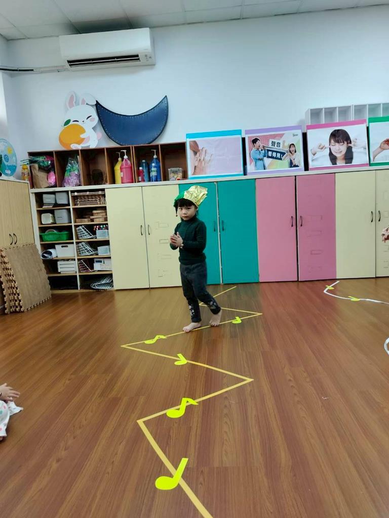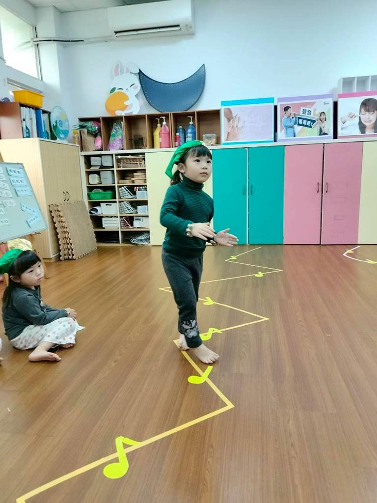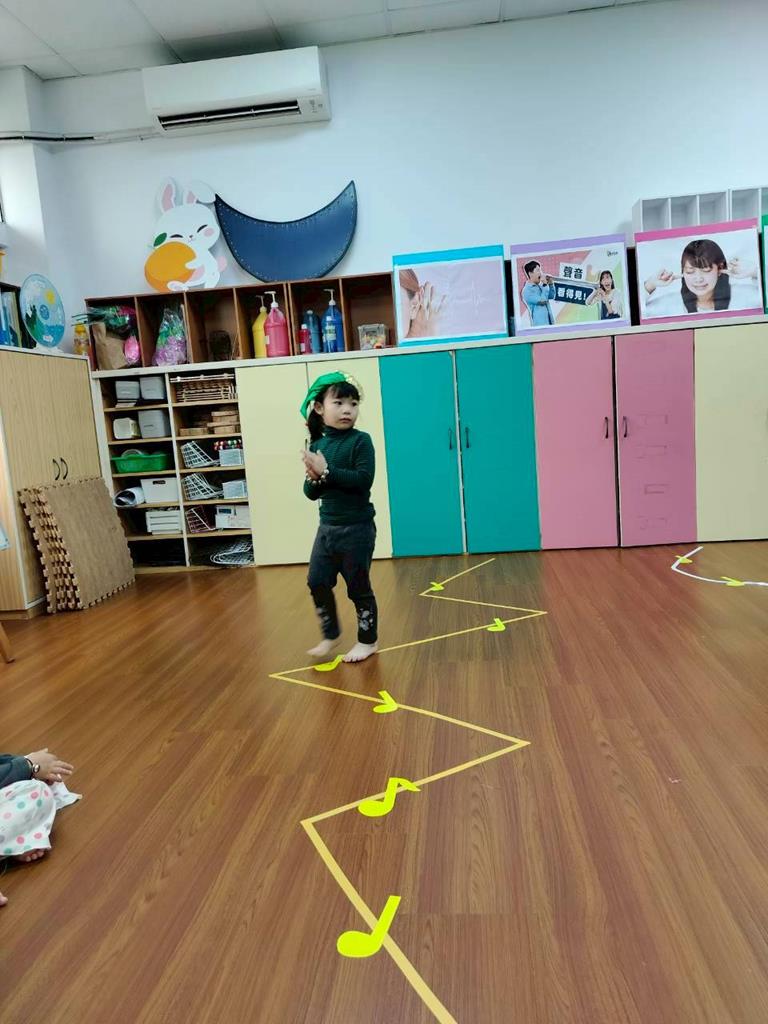 老師在地板貼出三條不同線條,讓孩子跟著節奏拍手走出不伐
