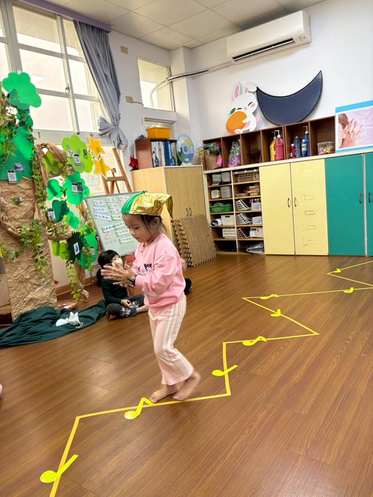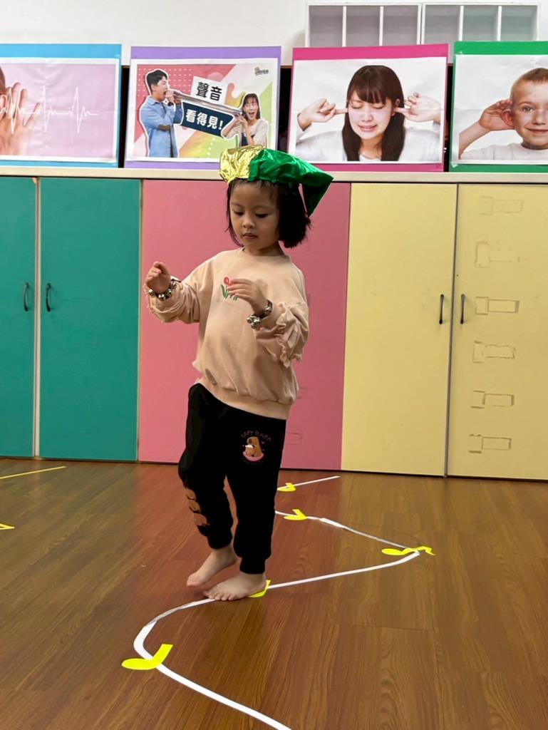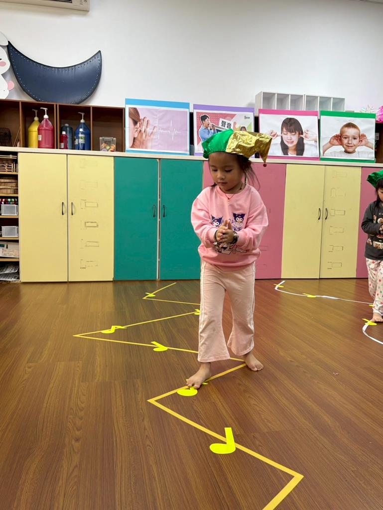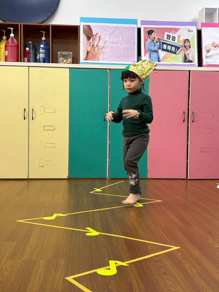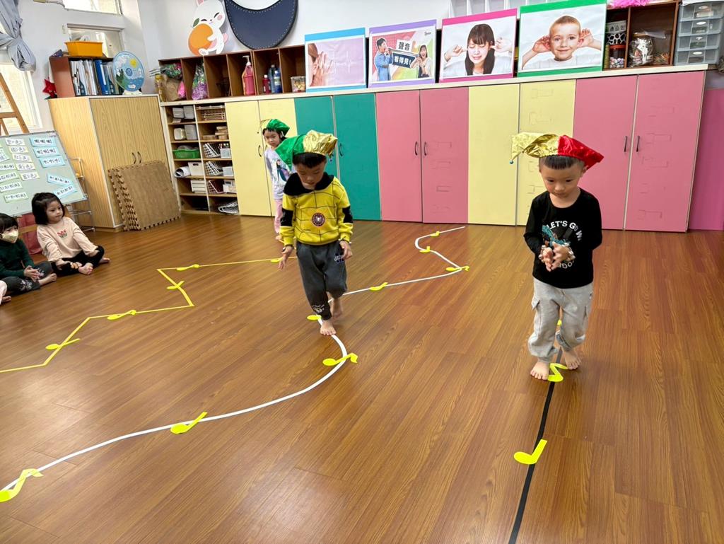 老師在地板貼出三條不同線條,讓孩子跟著節奏拍手走出不伐