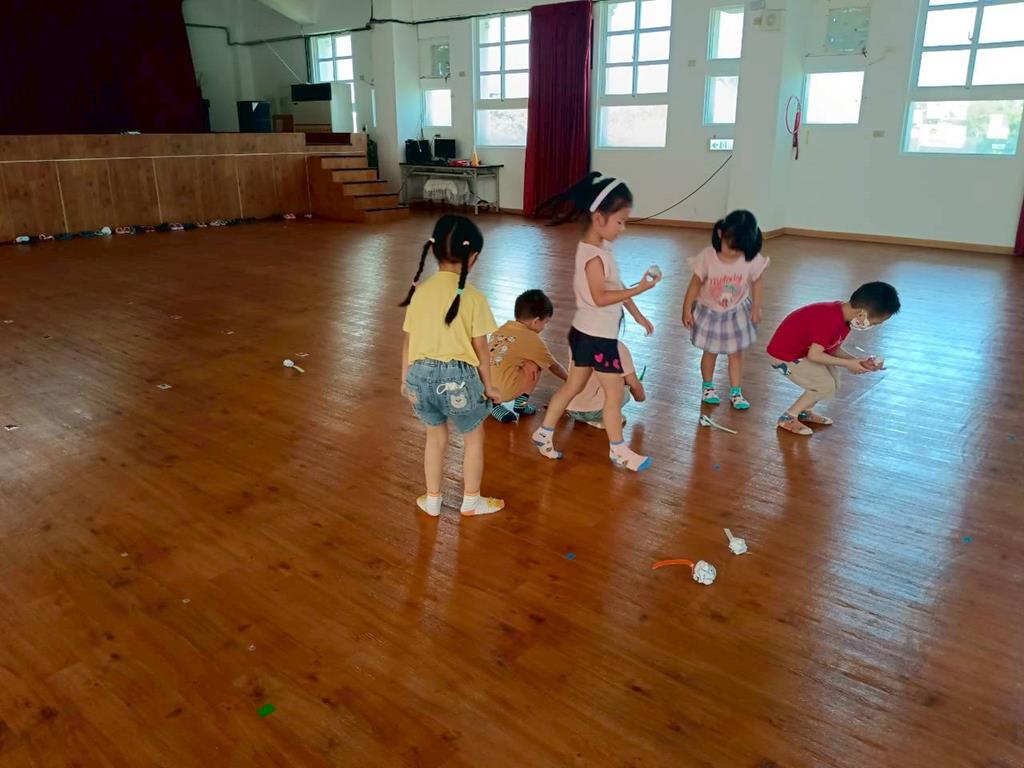 孩子設計紙球發射的聲音並自由模擬發射紙球,練習咻~咻~咻~的聲音。