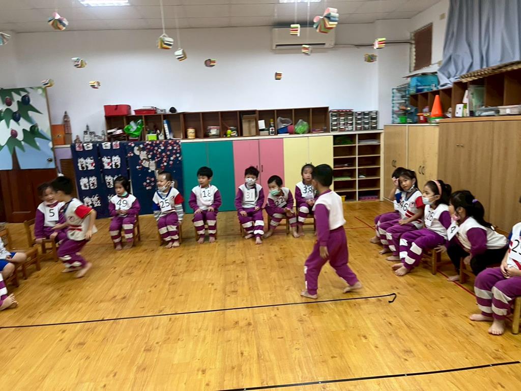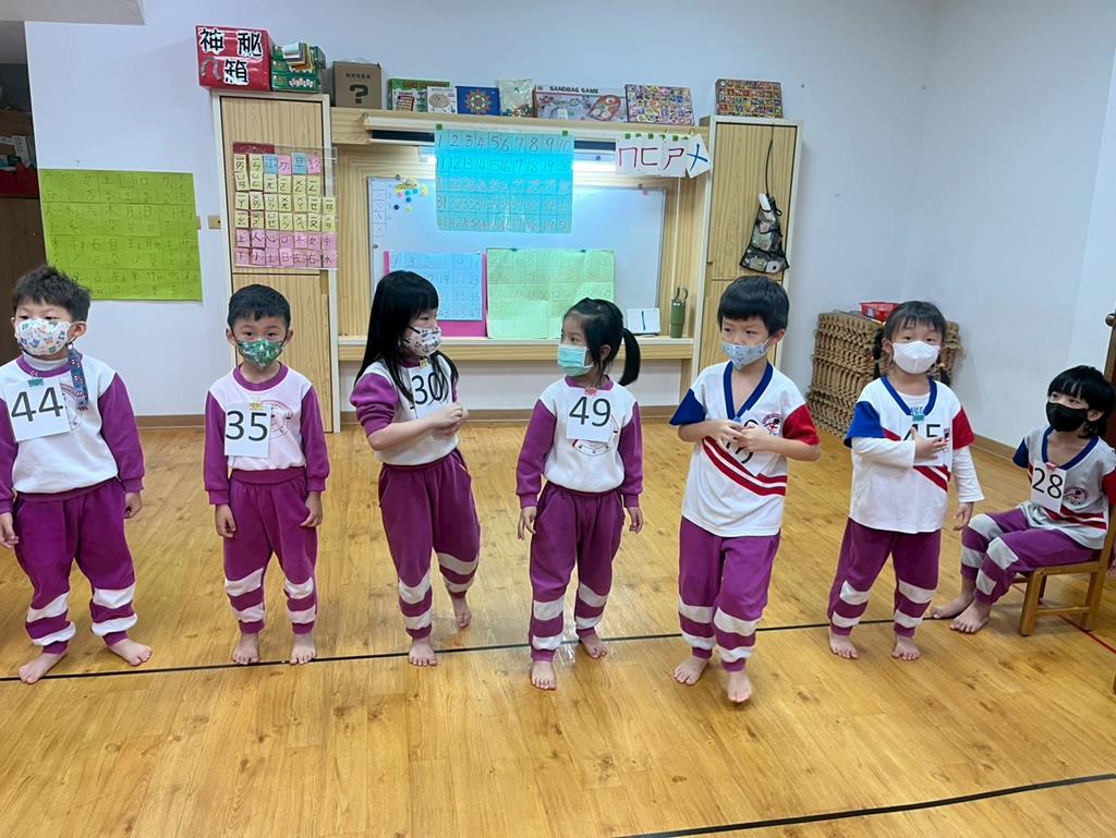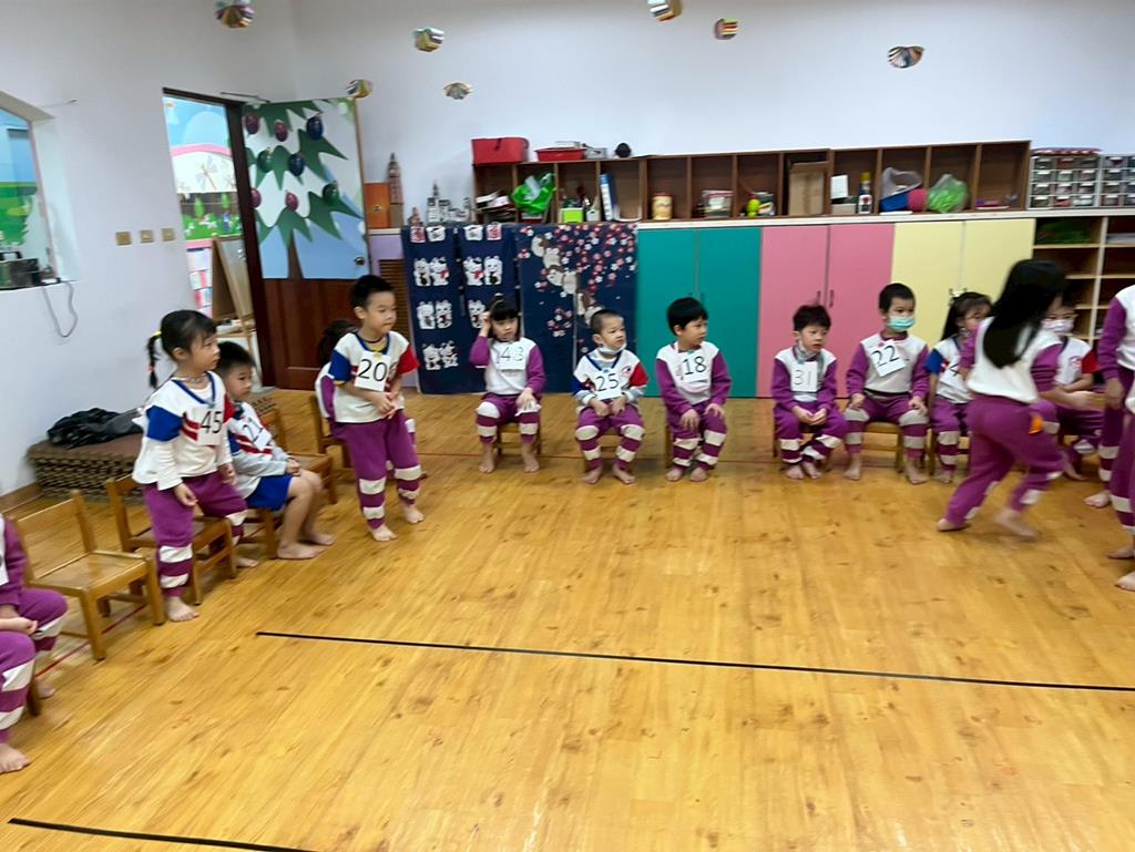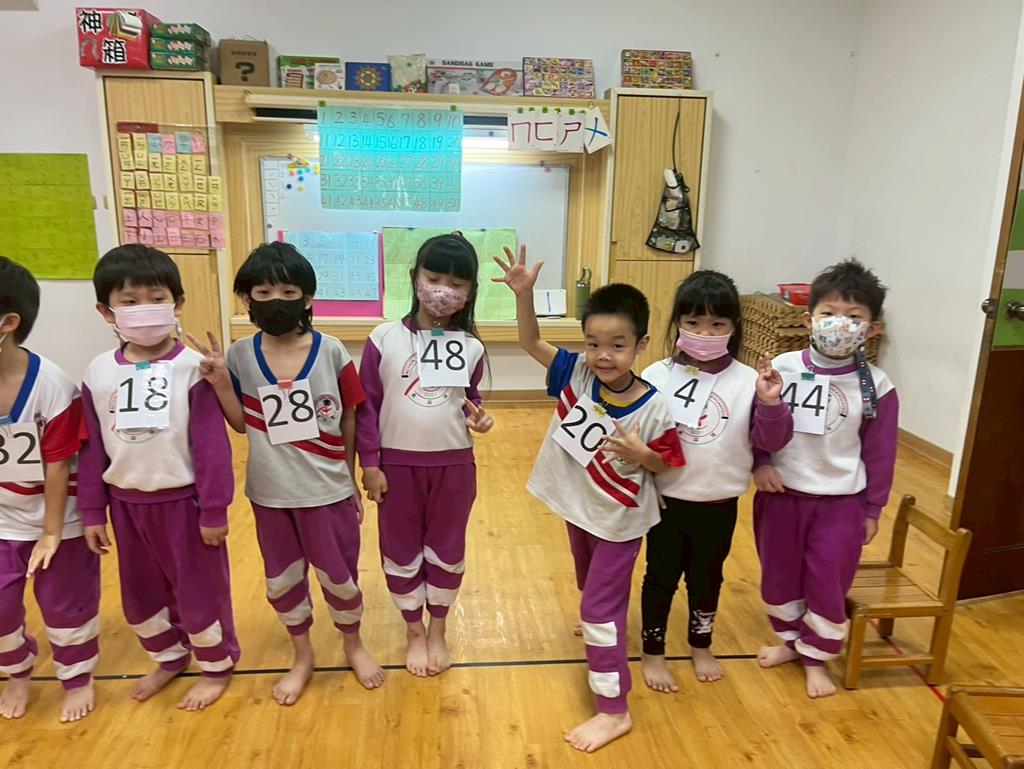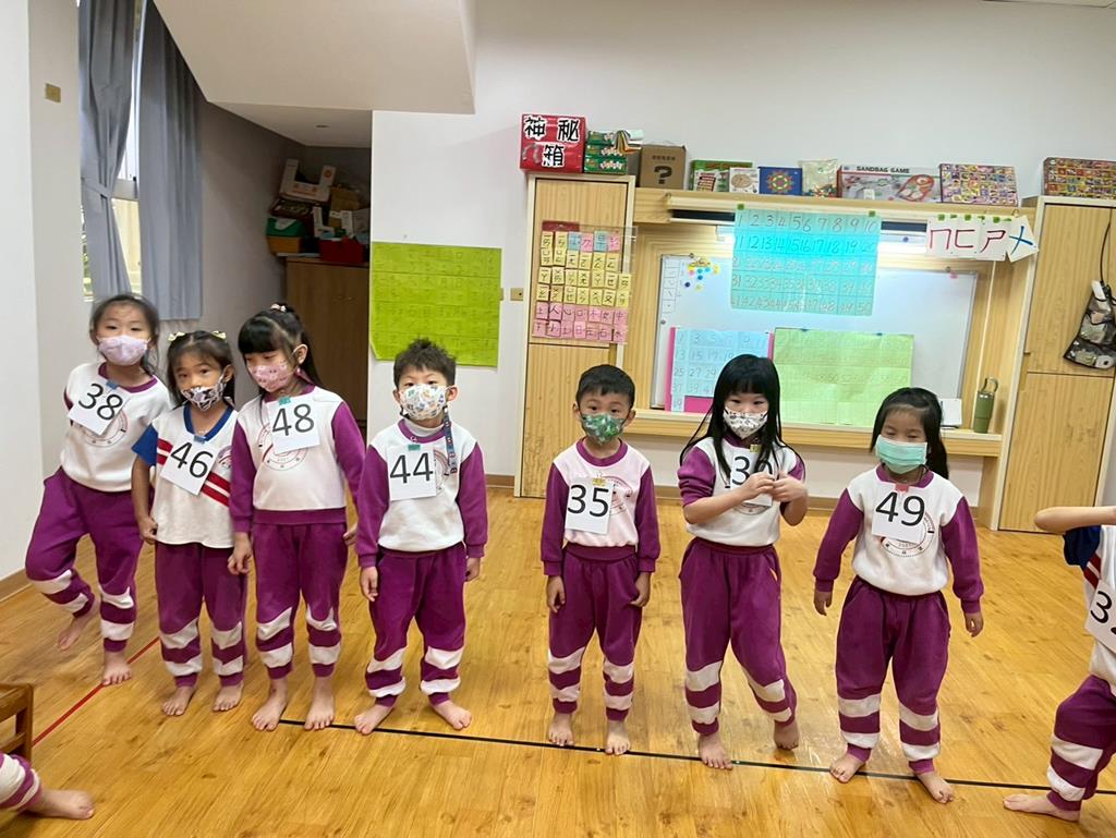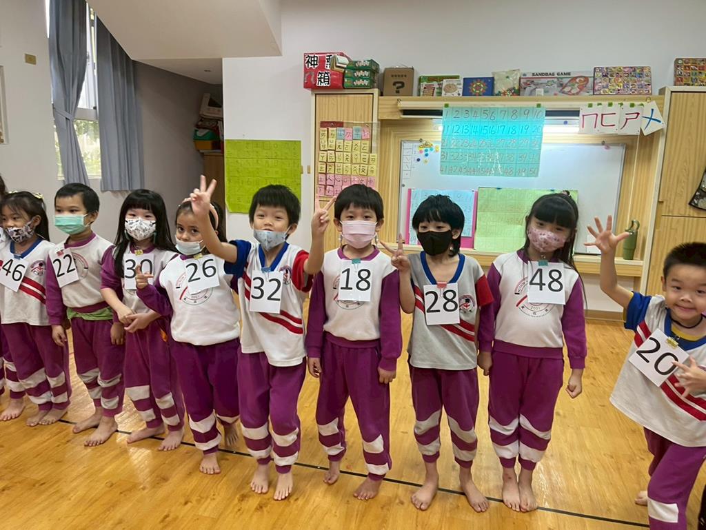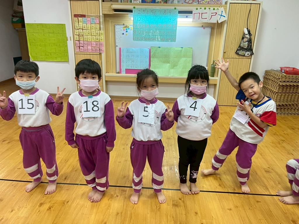 老師帶著幼兒進行遊戲,將數字夾在幼兒身上,進行數字大風吹