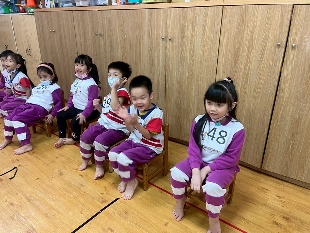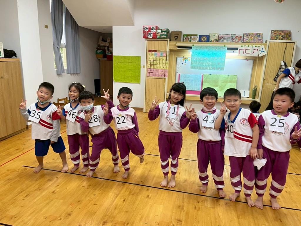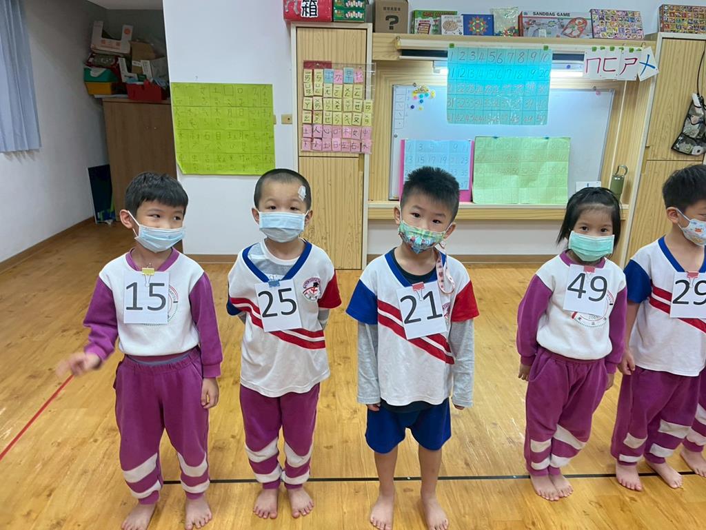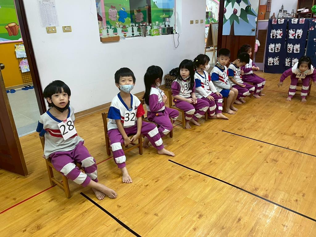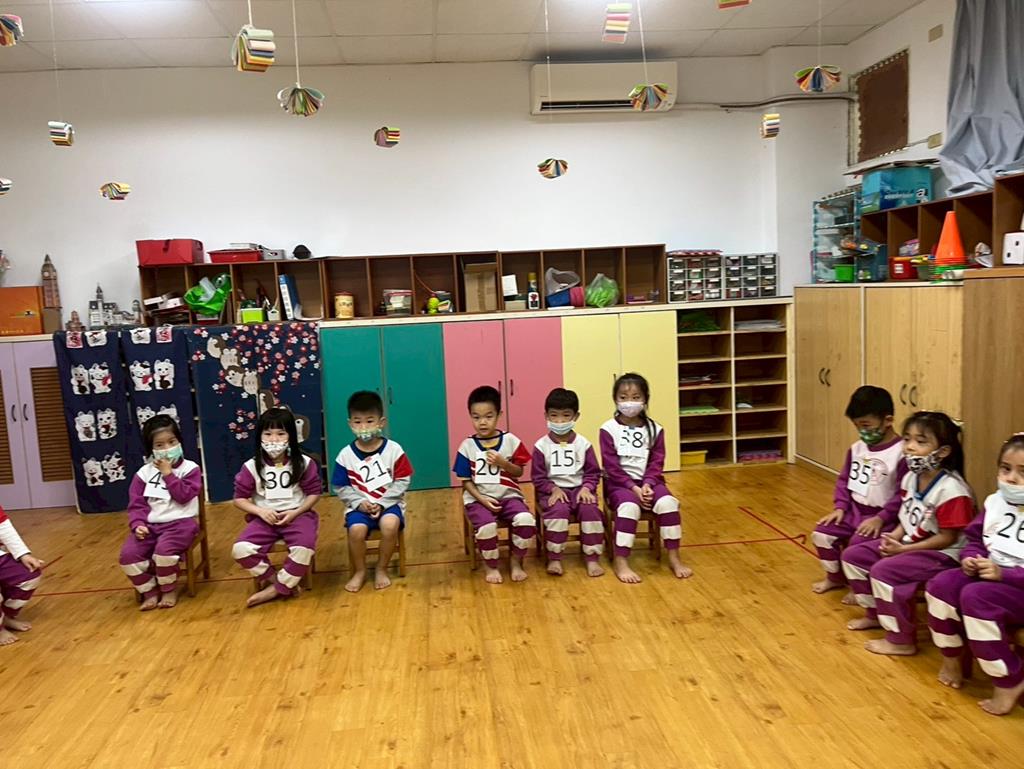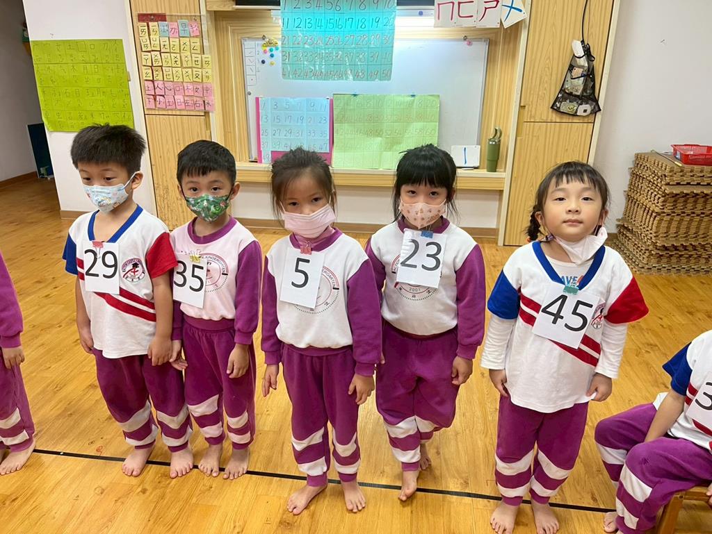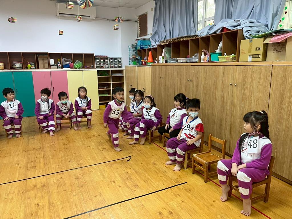 老師帶著幼兒進行遊戲,將數字夾在幼兒身上,進行數字大風吹