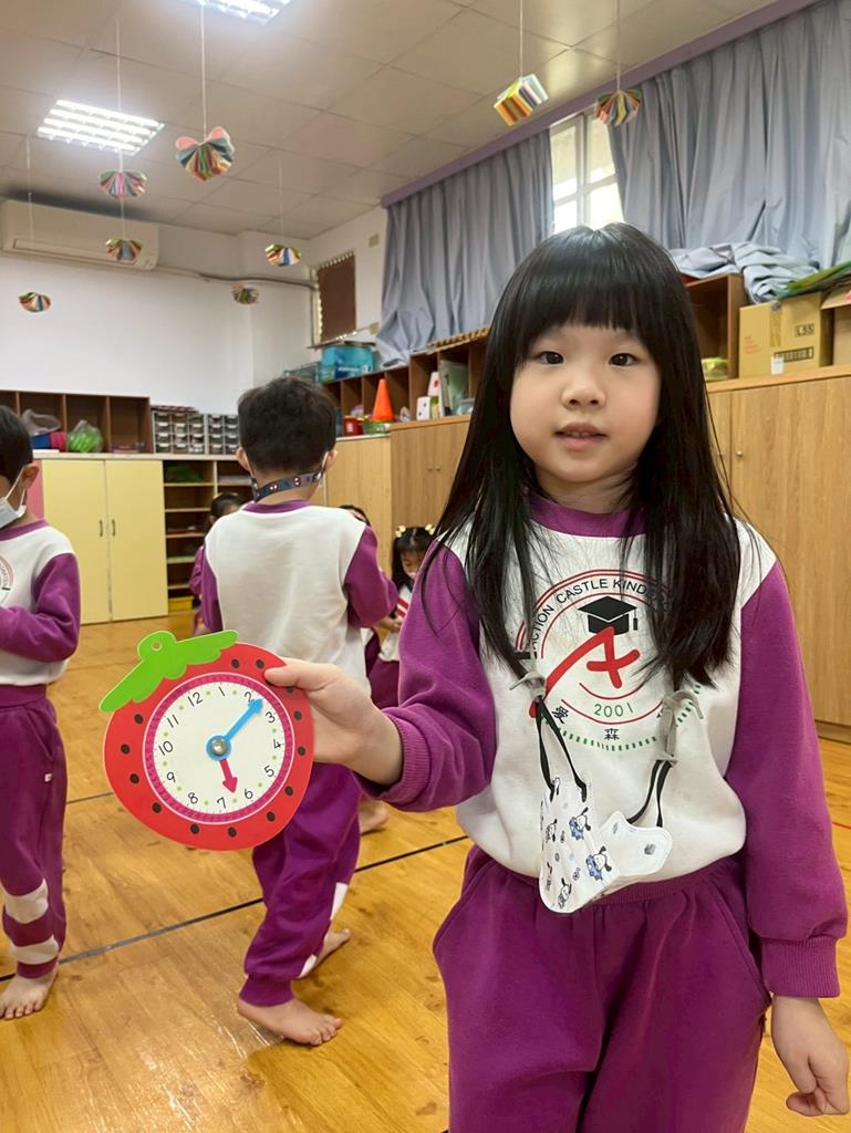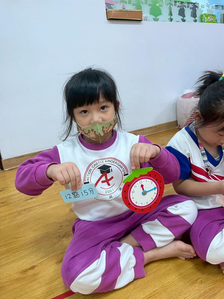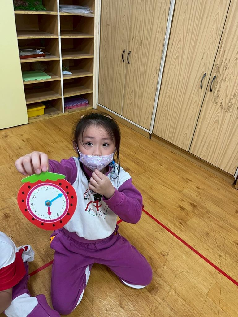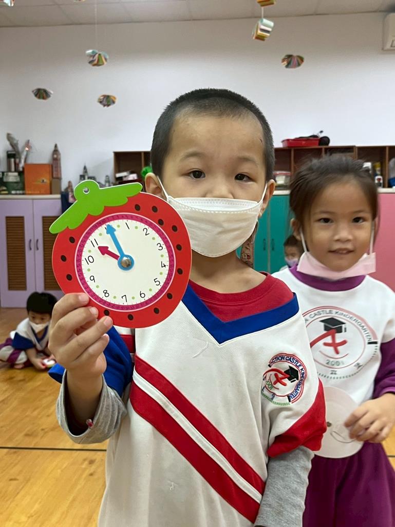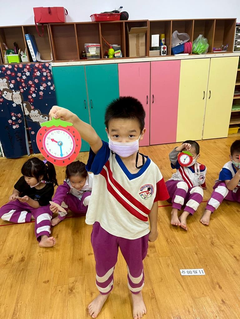 邀請幼兒拿起時鐘,老師拿出數字的時間,能正確轉出時鐘即過關