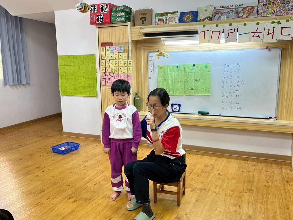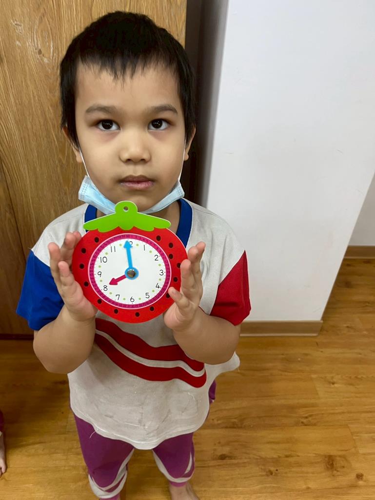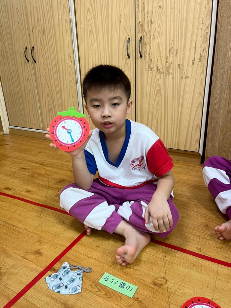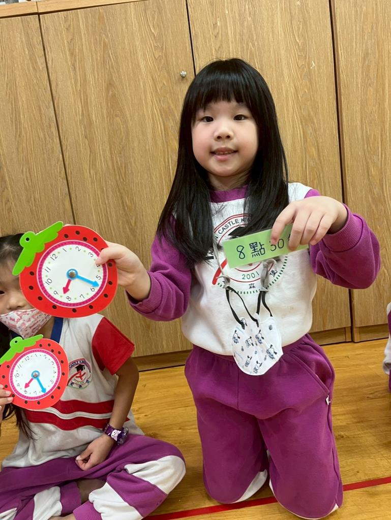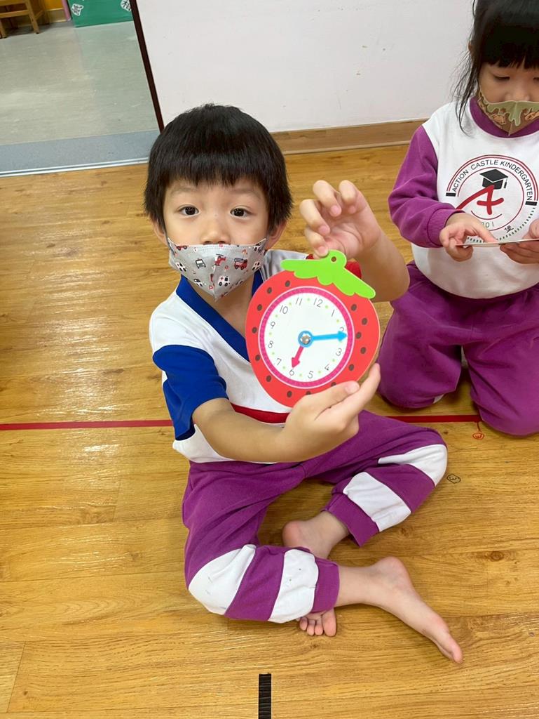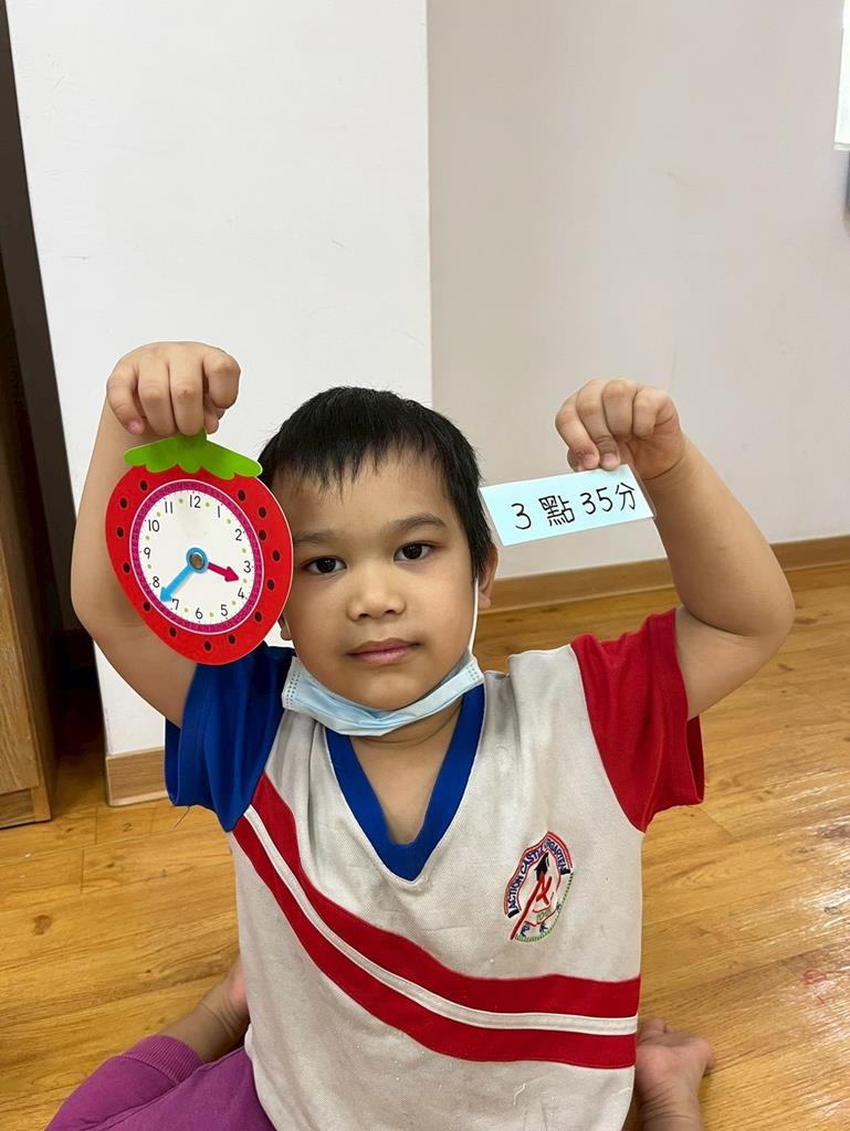 邀請幼兒拿起時鐘,老師拿出數字的時間,能正確轉出時鐘即過關