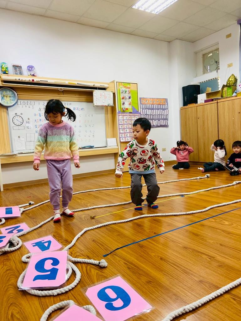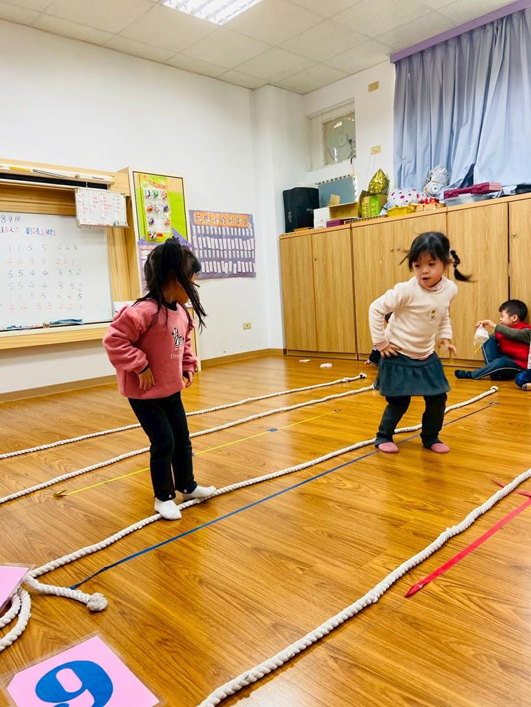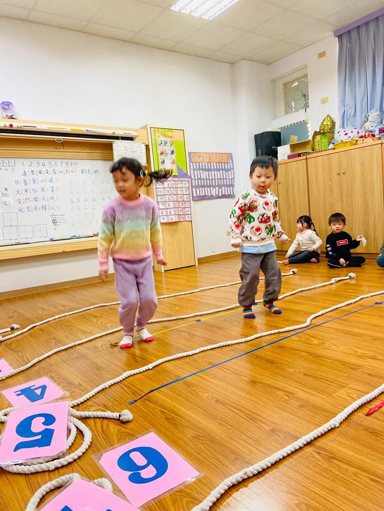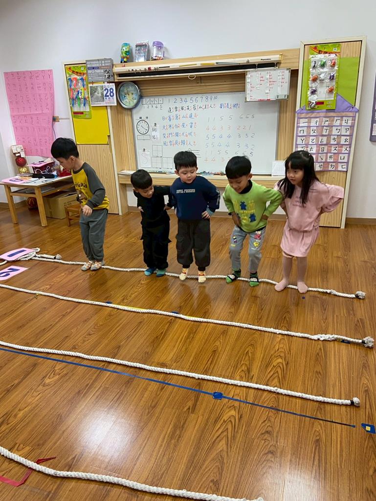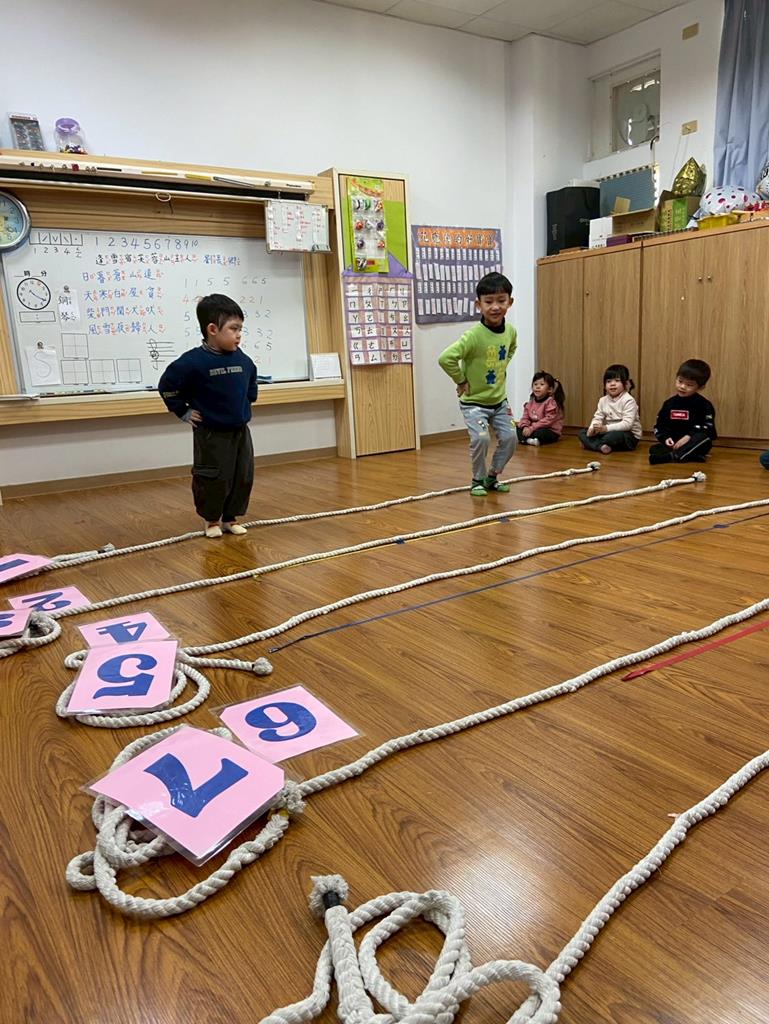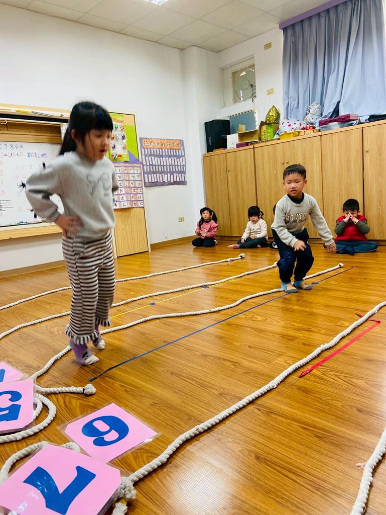 老師用繩子排成5線譜的形狀與孩子進行好玩的音樂遊戲