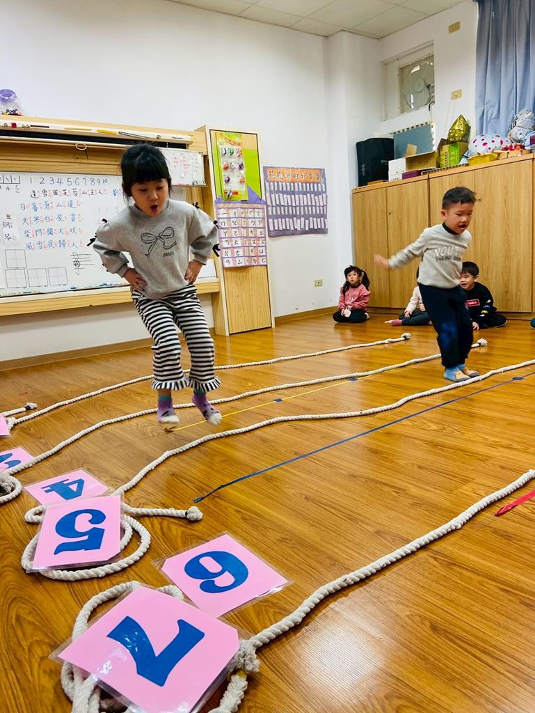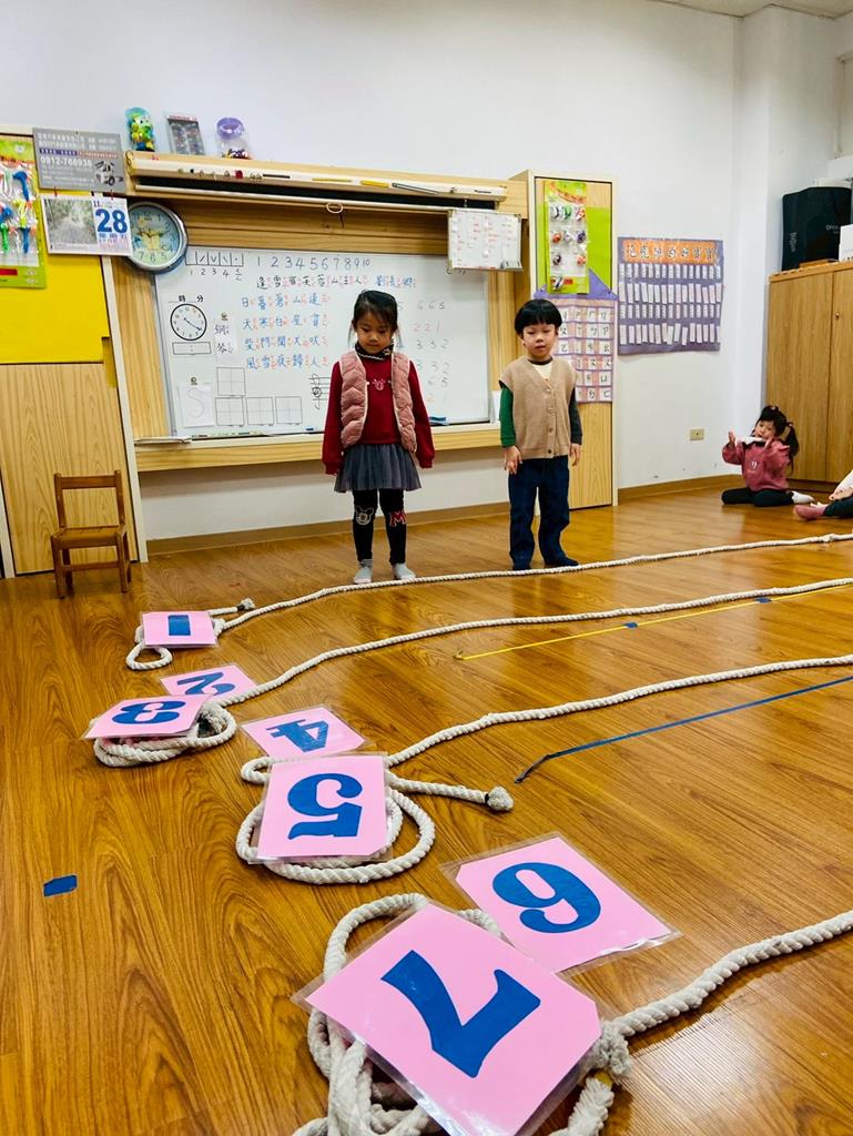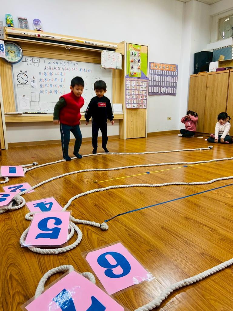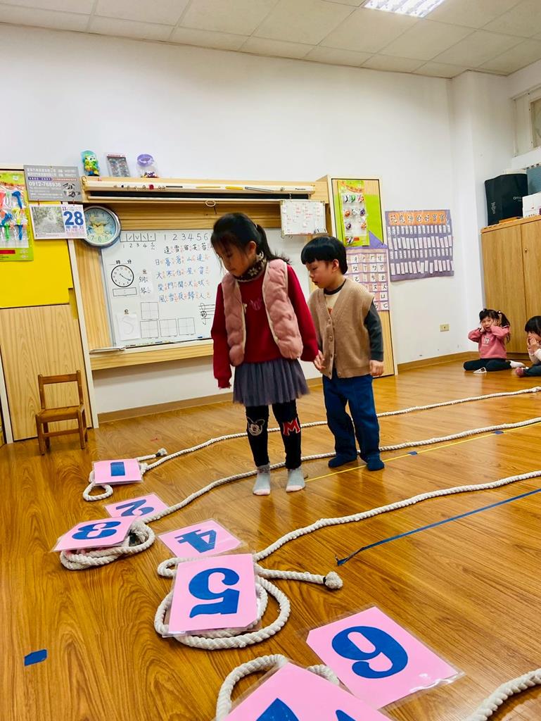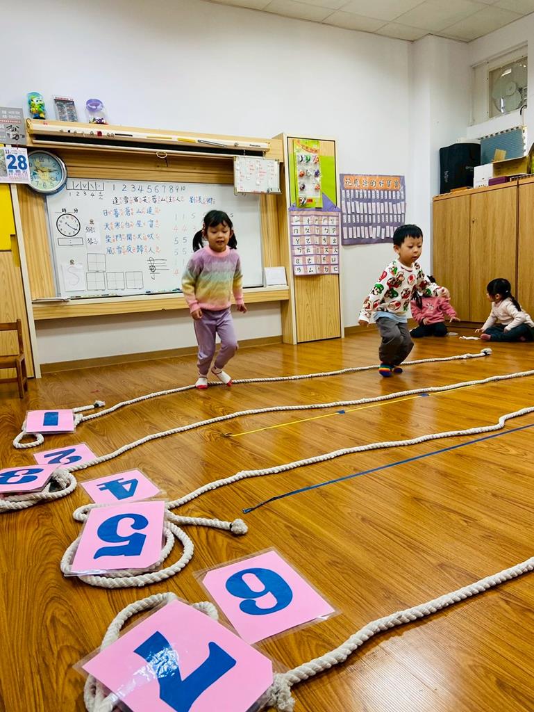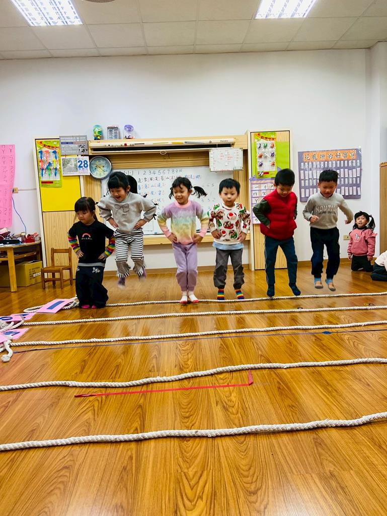 老師用繩子排成5線譜的形狀與孩子進行好玩的音樂遊戲