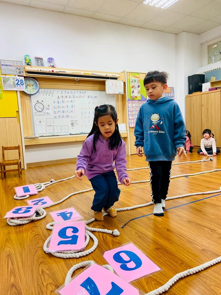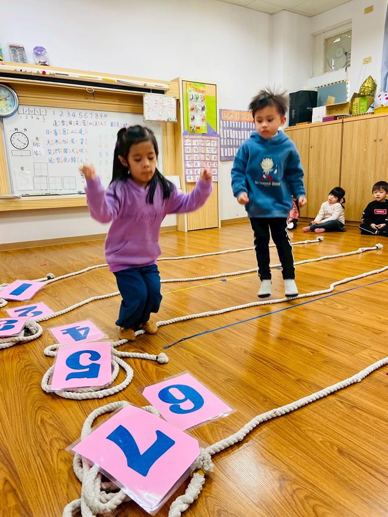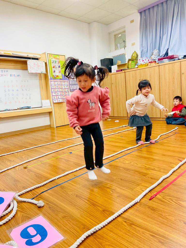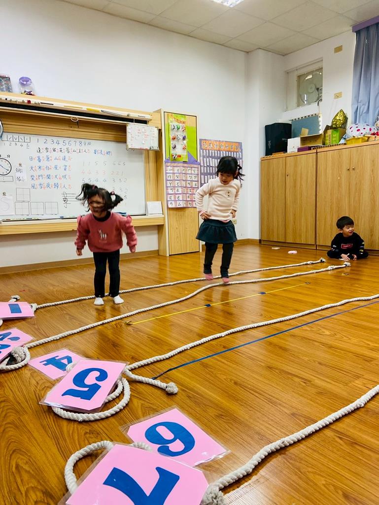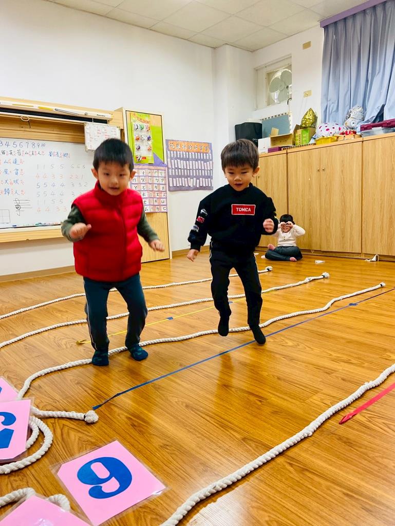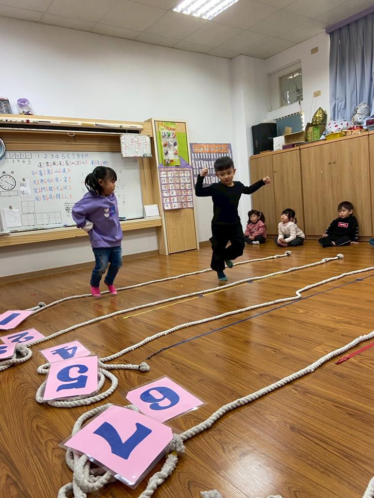 老師用繩子排成5線譜的形狀與孩子進行好玩的音樂遊戲