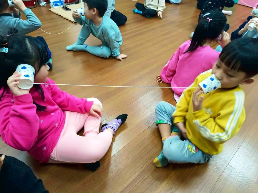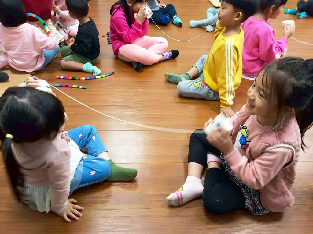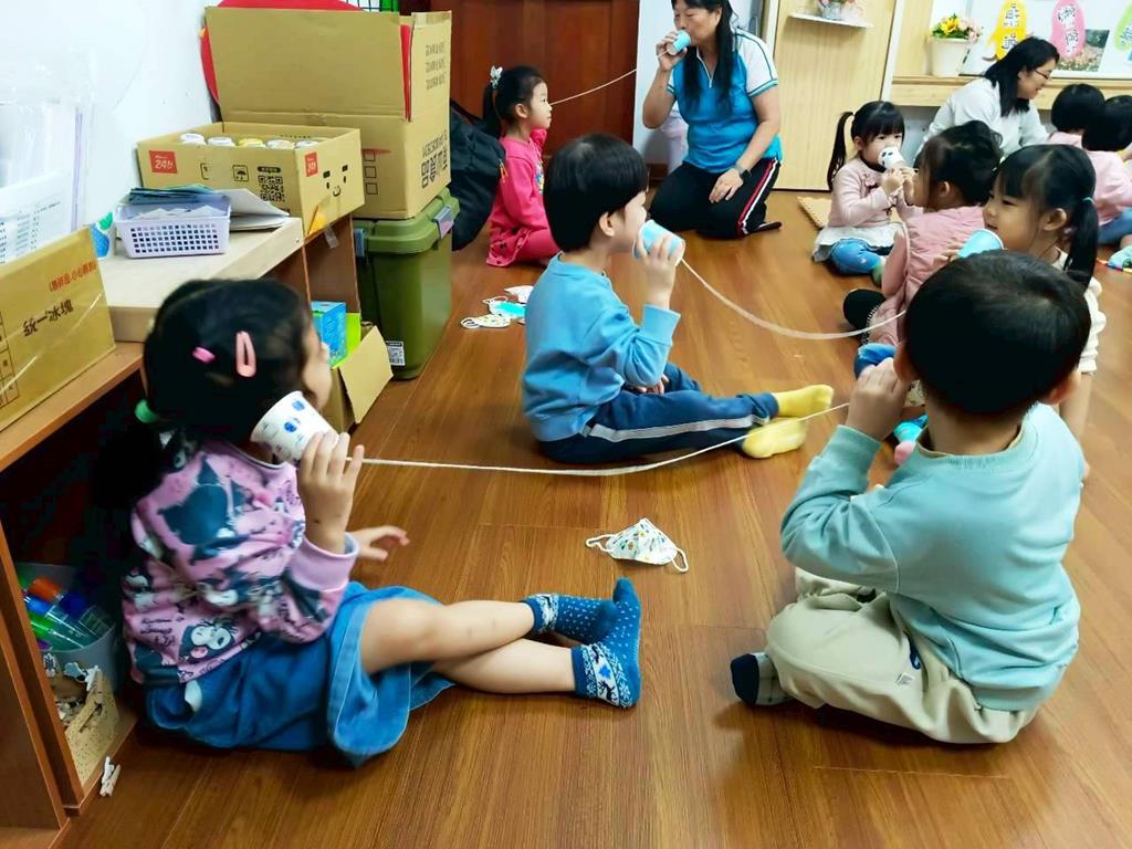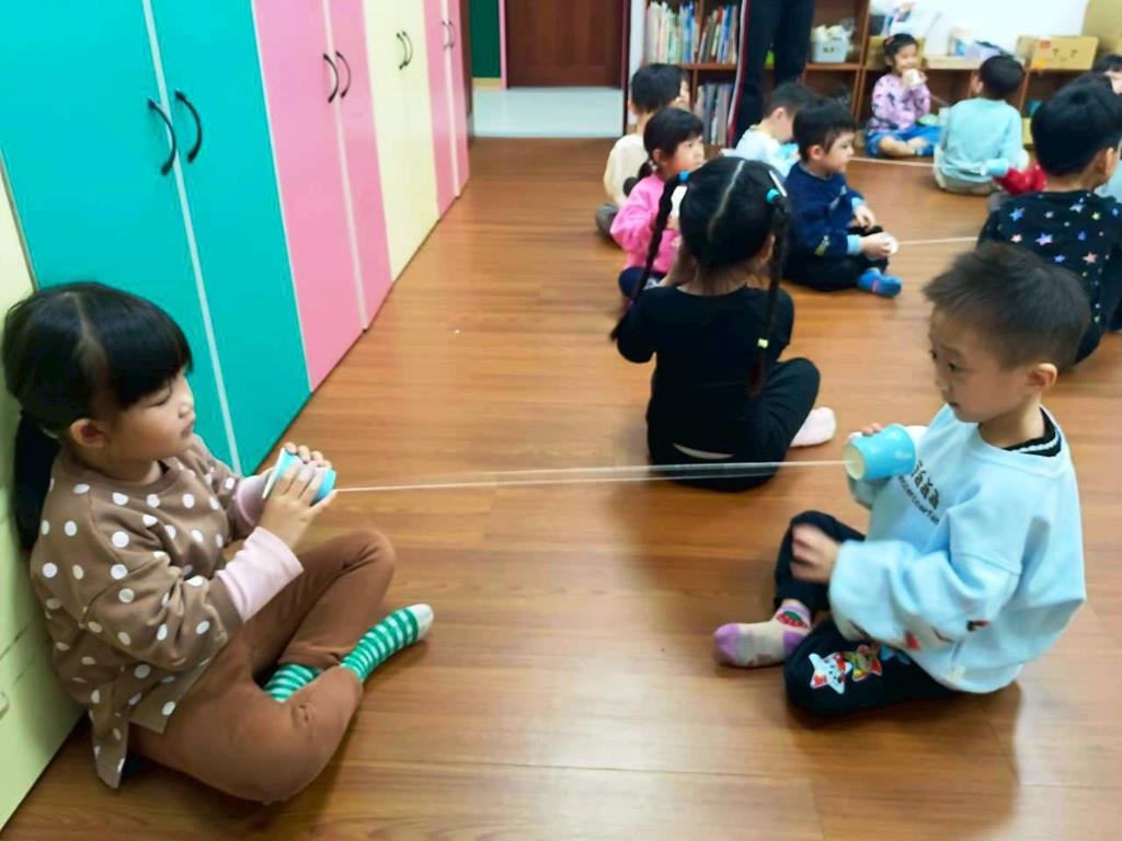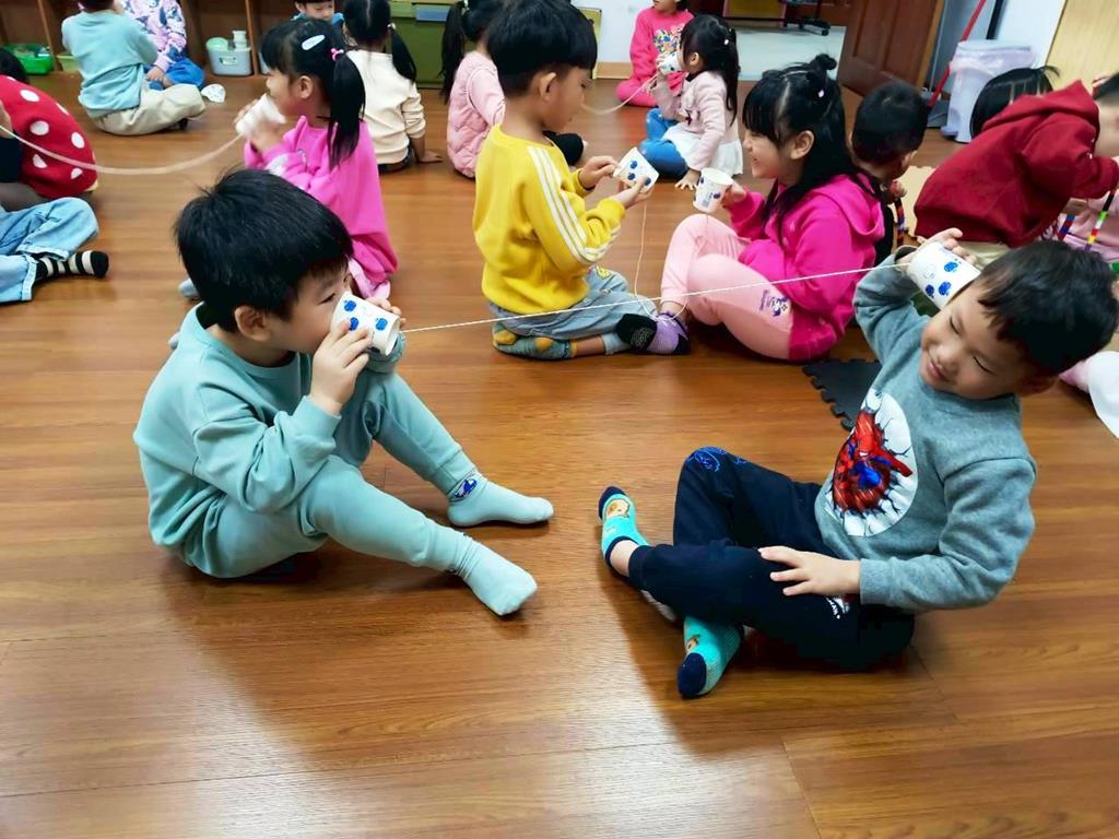 孩子分成兩人一組:一人講、一人聽進行紙杯電話活動—悄悄話傳給你