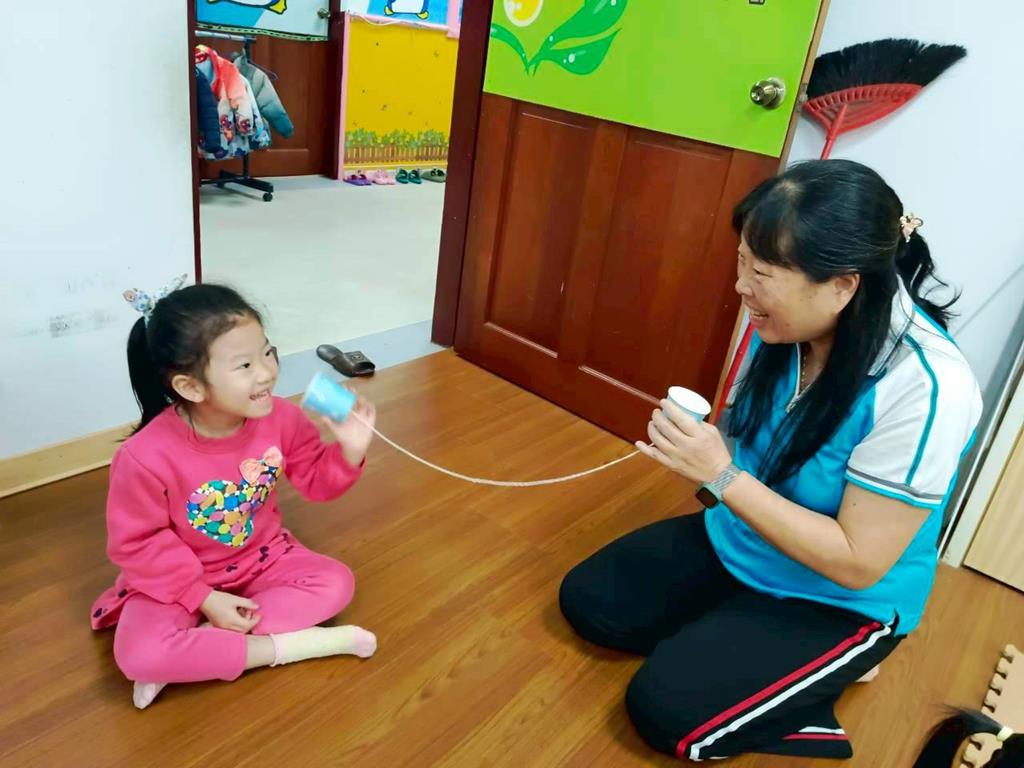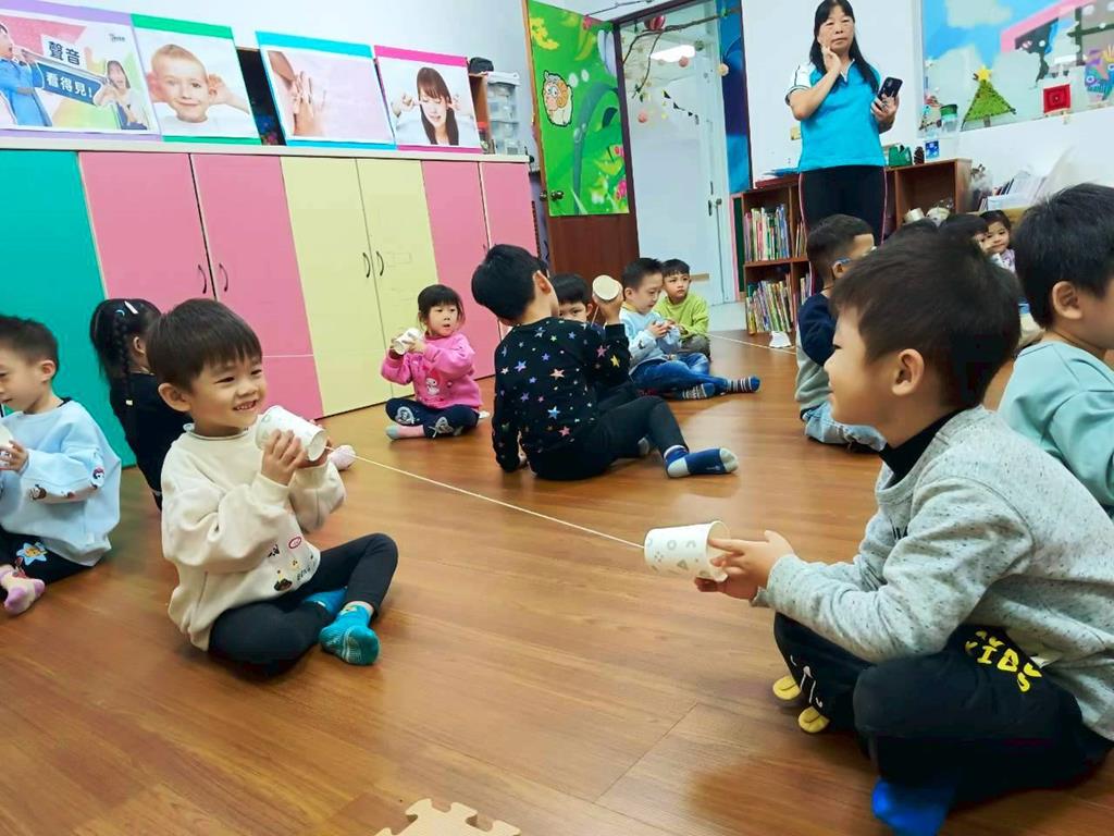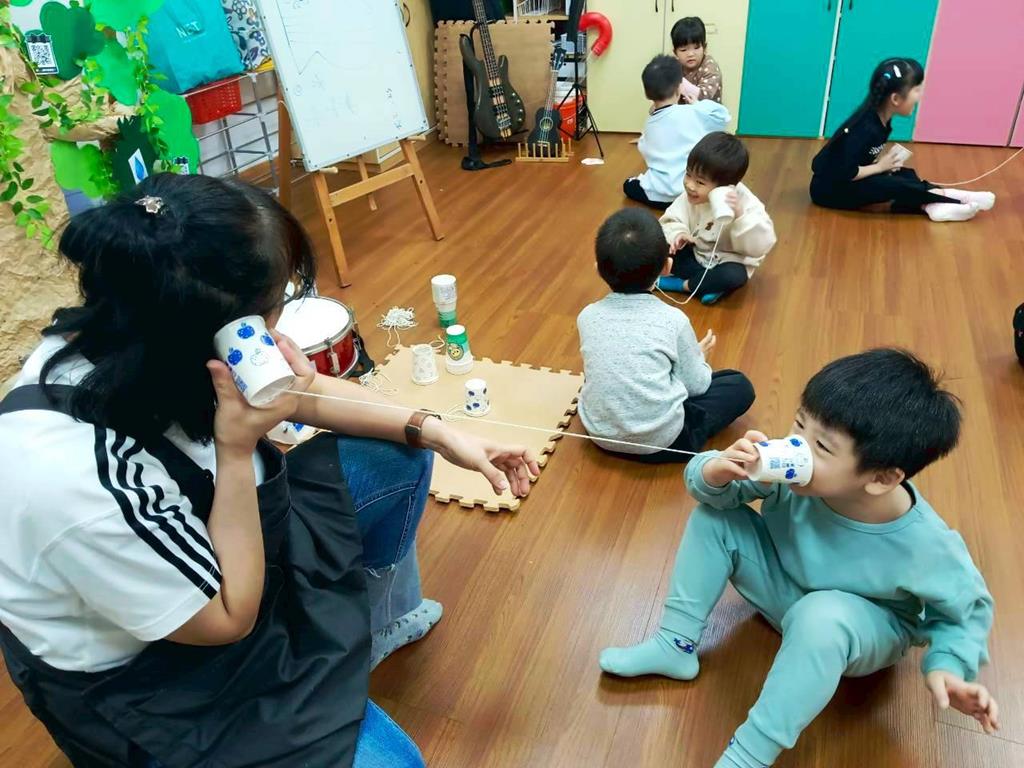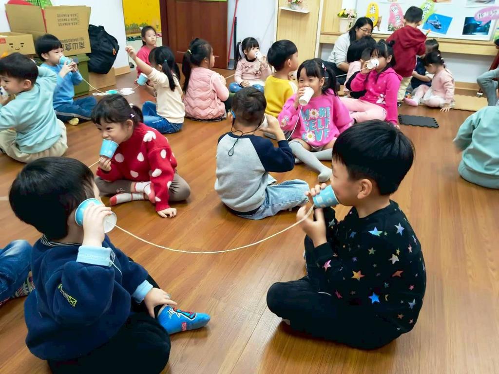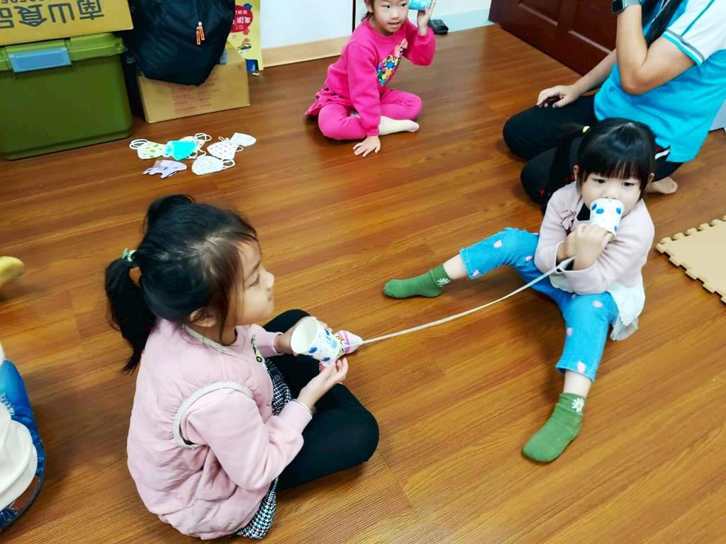 孩子分成兩人一組:一人講、一人聽進行紙杯電話活動—悄悄話傳給你