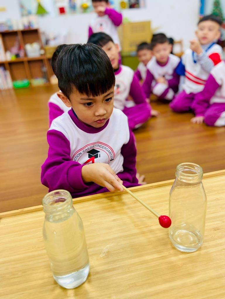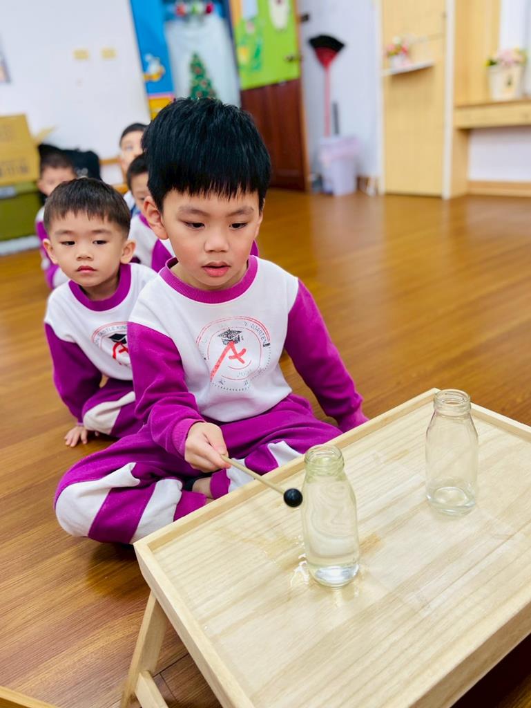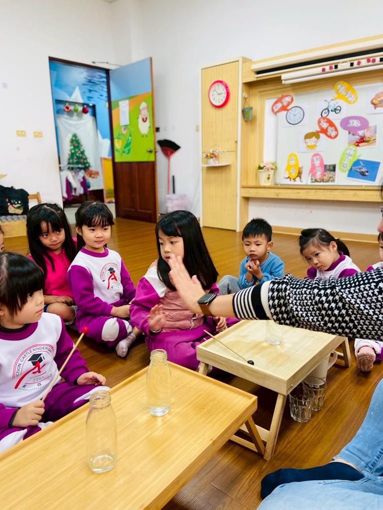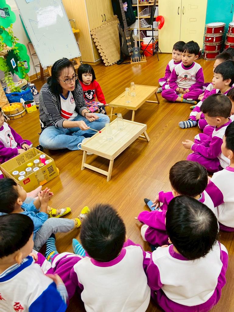 老師敲兩個水量不同的杯子,詢問:「你們覺得這兩個杯子發出的聲音有一樣嗎?」並進行分組操作,邀請孩子自己來敲敲看