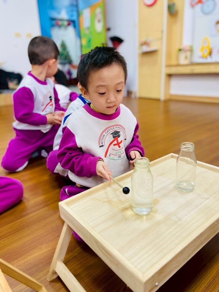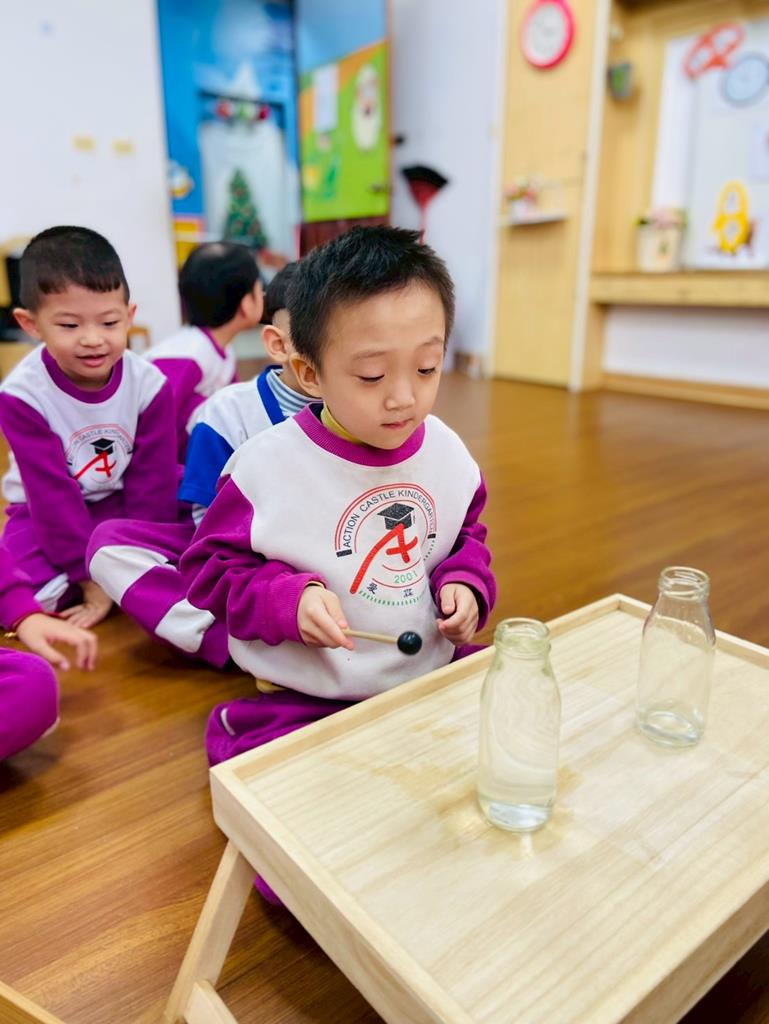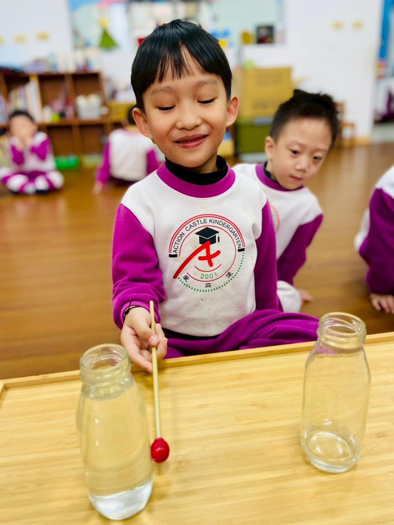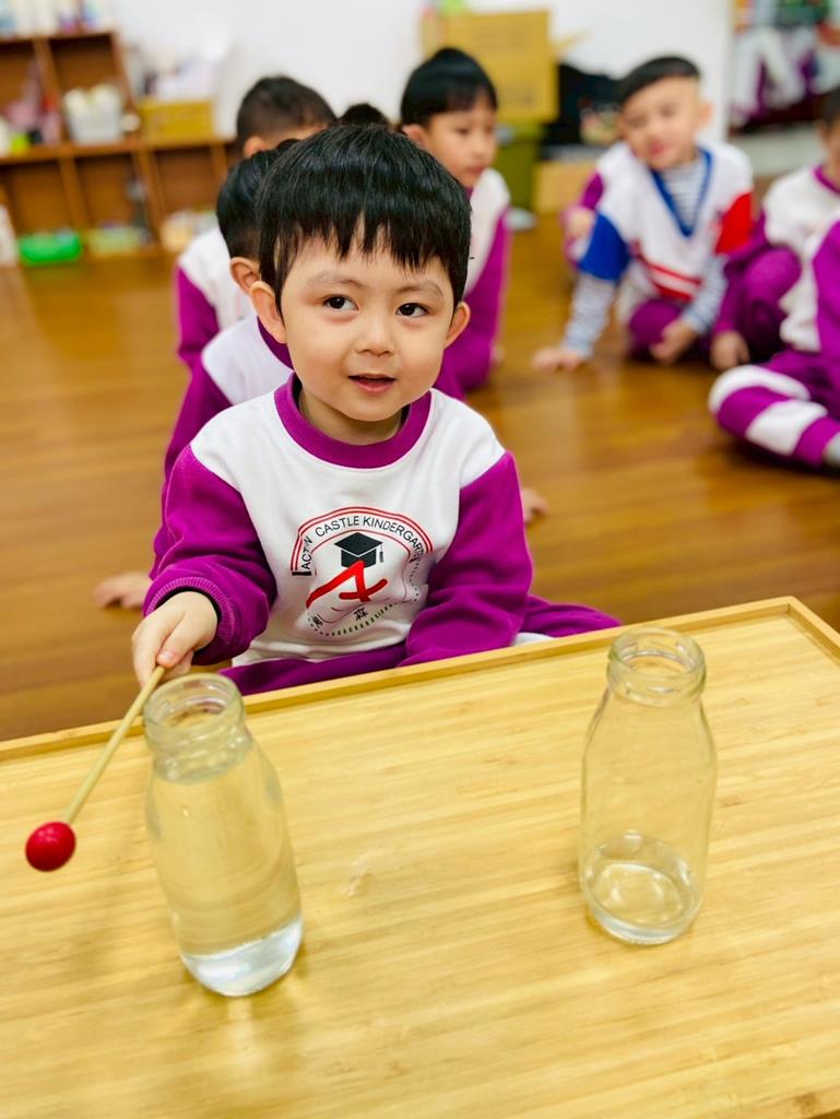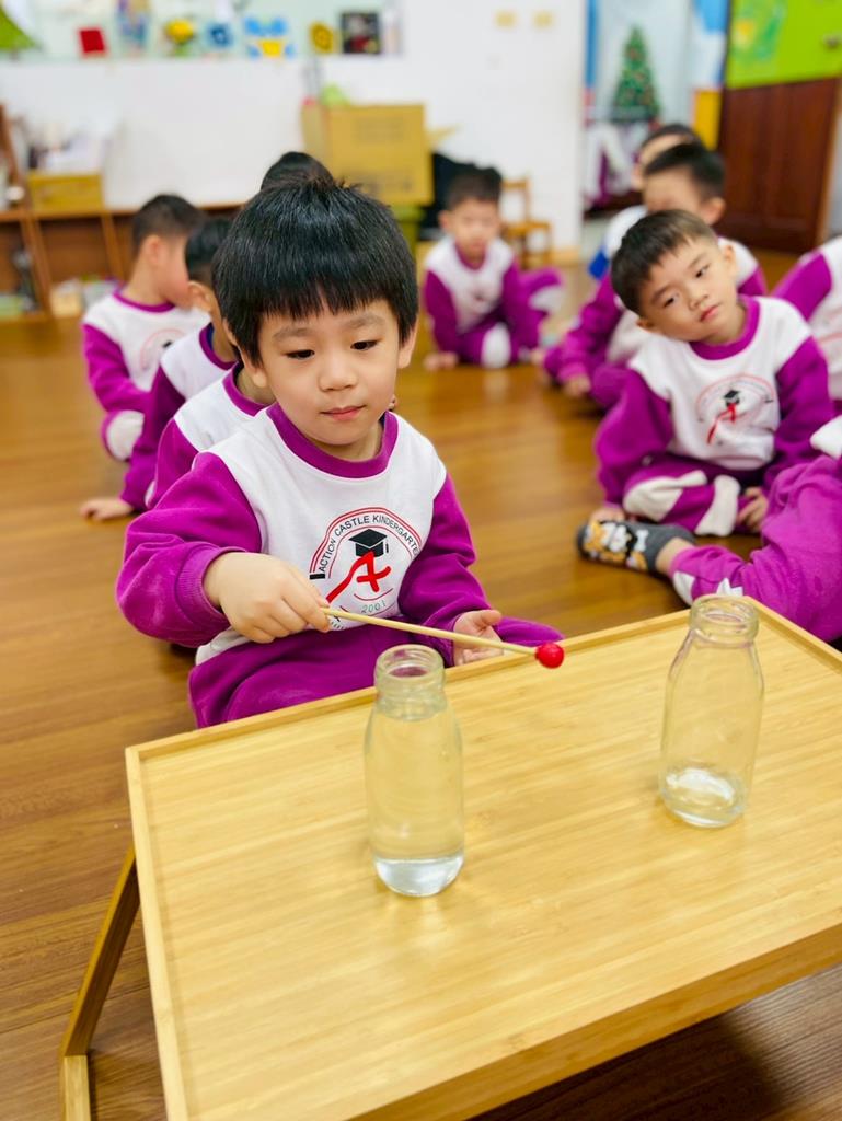 老師敲兩個水量不同的杯子,詢問:「你們覺得這兩個杯子發出的聲音有一樣嗎?」並進行分組操作,邀請孩子自己來敲敲看