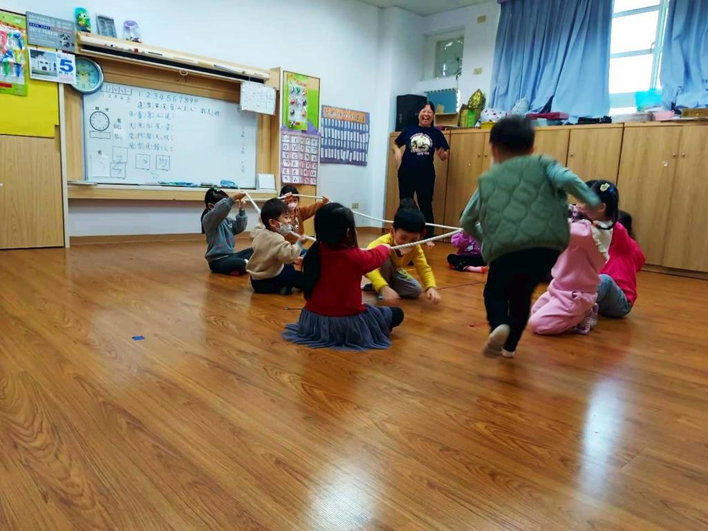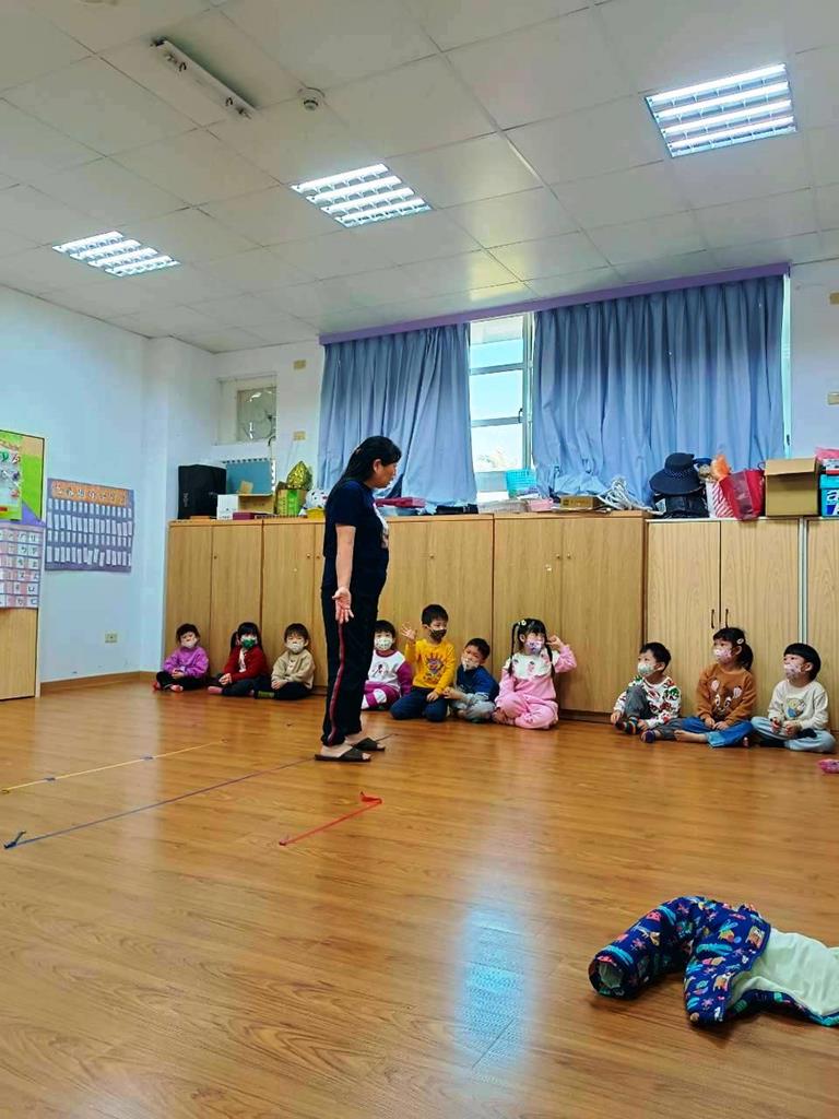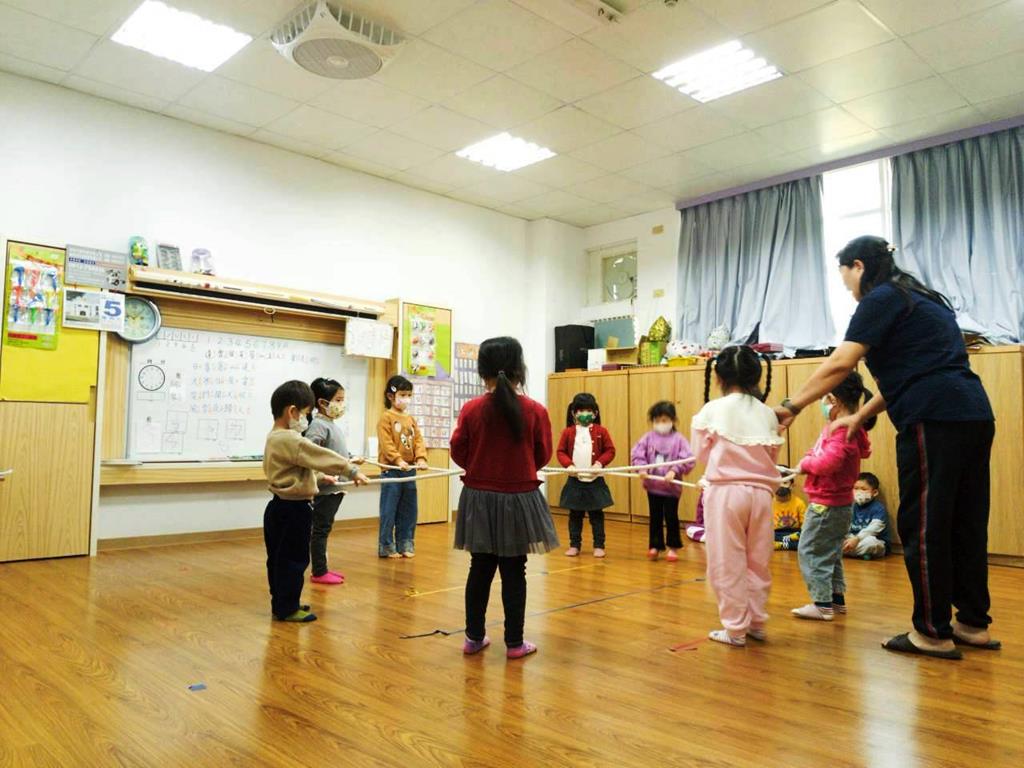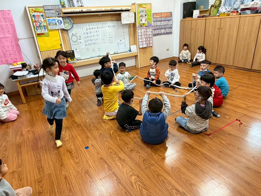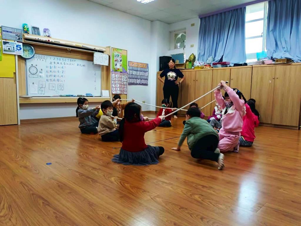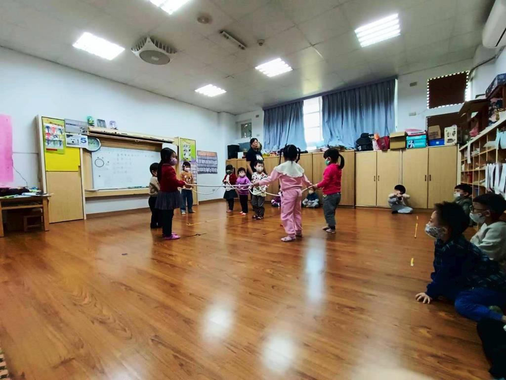 幼兒手拉手圍成大圈做外圈,老師邀請一位孩子當貓、一位當老鼠進到內圈進行方向應對的遊戲