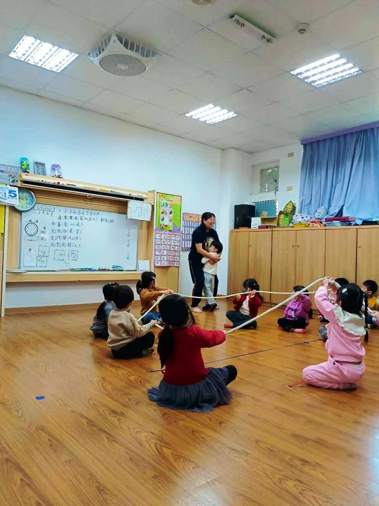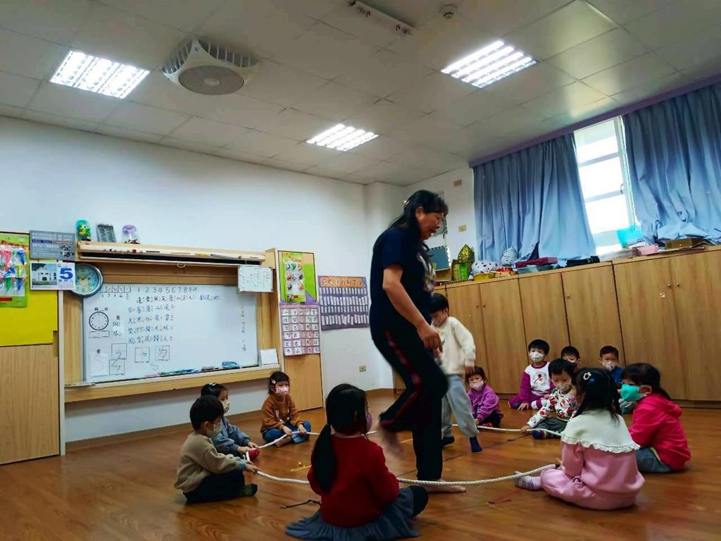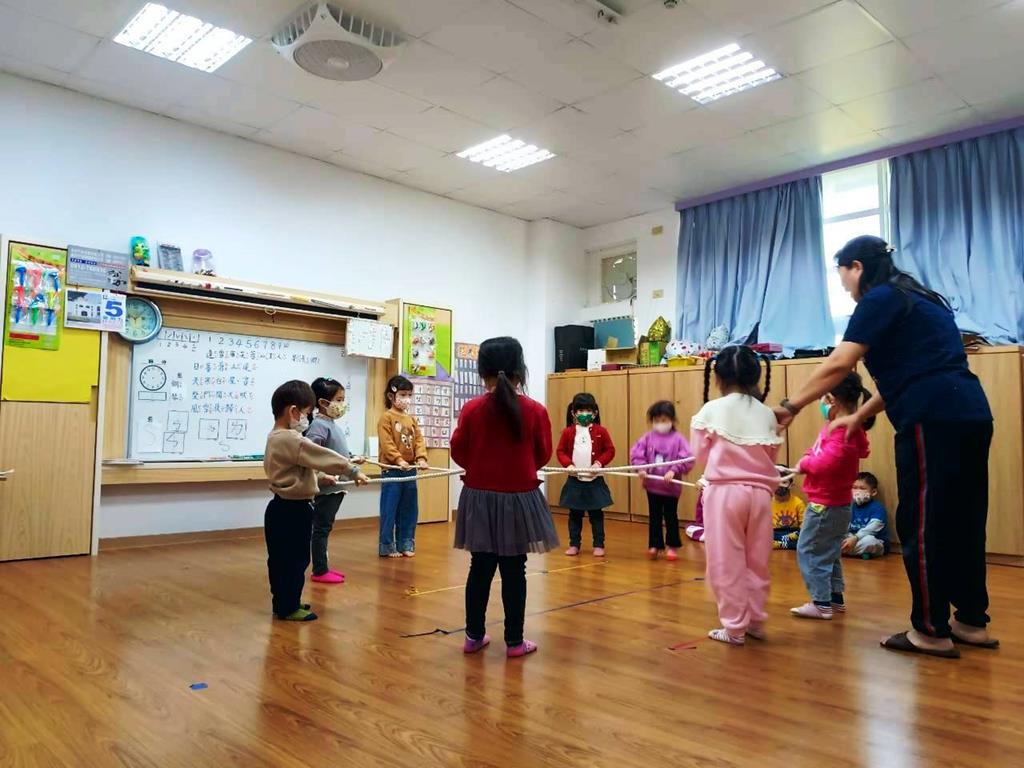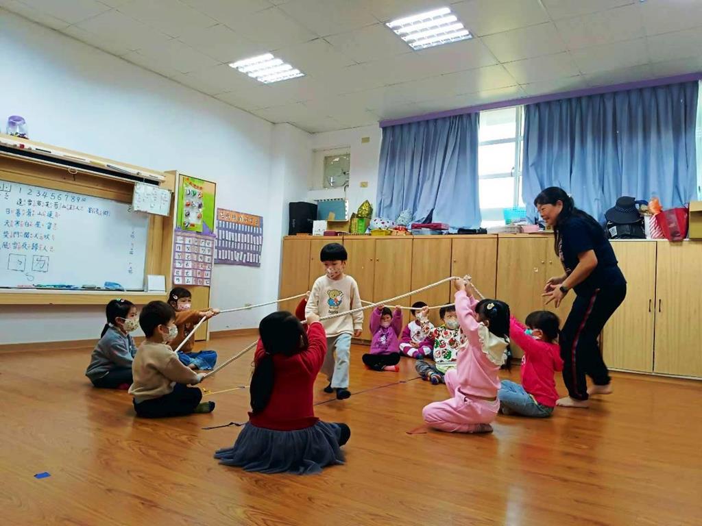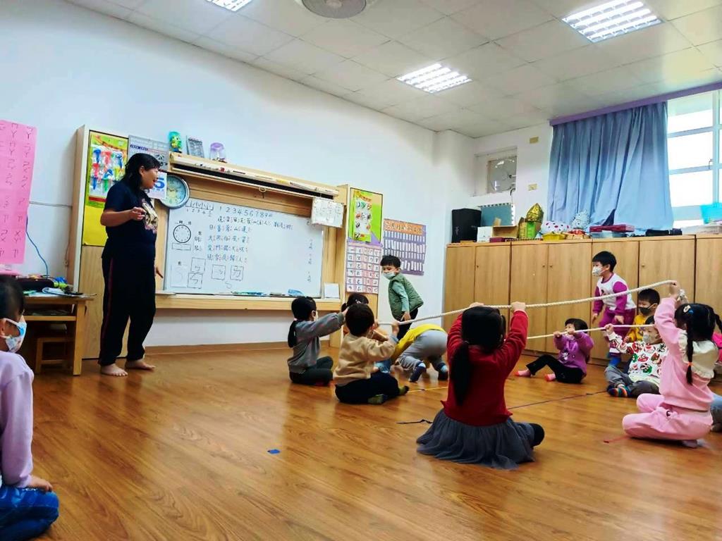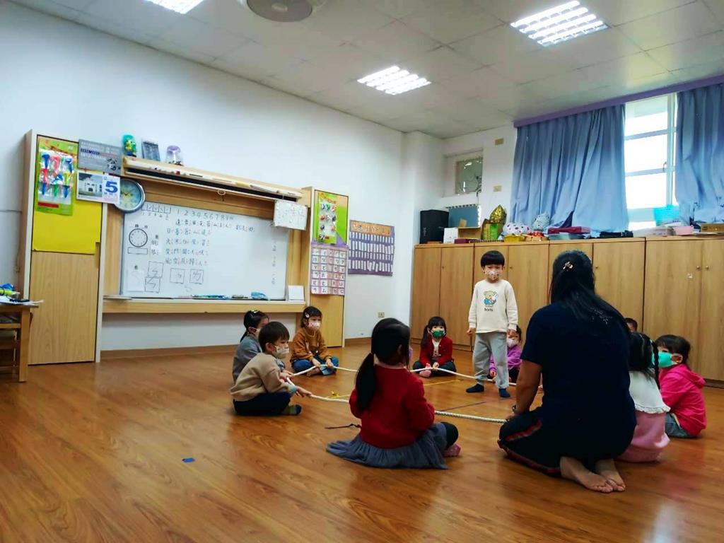 幼兒手拉手圍成大圈做外圈,老師邀請一位孩子當貓、一位當老鼠進到內圈進行方向應對的遊戲