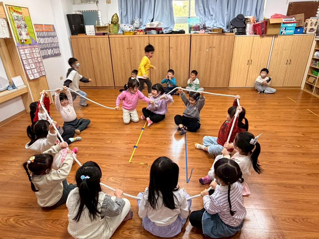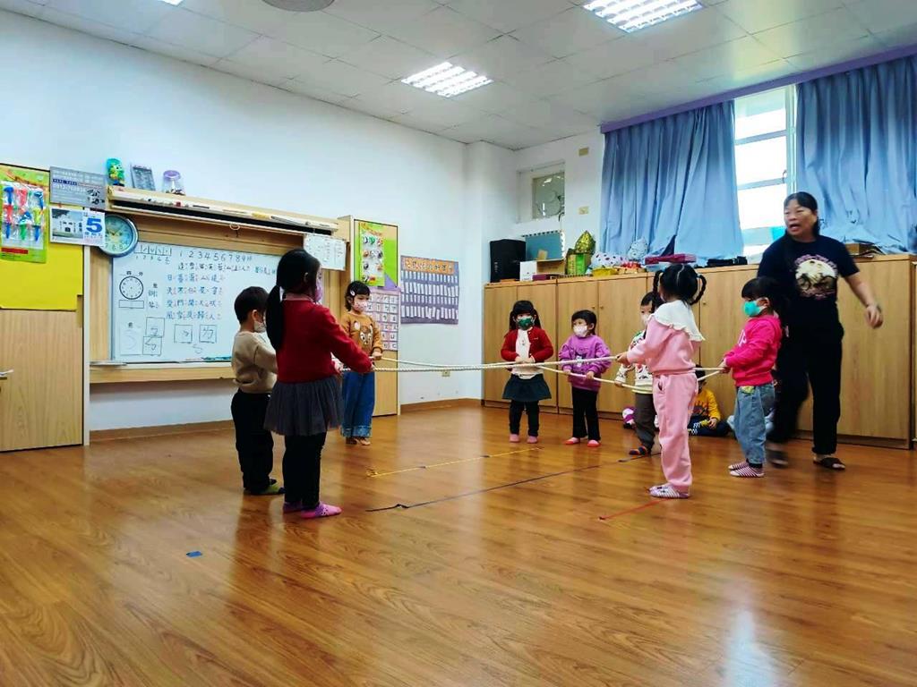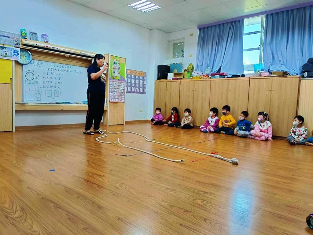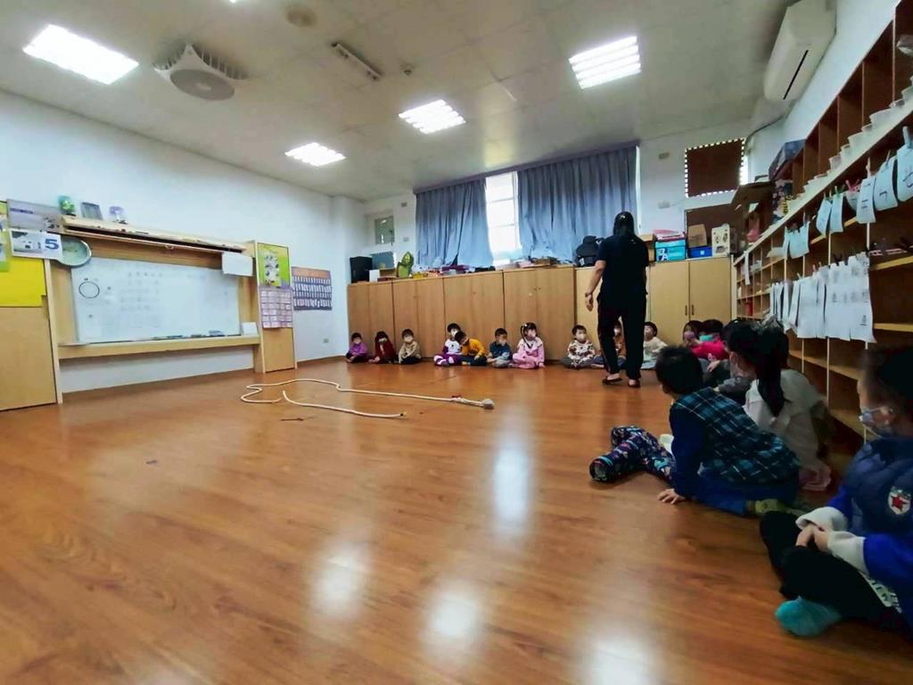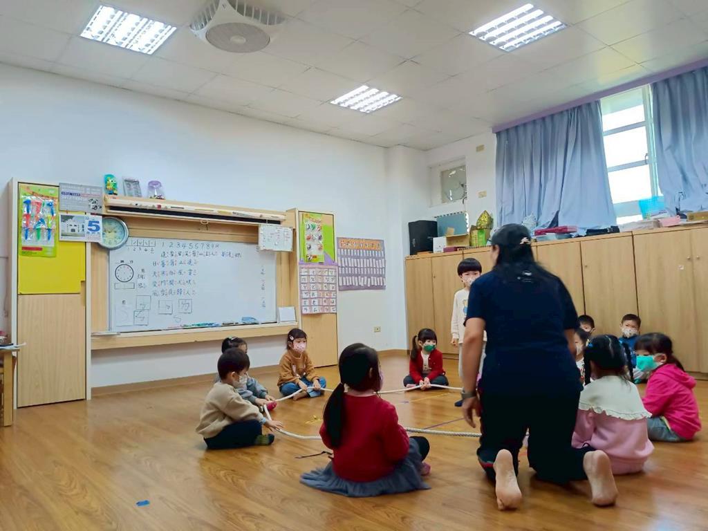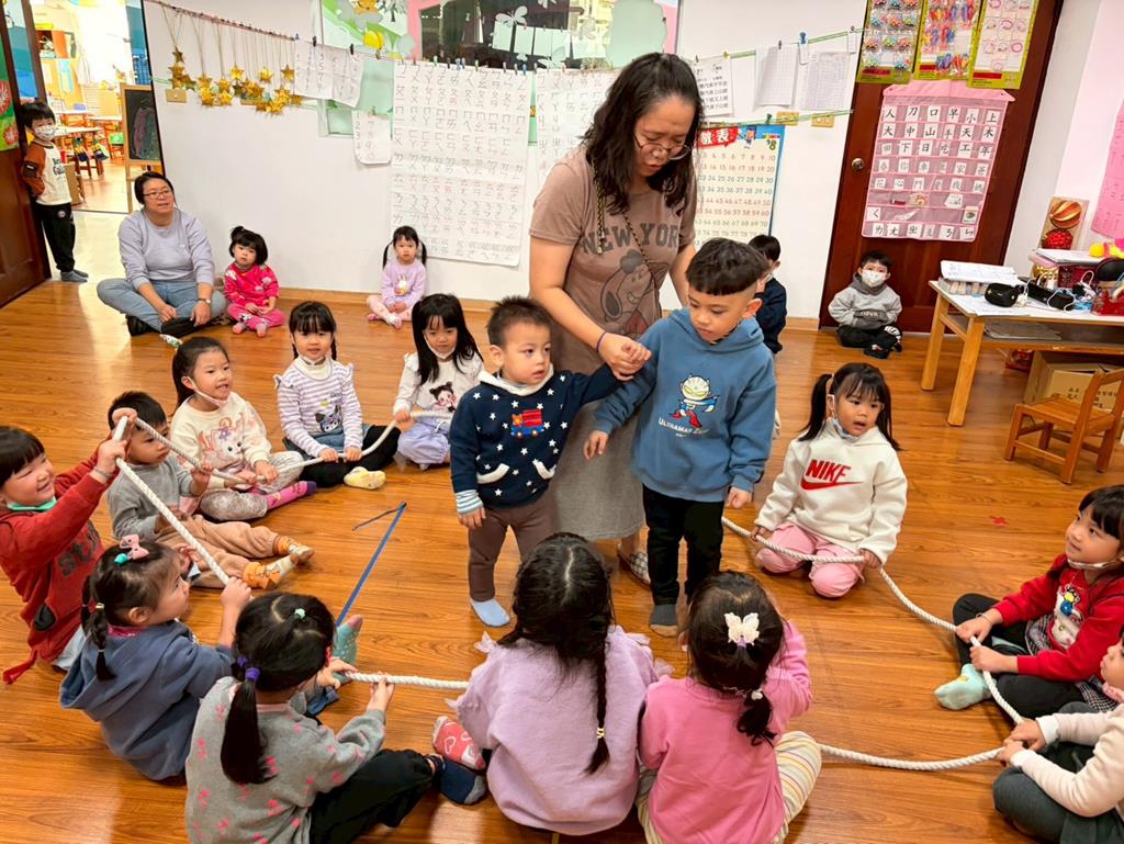 幼兒手拉手圍成大圈做外圈,老師邀請一位孩子當貓、一位當老鼠進到內圈進行方向應對的遊戲