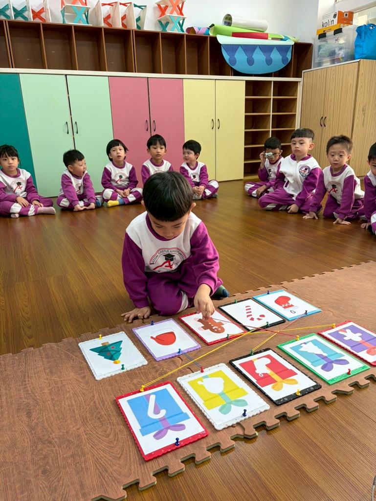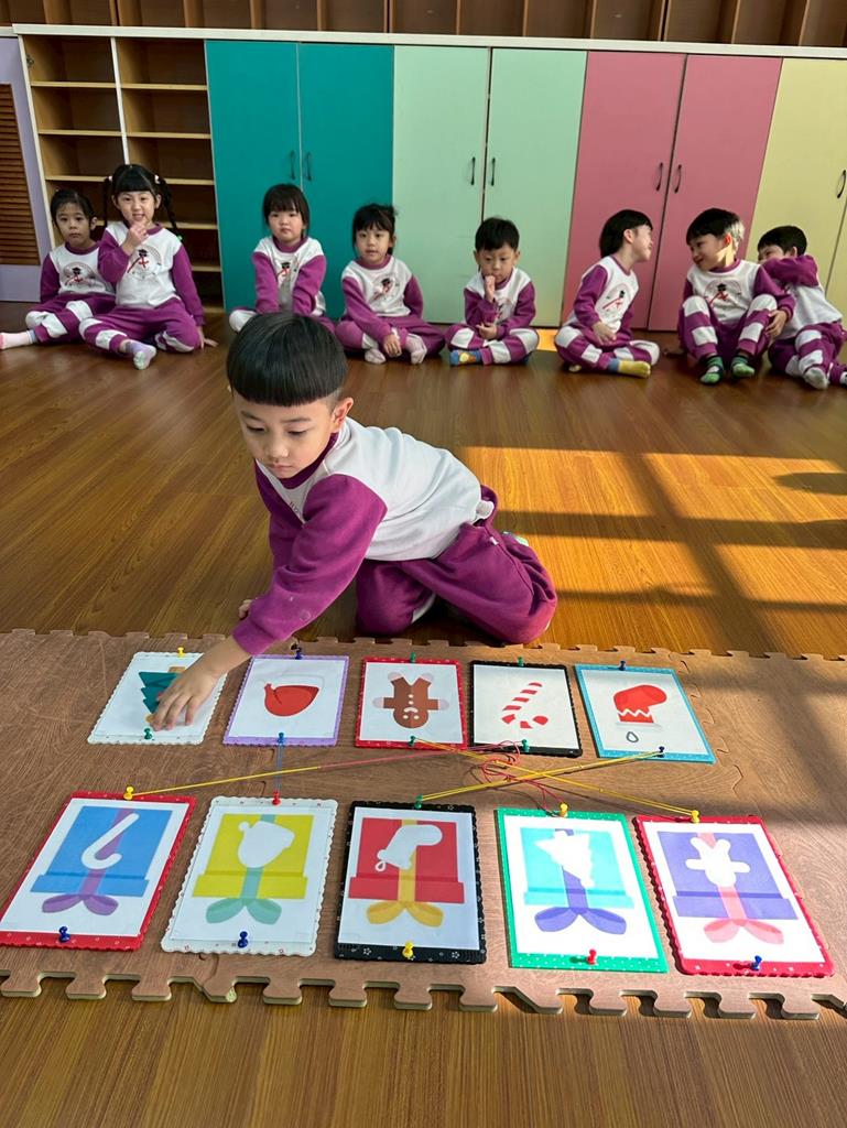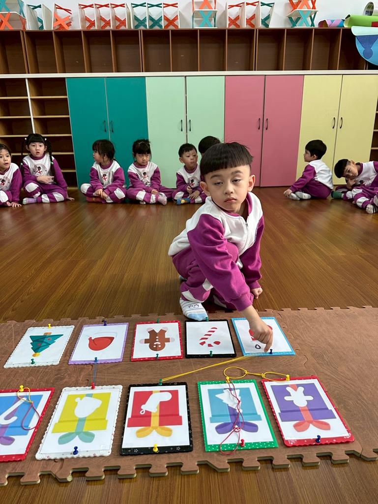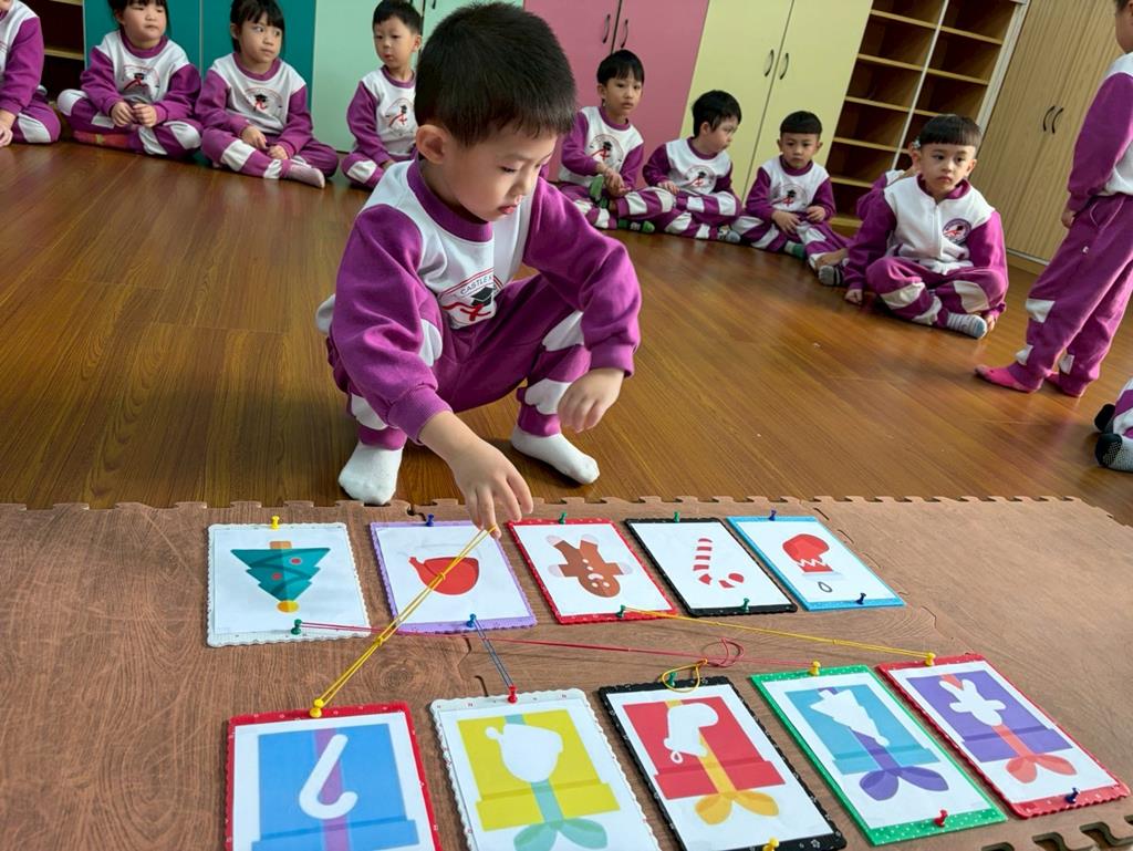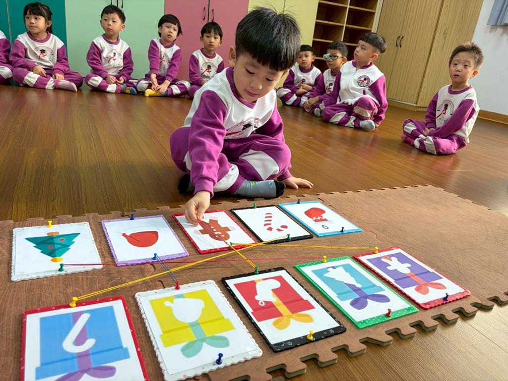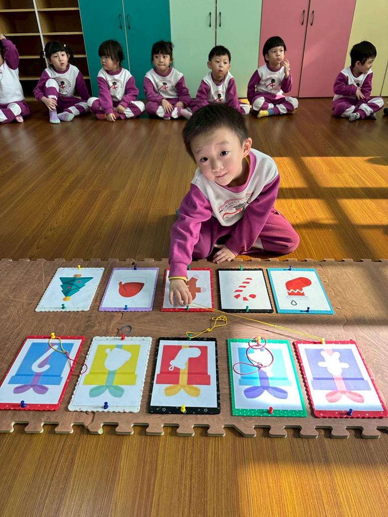 老師帶著孩子觀察上方的禮物盒圖案,孩子依序進行配對,將下方圖案與正確的禮物盒連線 。