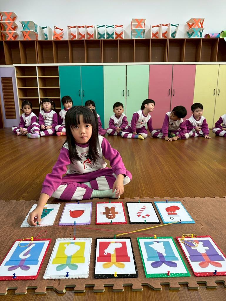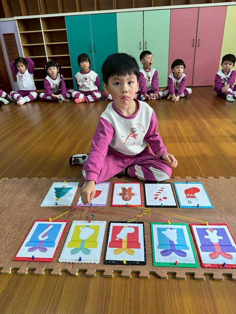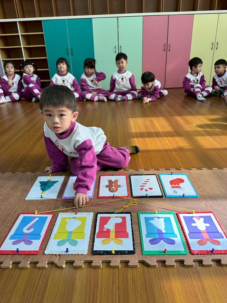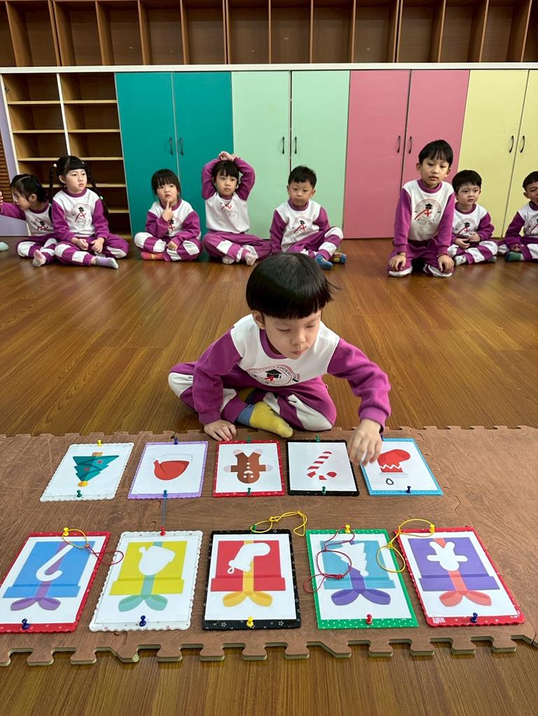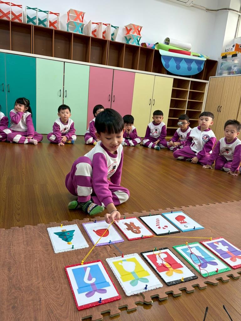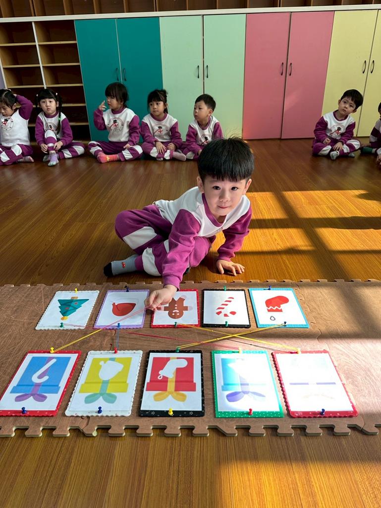 老師帶著孩子觀察上方的禮物盒圖案,孩子依序進行配對,將下方圖案與正確的禮物盒連線 。