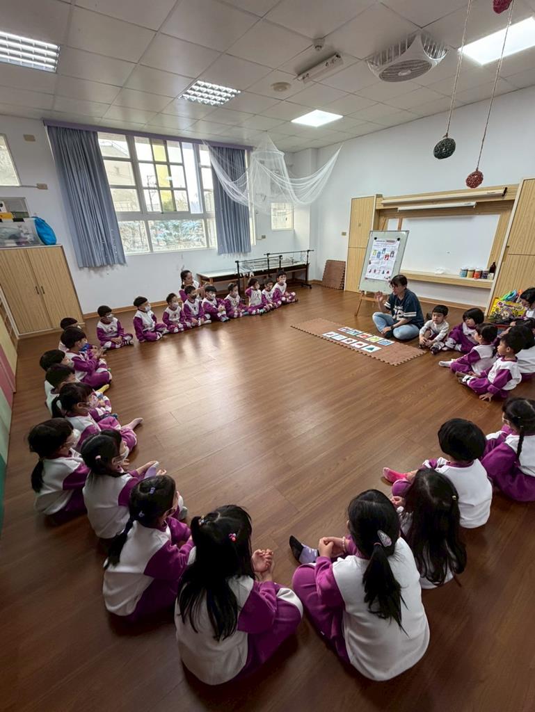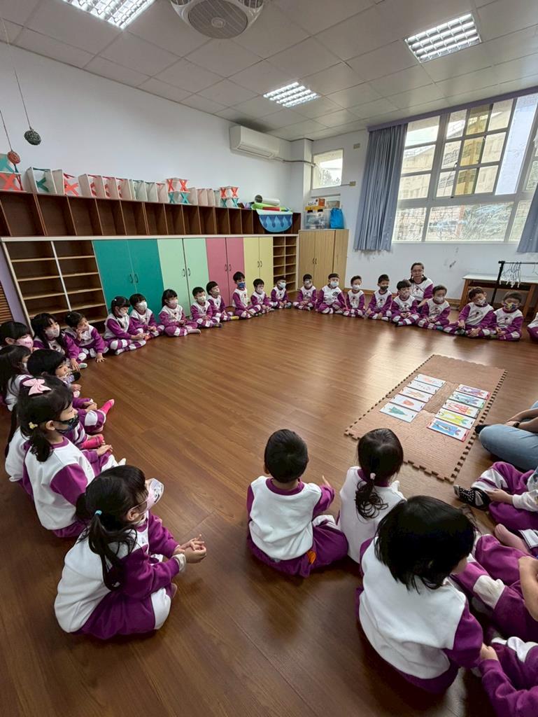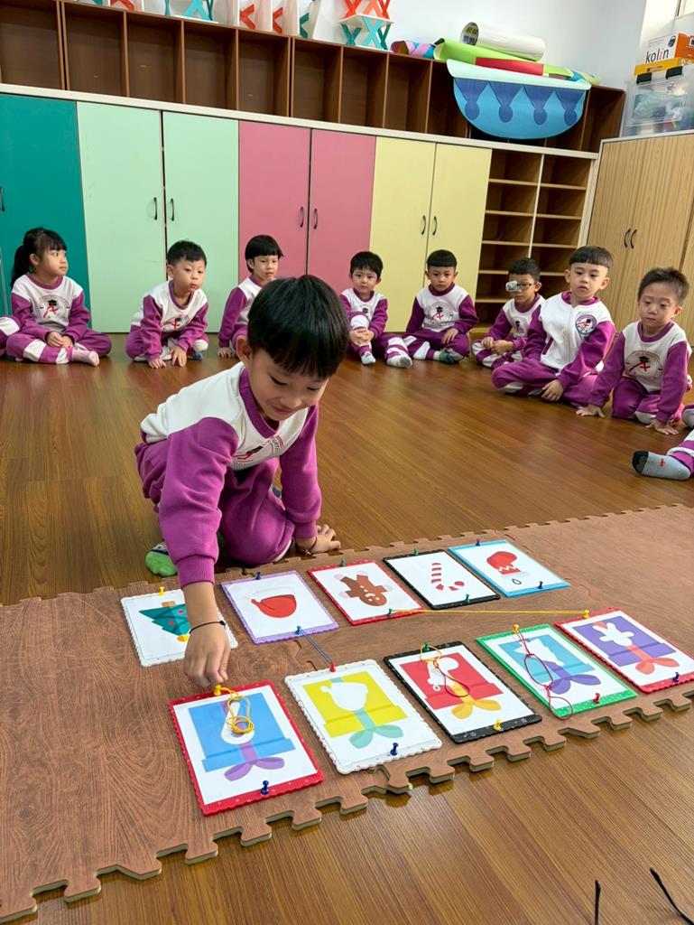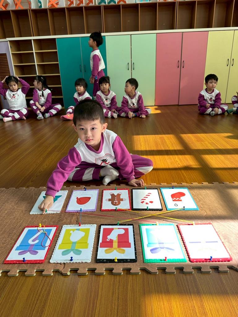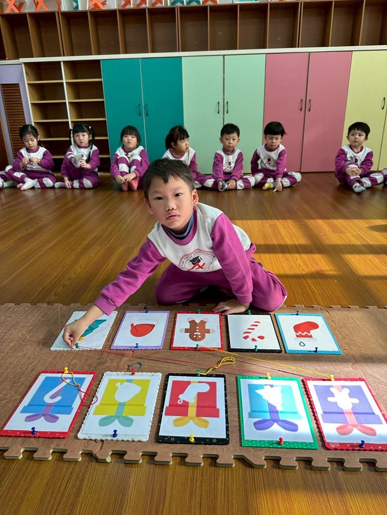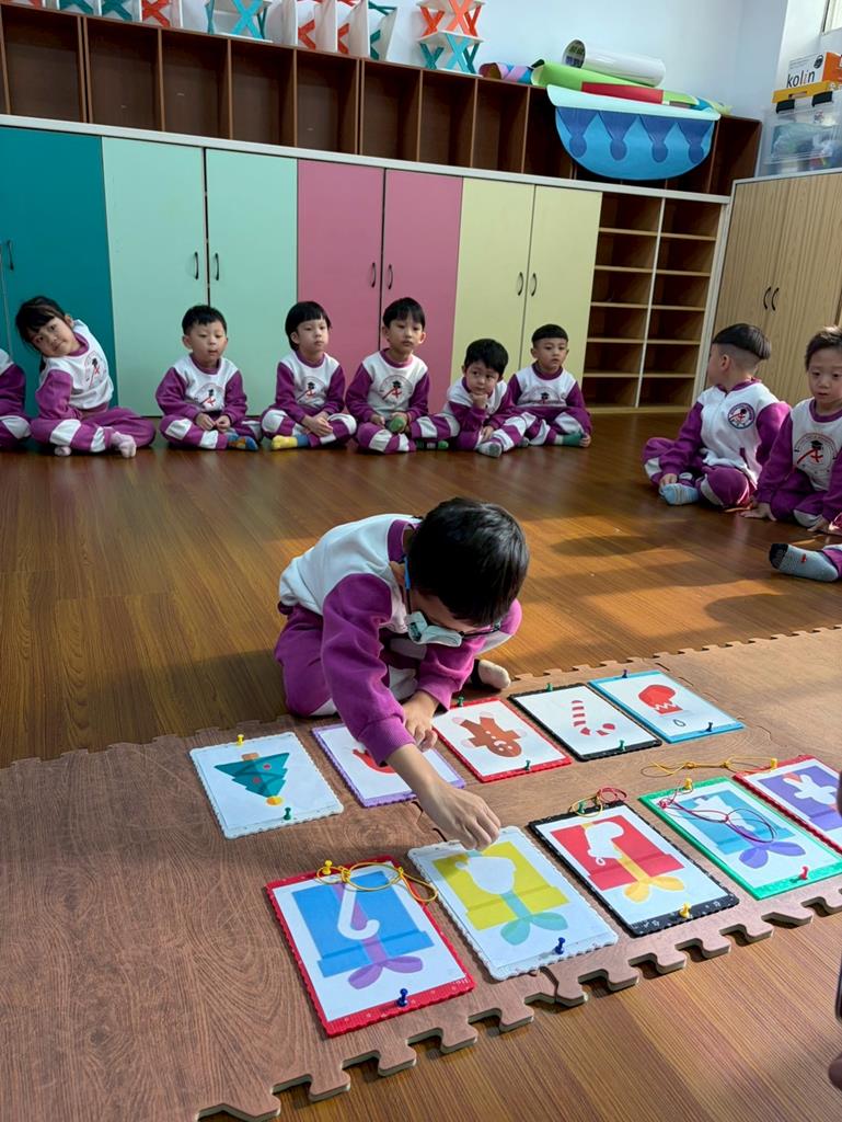 老師帶著孩子觀察上方的禮物盒圖案,孩子依序進行配對,將下方圖案與正確的禮物盒連線 。