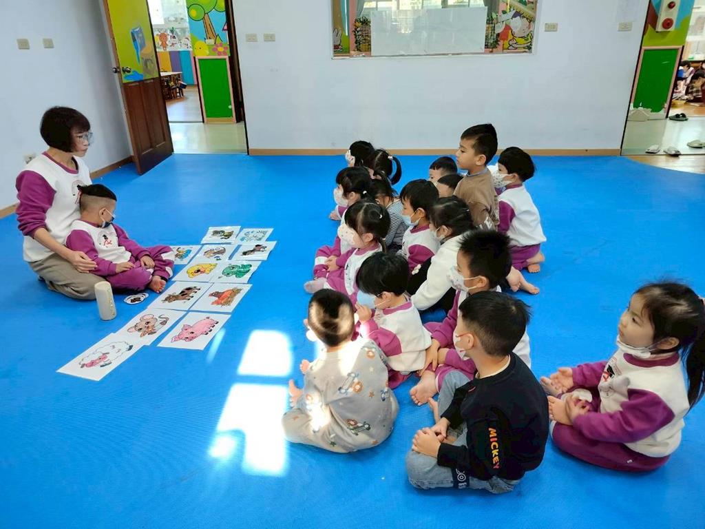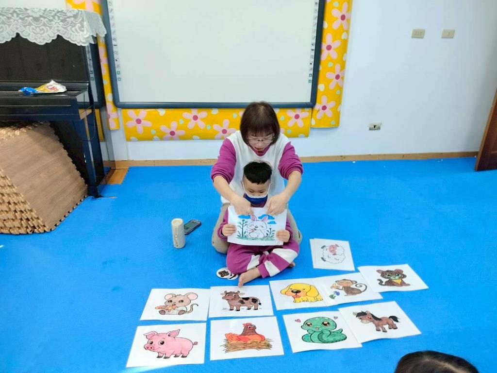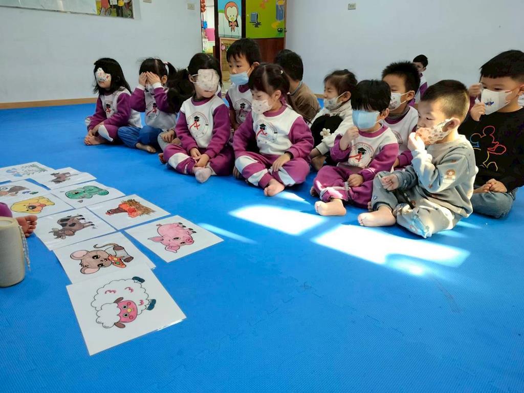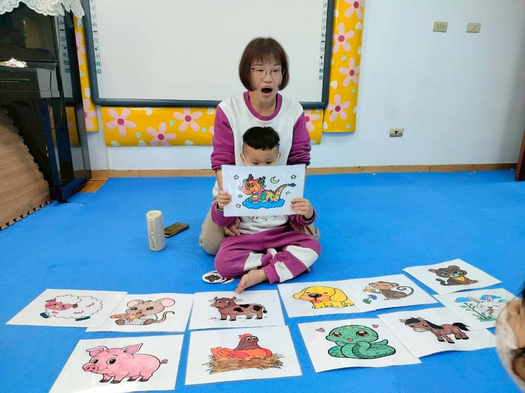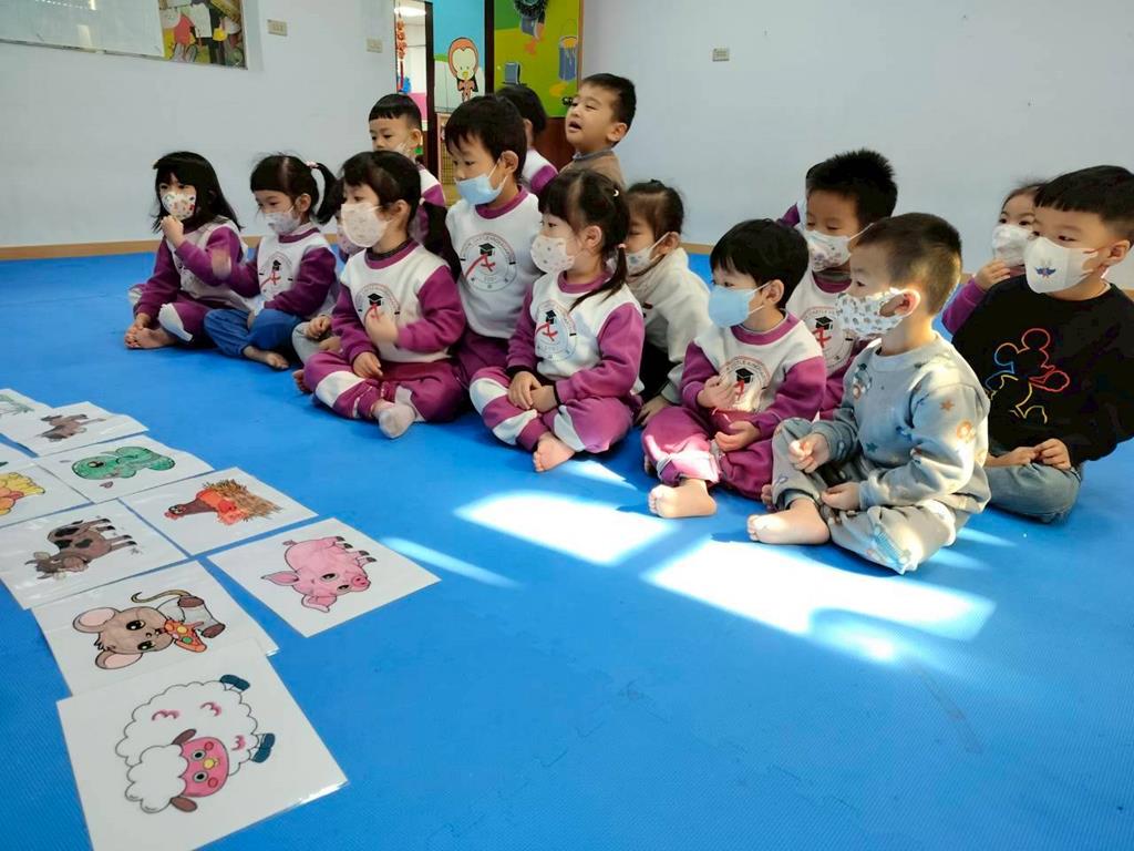 透過故事讓孩子認識十二生肖由來,讓孩子跟著老師說出動物名稱,並模仿叫聲,鼓勵幼兒勇敢表達