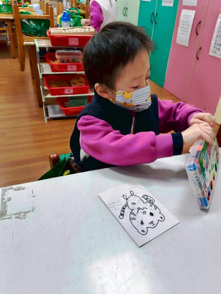 講述故事-「十二生 肖」並請幼兒畫一畫自己喜歡的生肖,製作成生肖頭套。