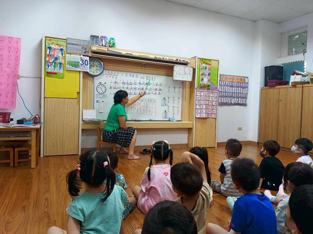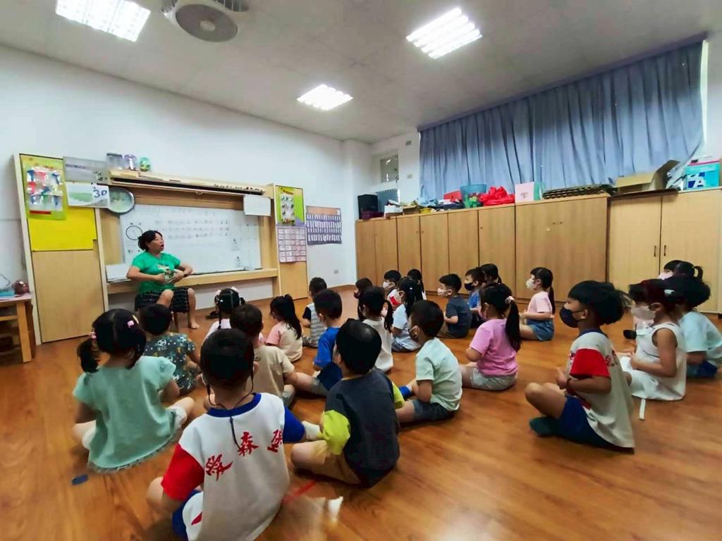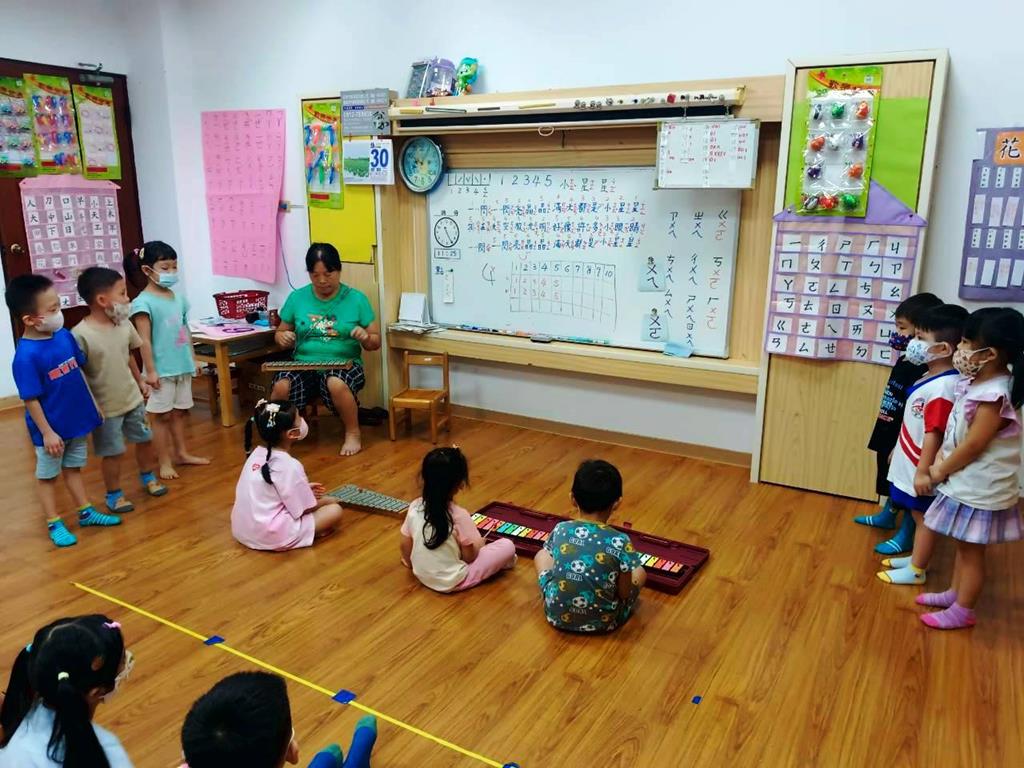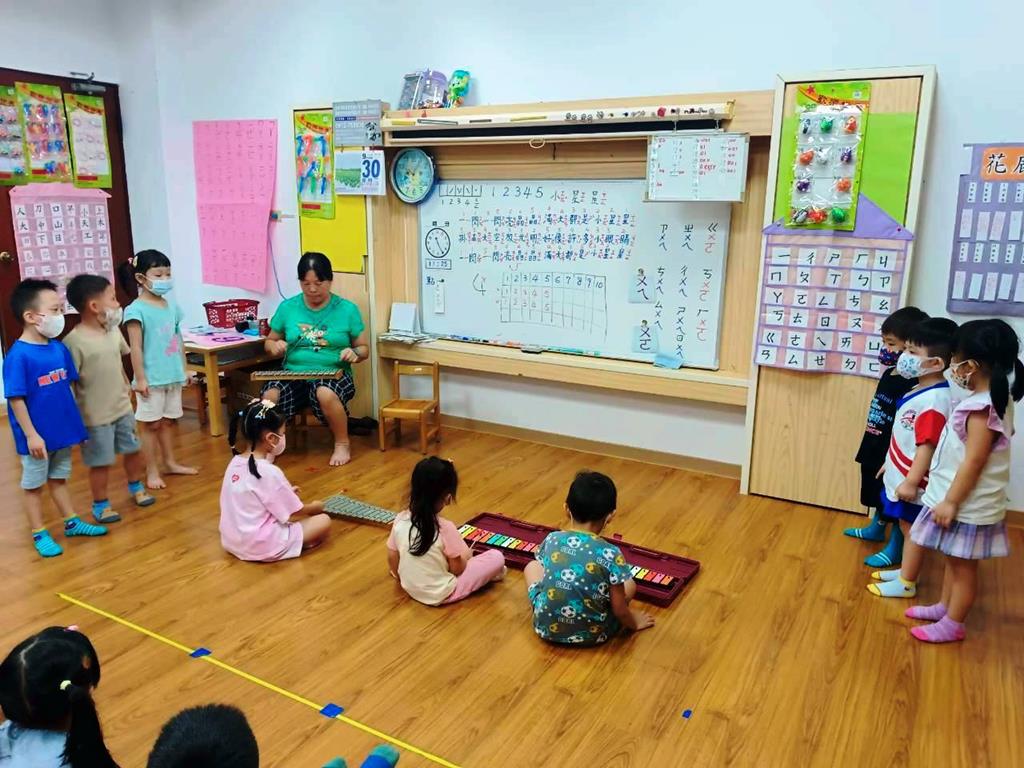 孩子分為「唱歌組」與「打擊樂組」兩組,「唱歌組」唱歌,「打擊樂組」用樂器敲打節奏。