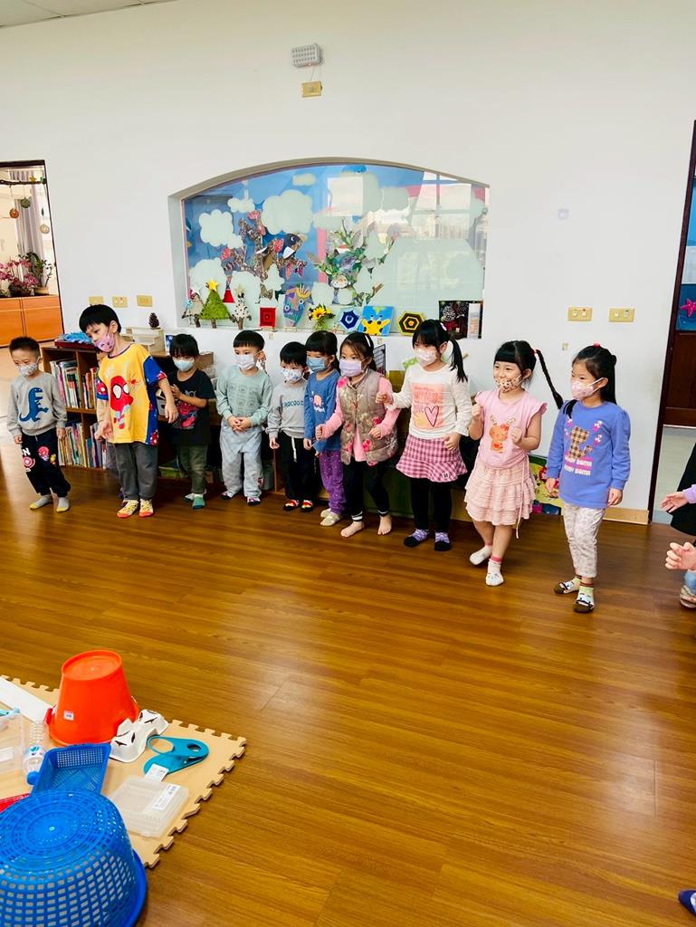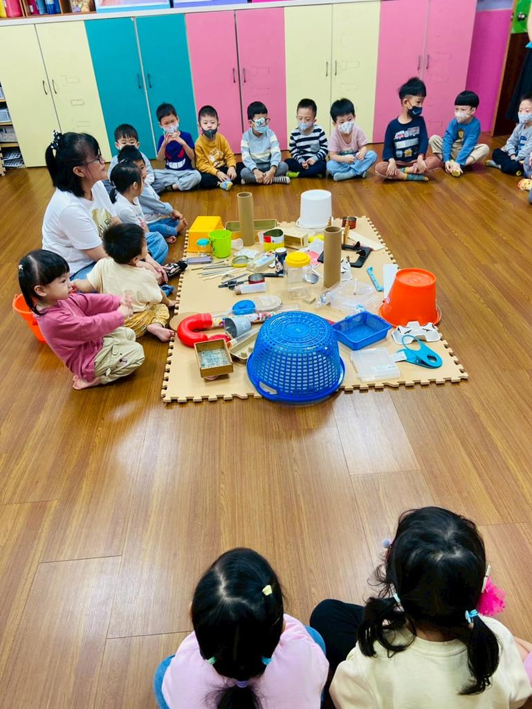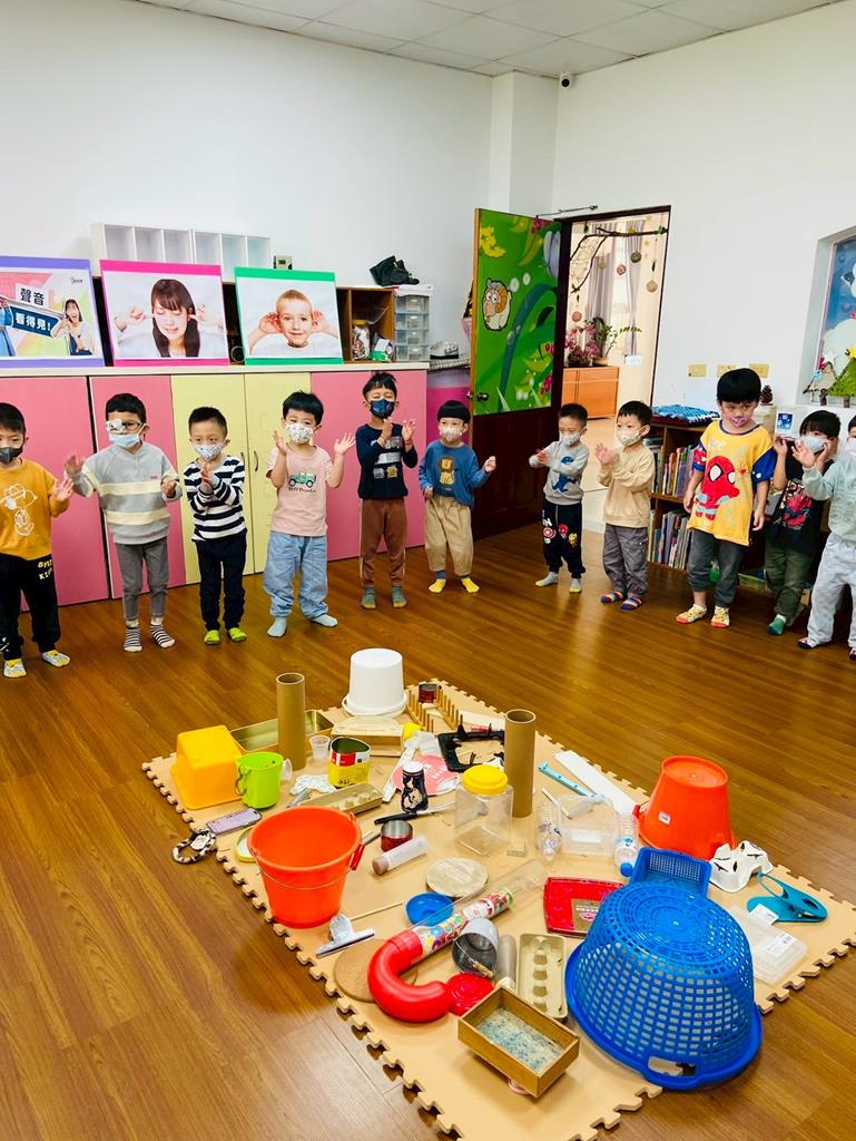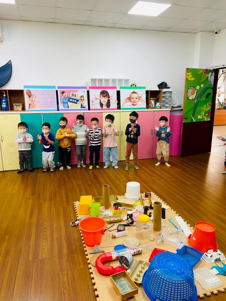 請孩子選擇物品,用「敲、搖、刮」等方式模仿節奏。並進行小組合作創作,分男女小組組成「小小生活樂團」。