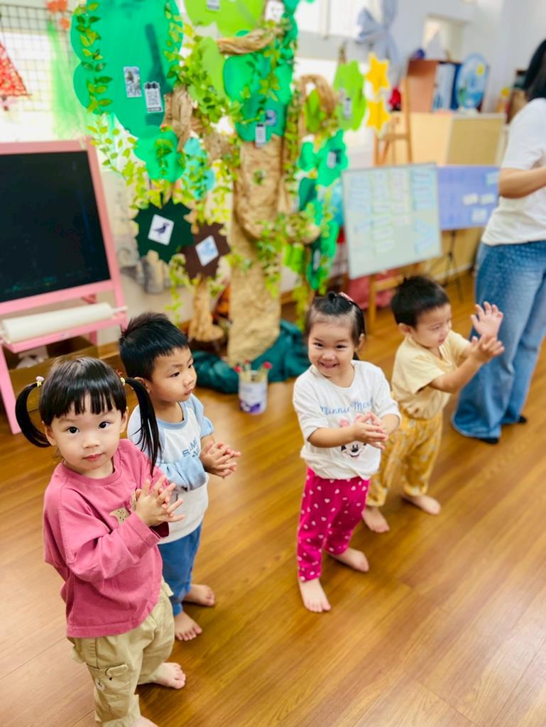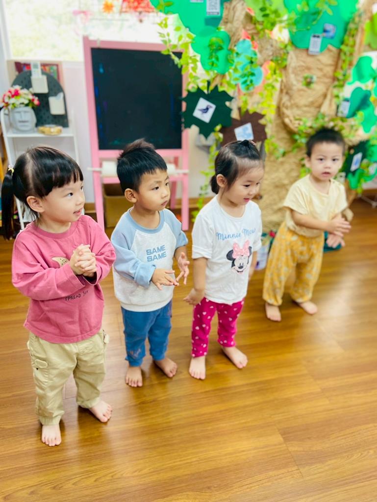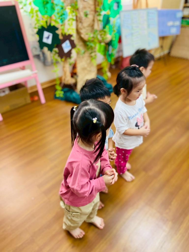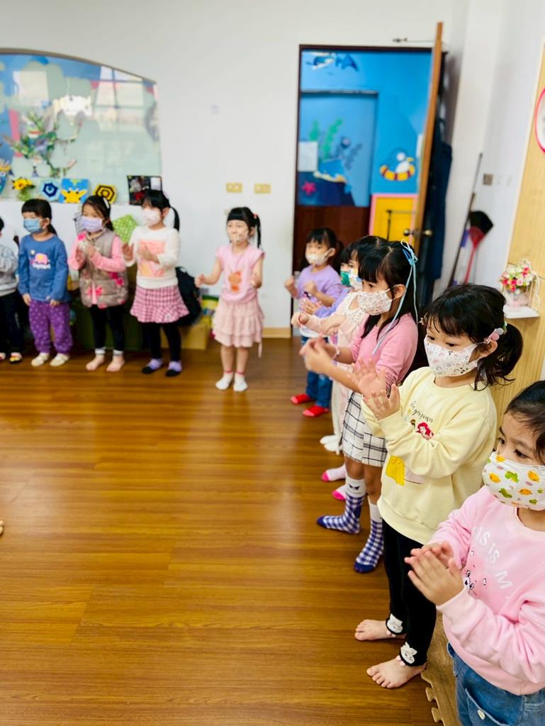 請孩子選擇物品,用「敲、搖、刮」等方式模仿節奏。並進行小組合作創作,分男女小組組成「小小生活樂團」。