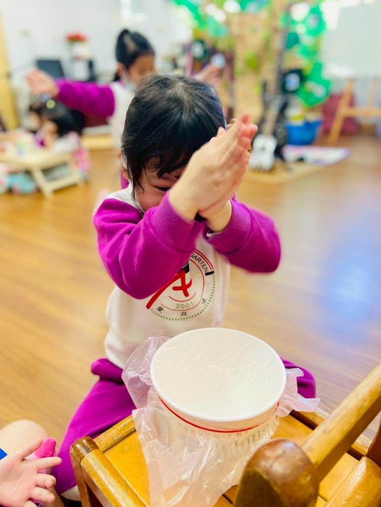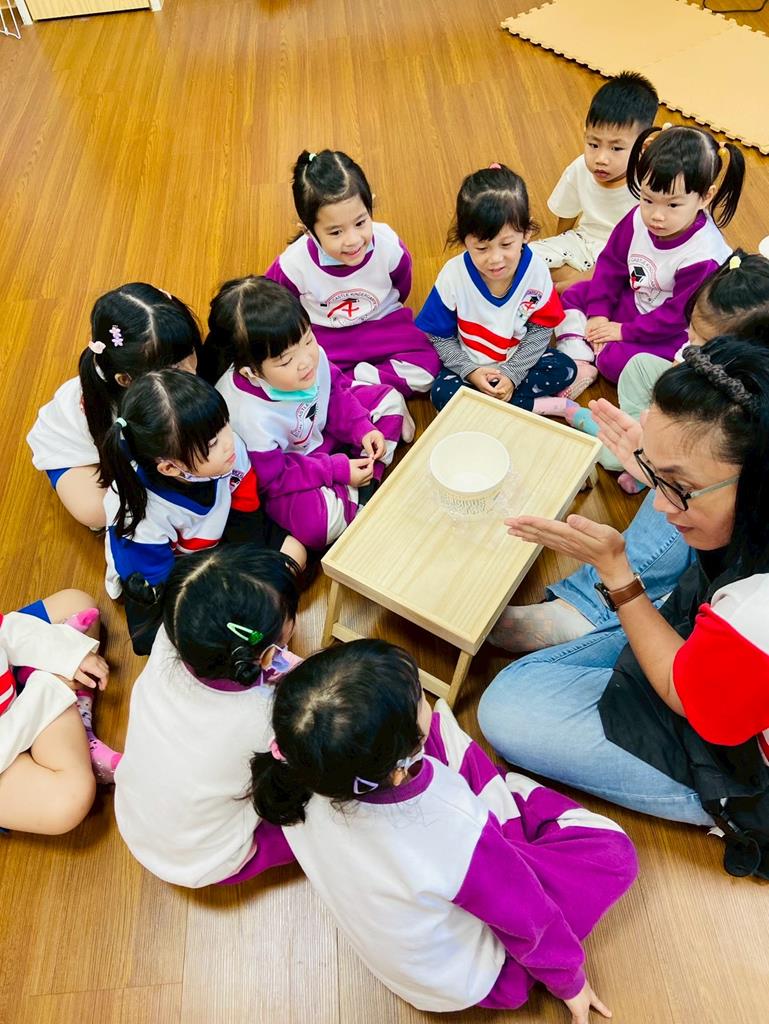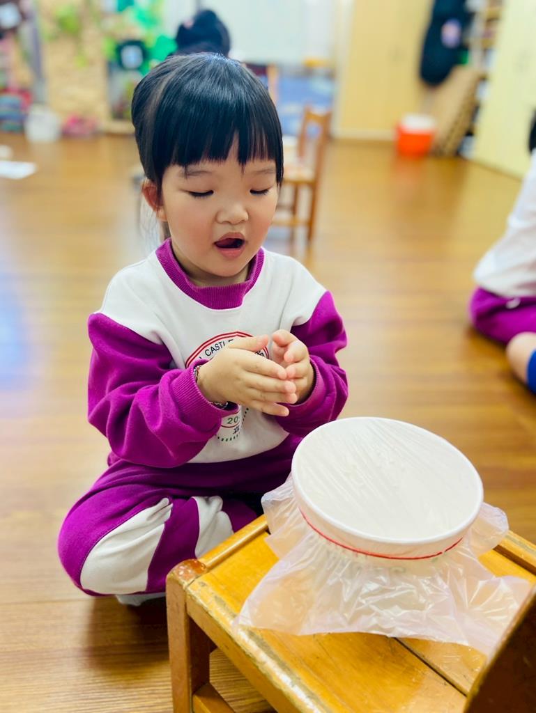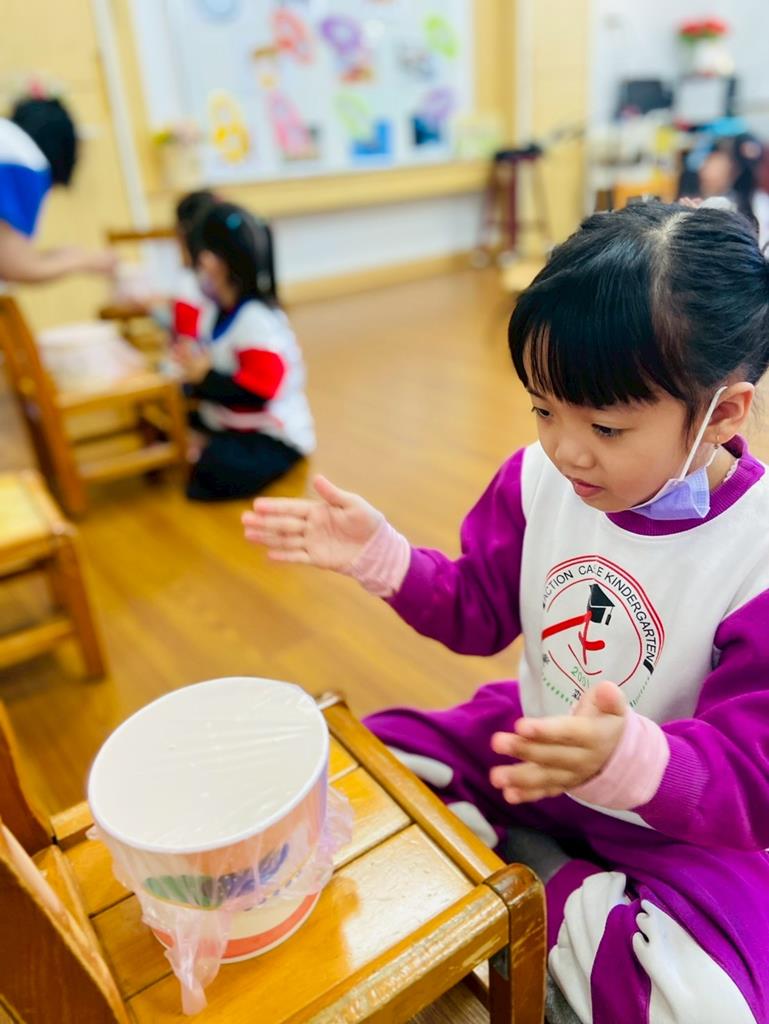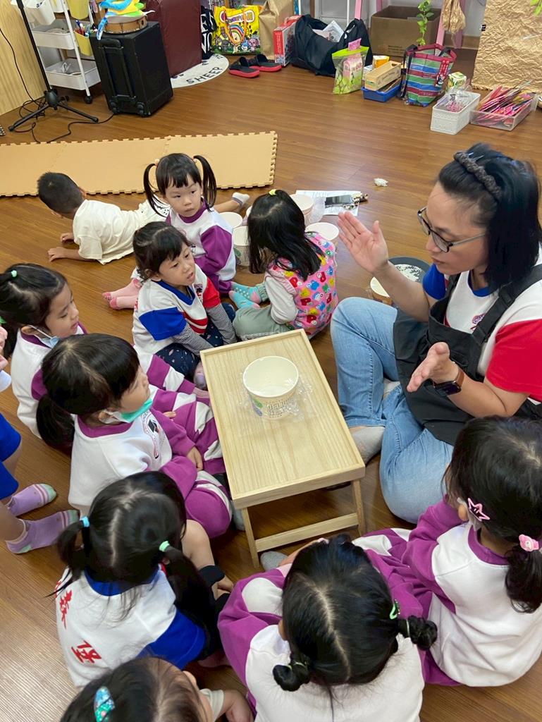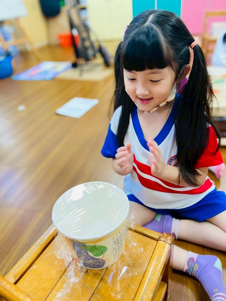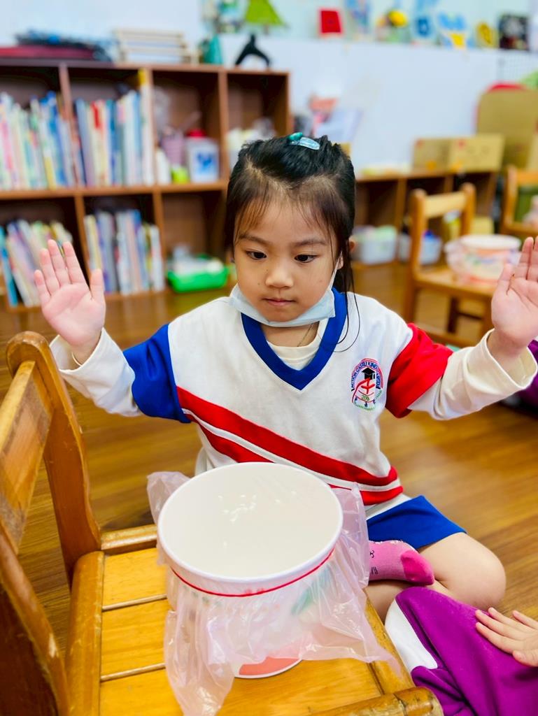 老師邀請孩子輪流用手敲碗 邊或拍手製造聲音並仔細觀察米粒跳動的情況。