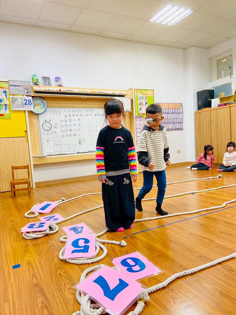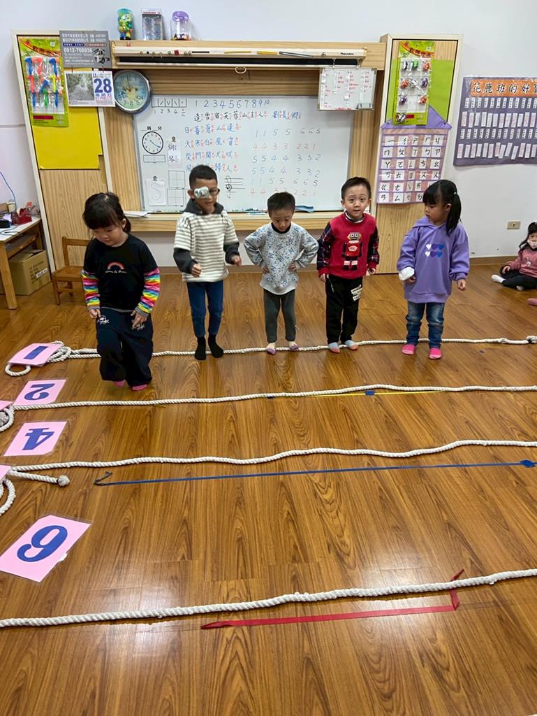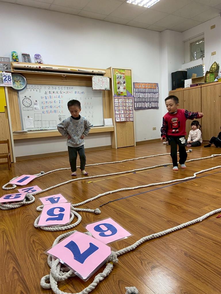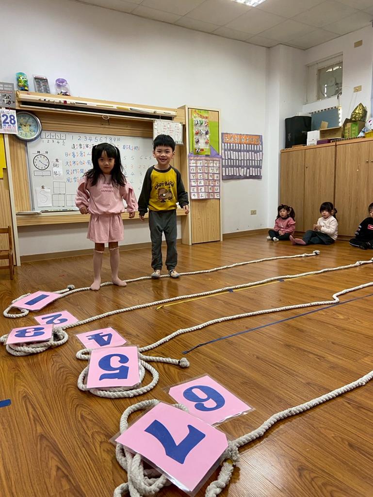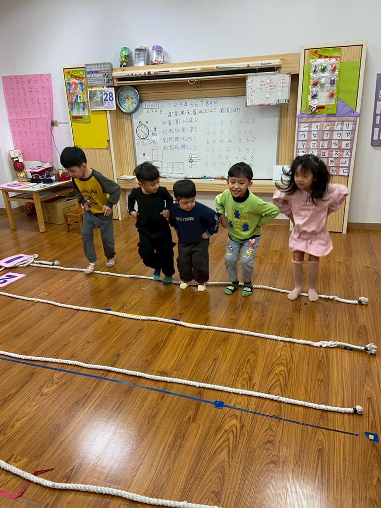 老師用繩子排成5線譜的形狀與孩子進行好玩的音樂遊戲