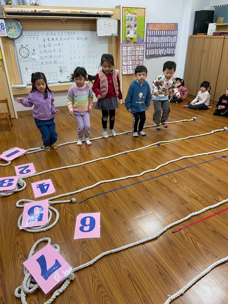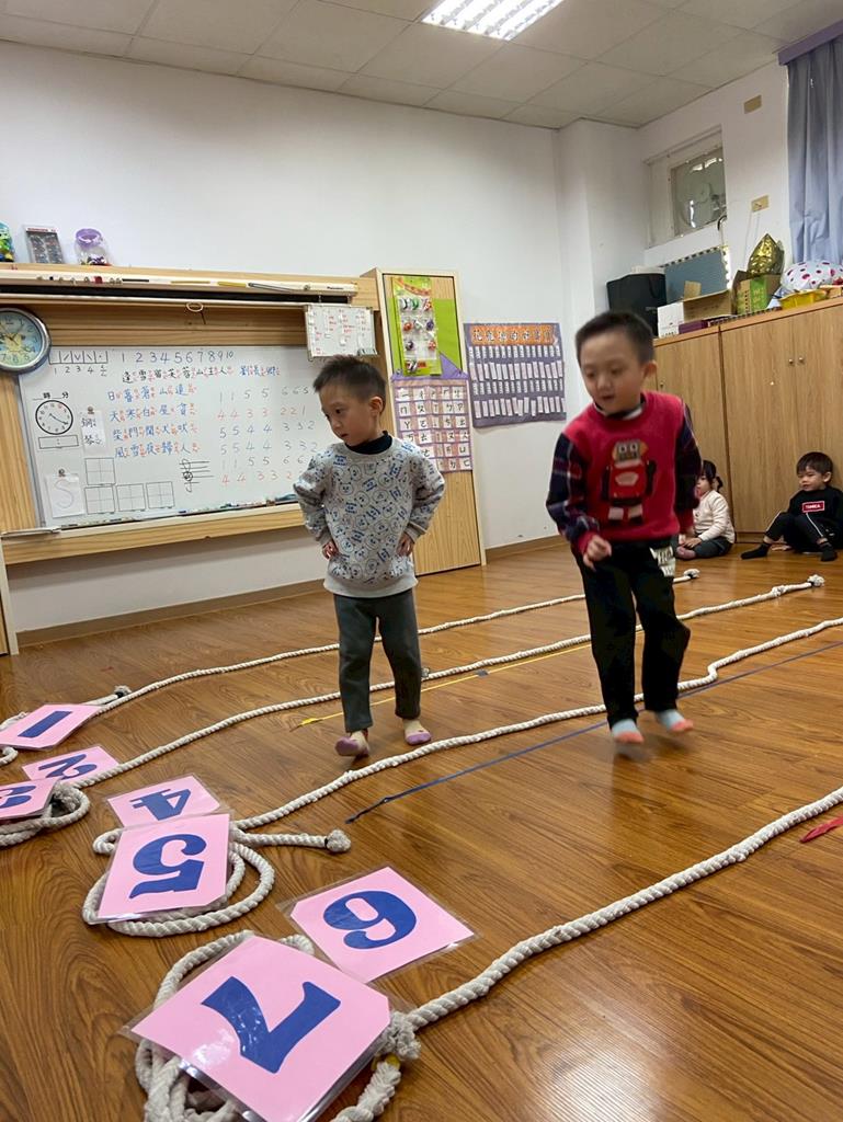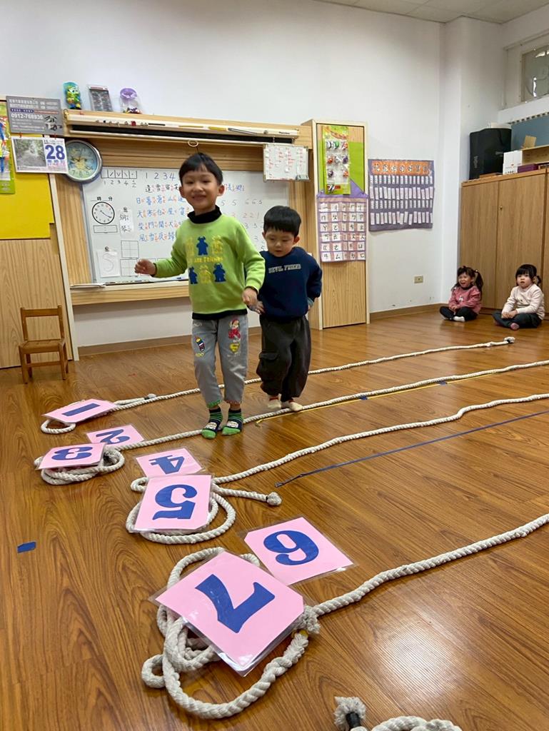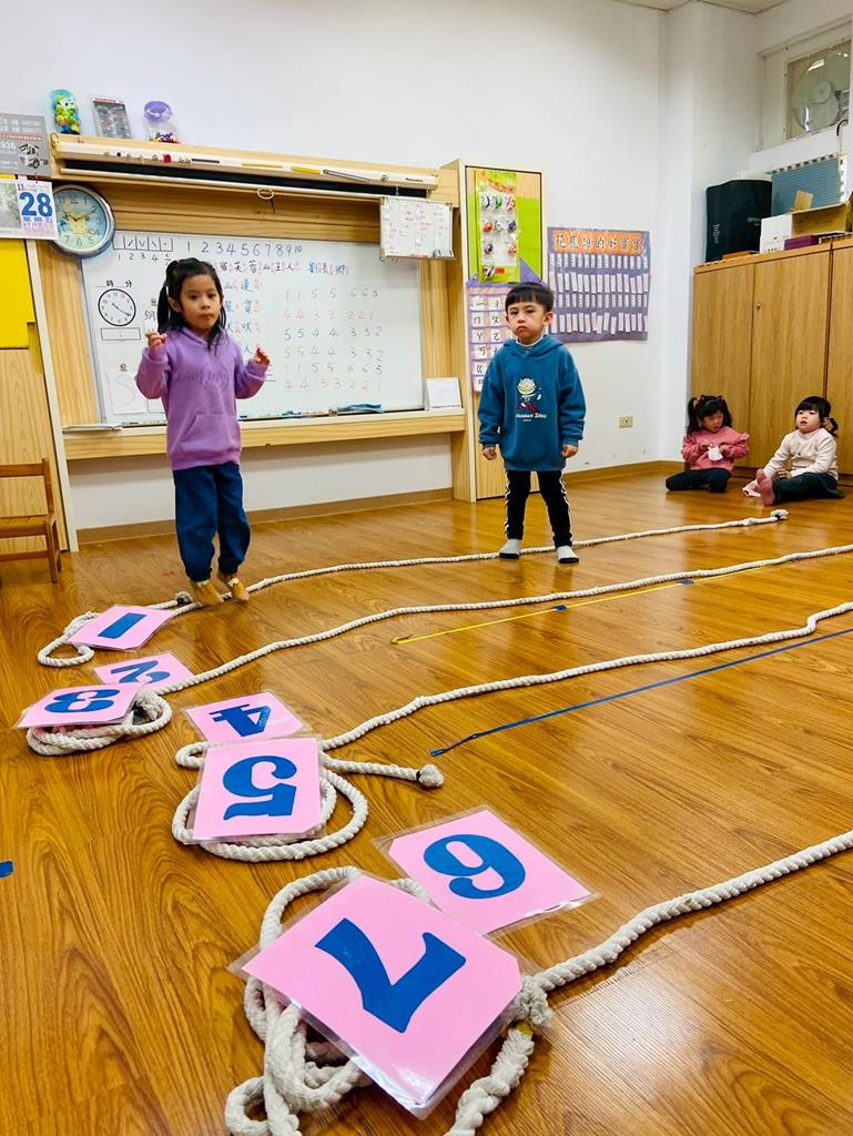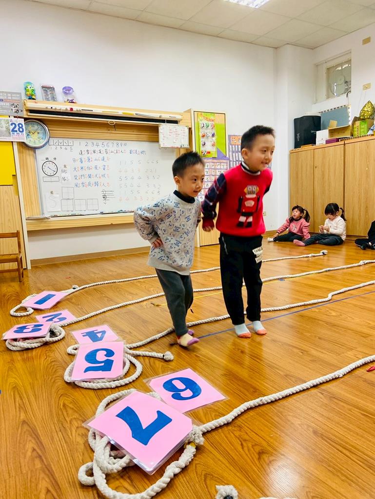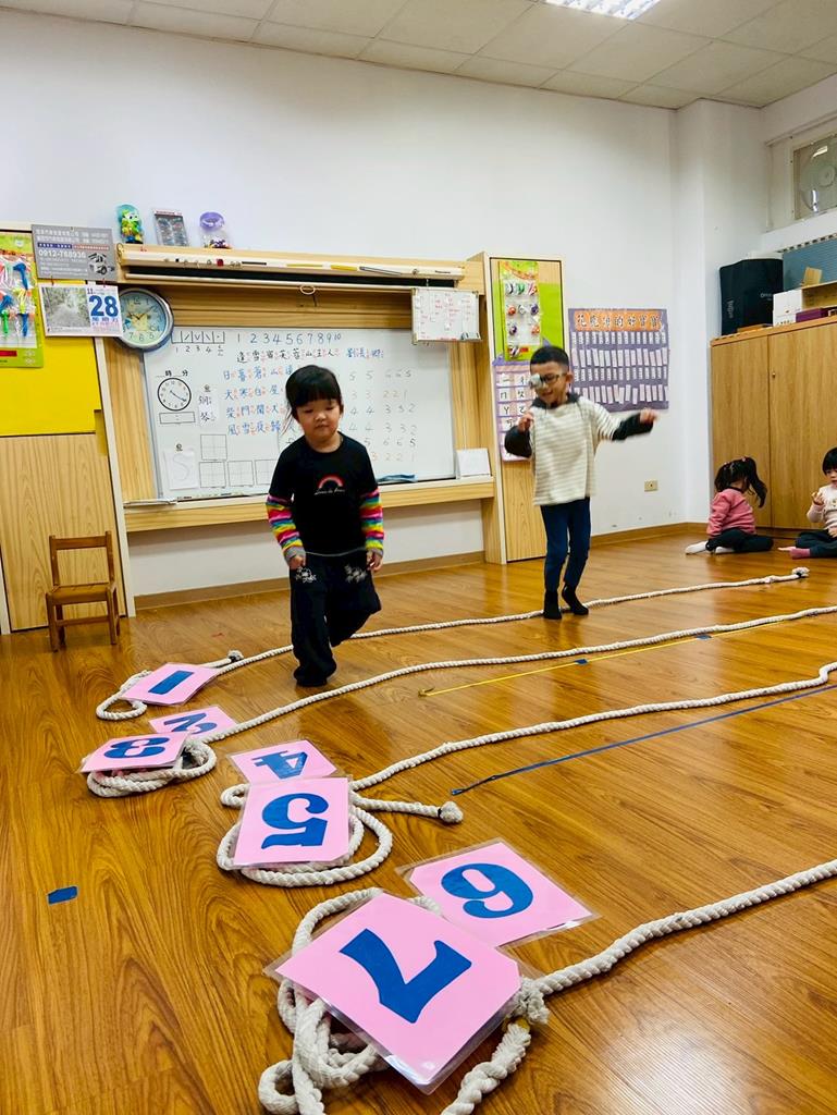 老師用繩子排成5線譜的形狀與孩子進行好玩的音樂遊戲