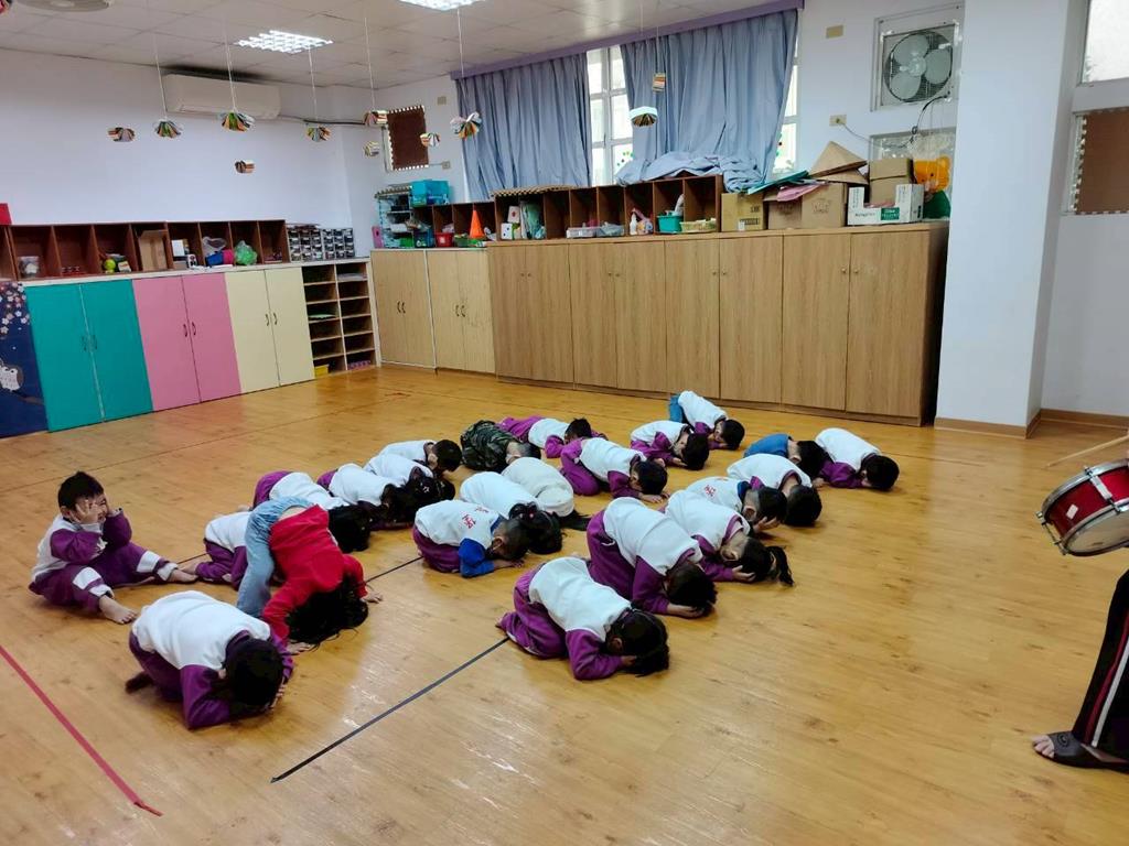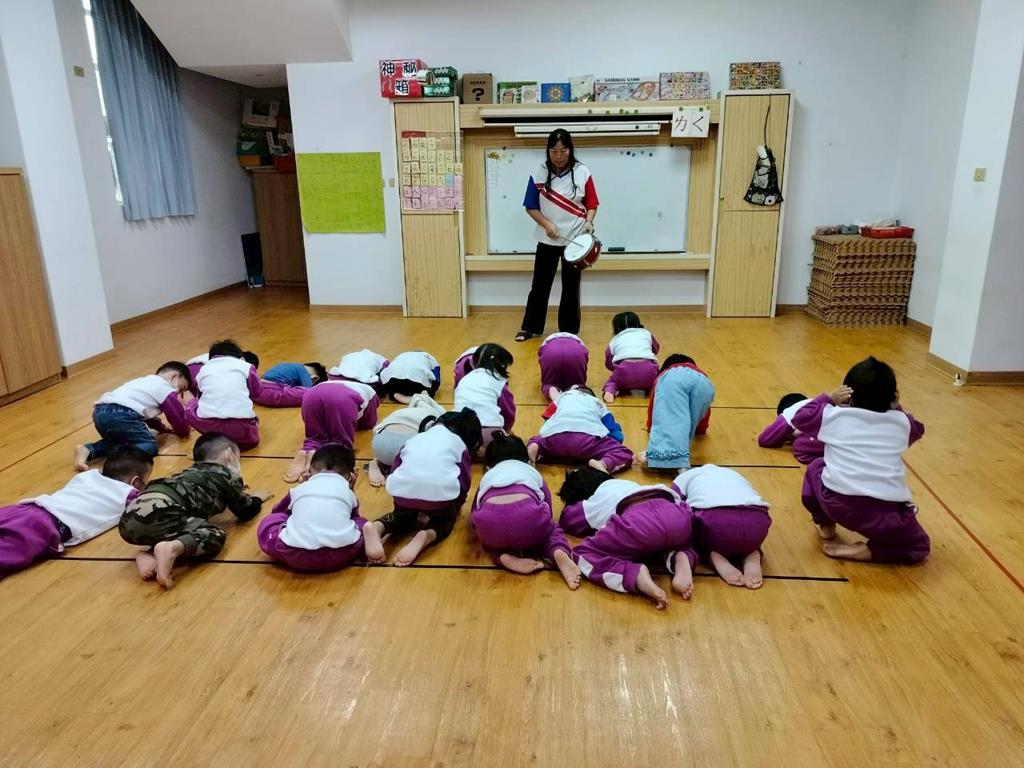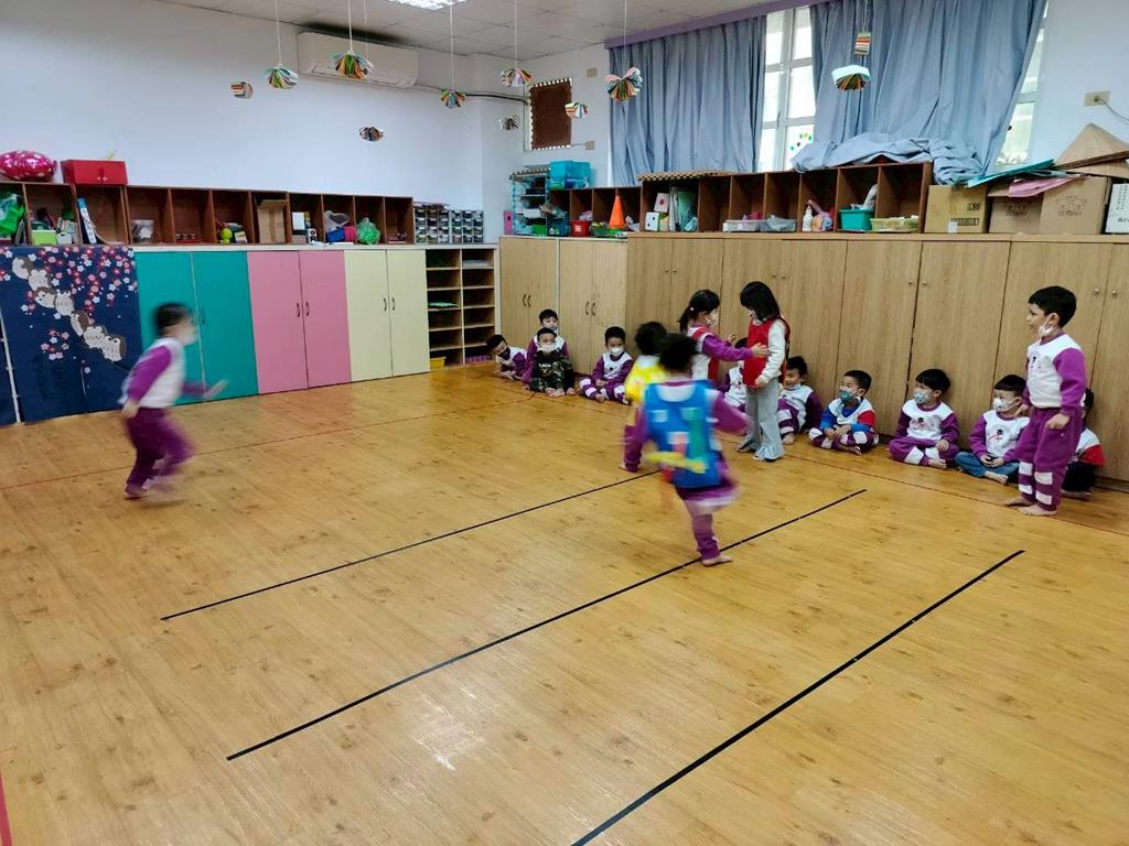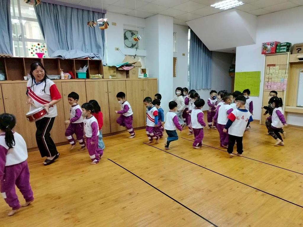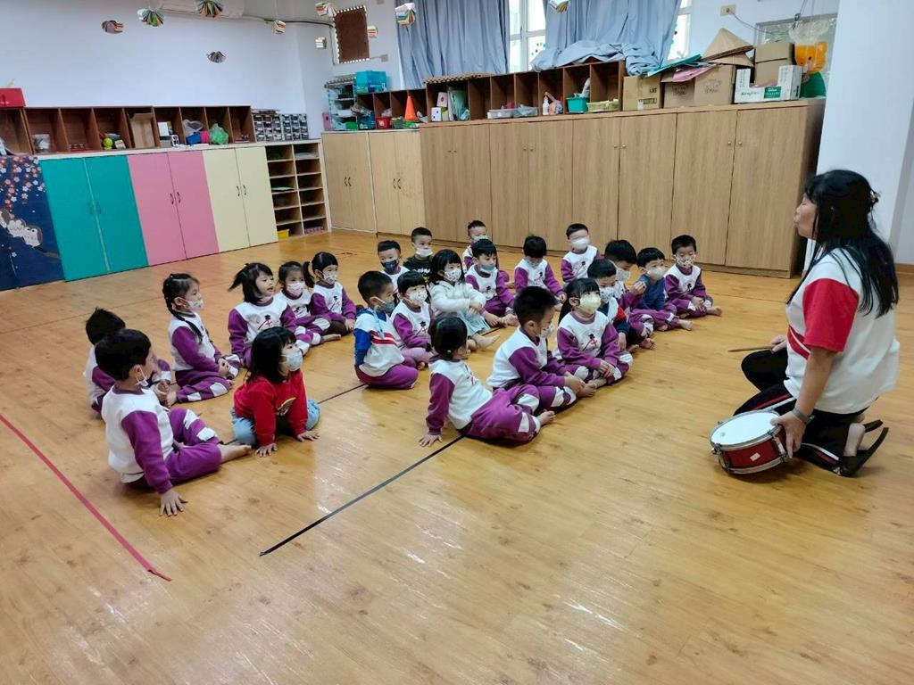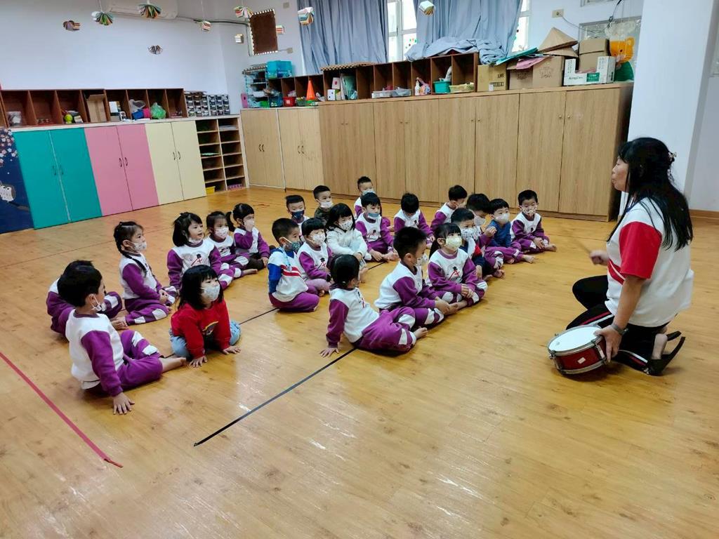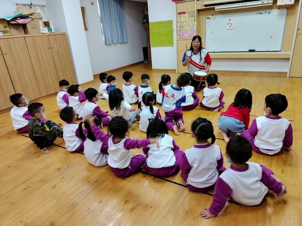 老師利用小鼓敲出不同的輕重聲,爸爸重重聲媽媽輕輕聲,跟著鼓的輕重聲進行遊戲