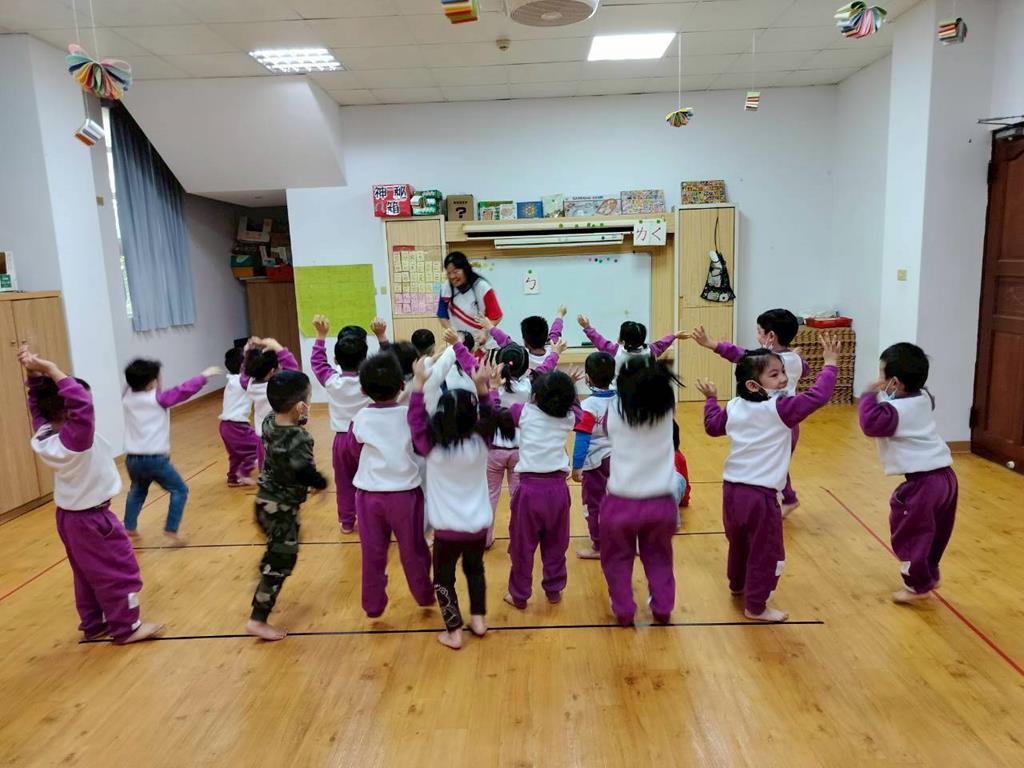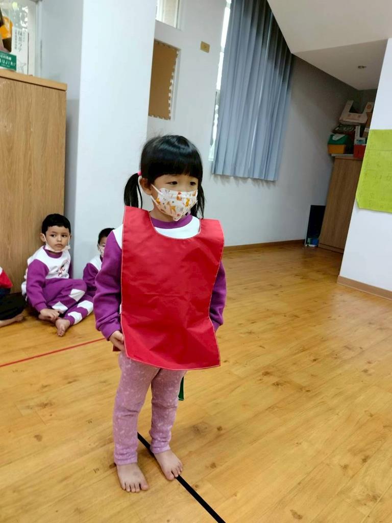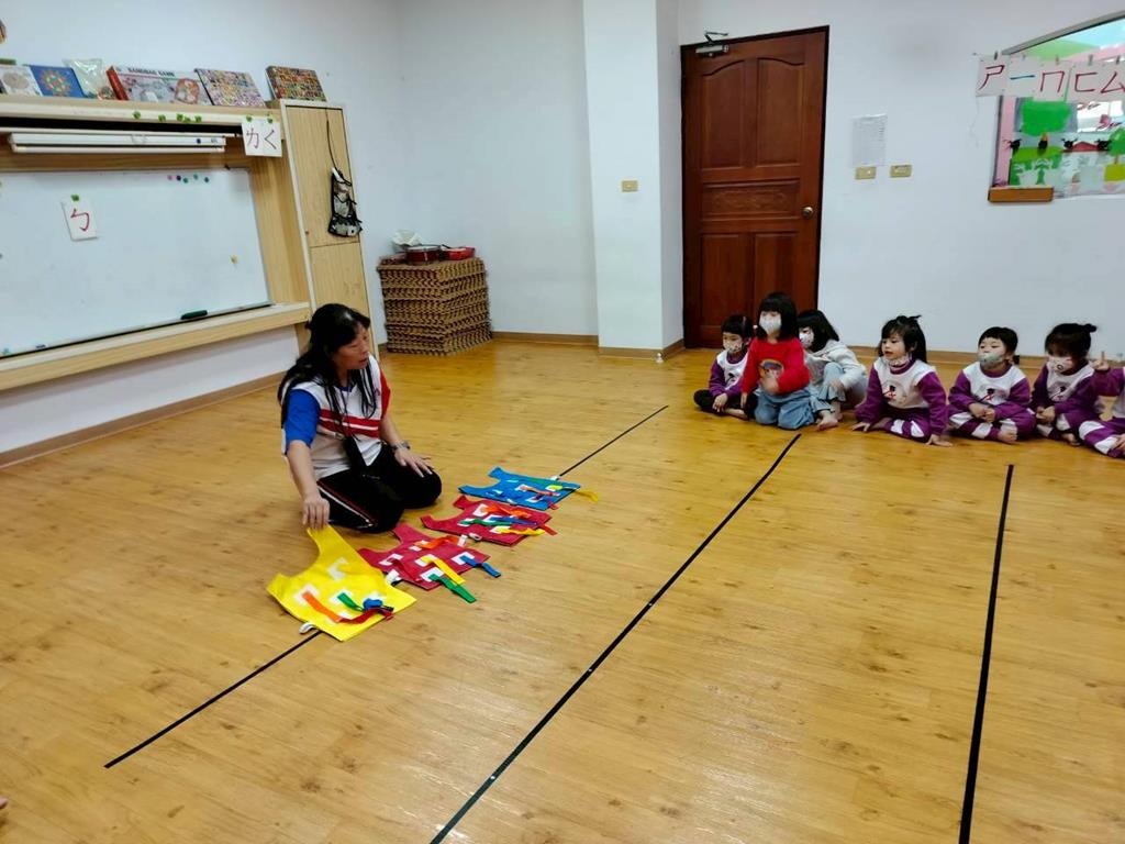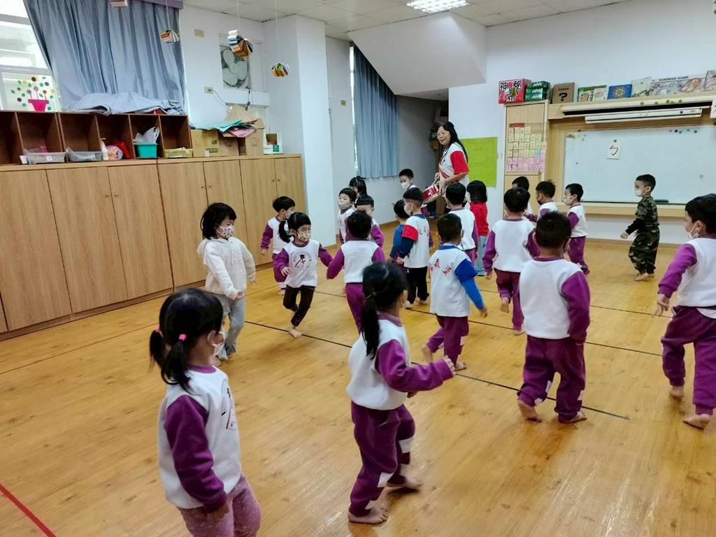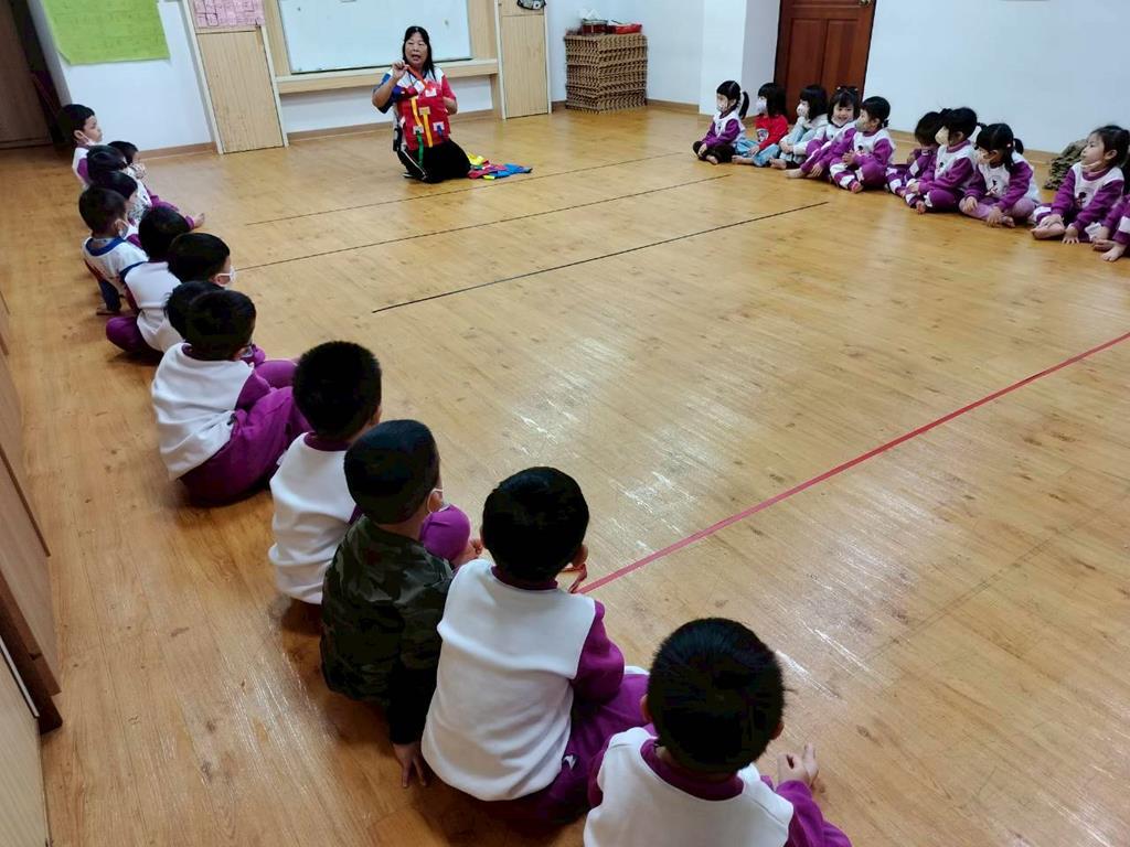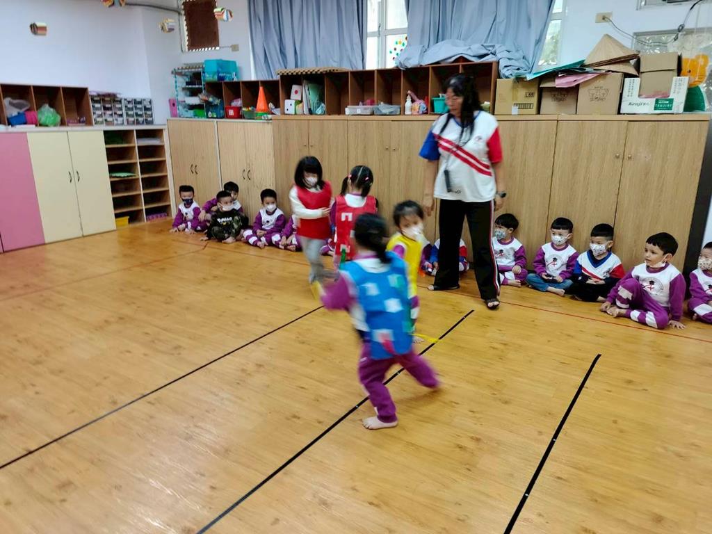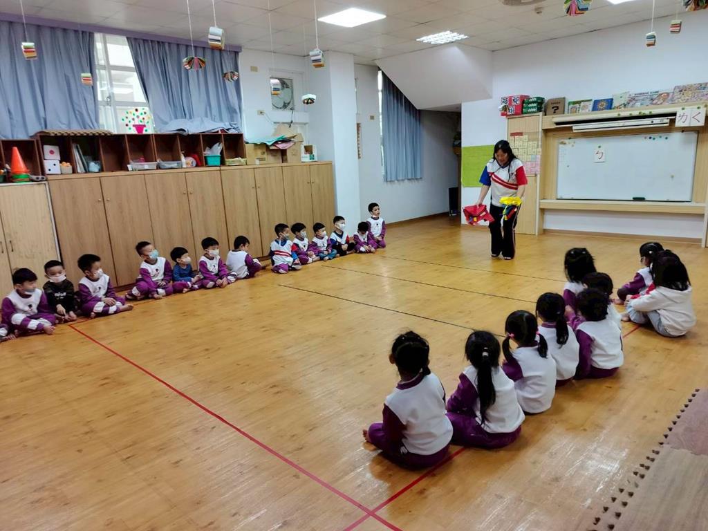 老師利用小鼓敲出不同的輕重聲,爸爸重重聲媽媽輕輕聲,跟著鼓的輕重聲進行遊戲