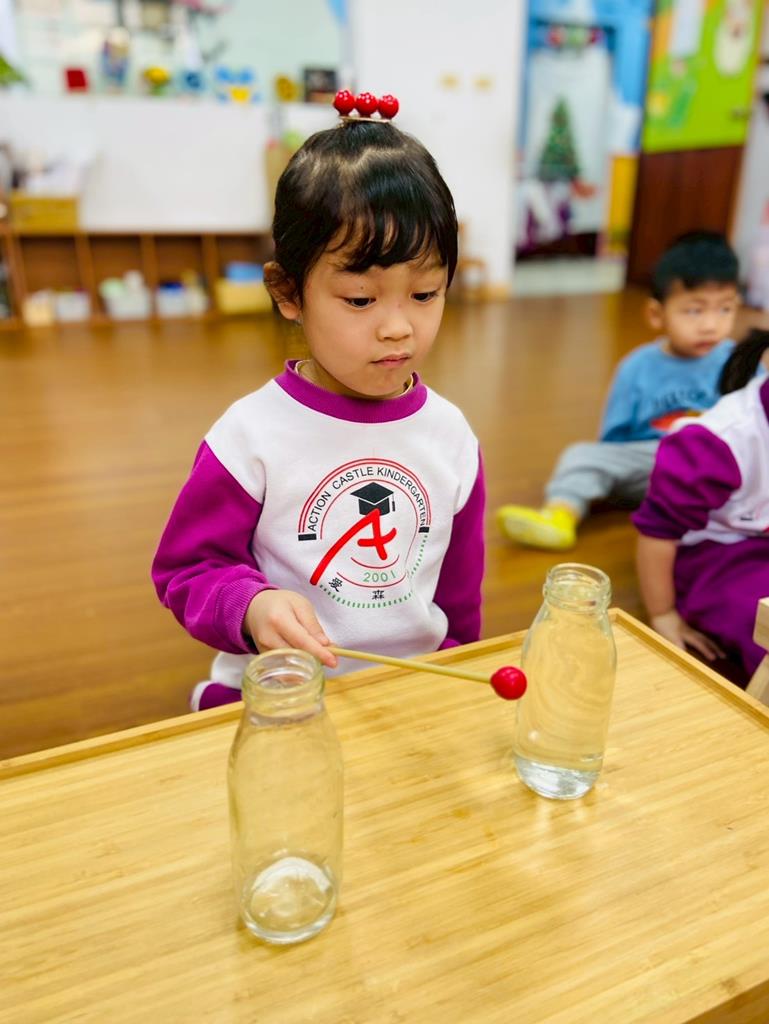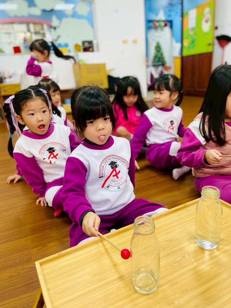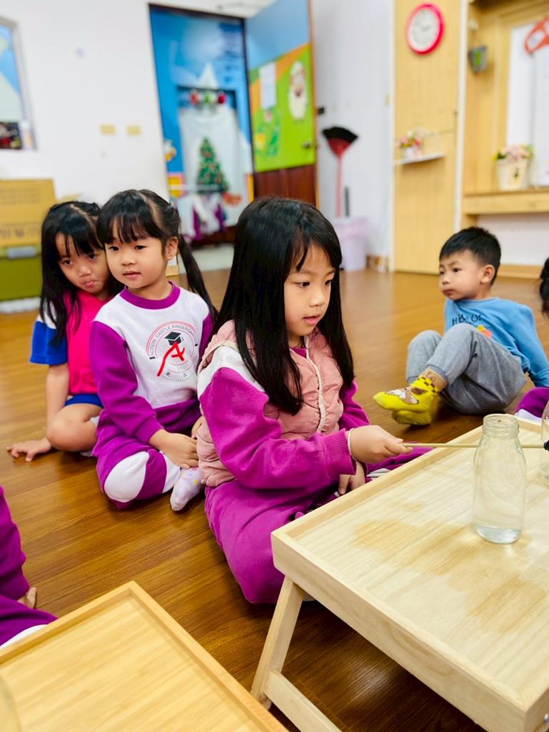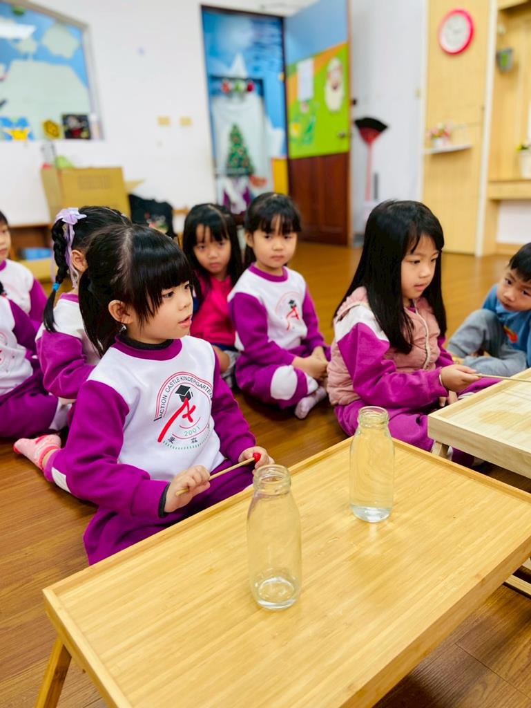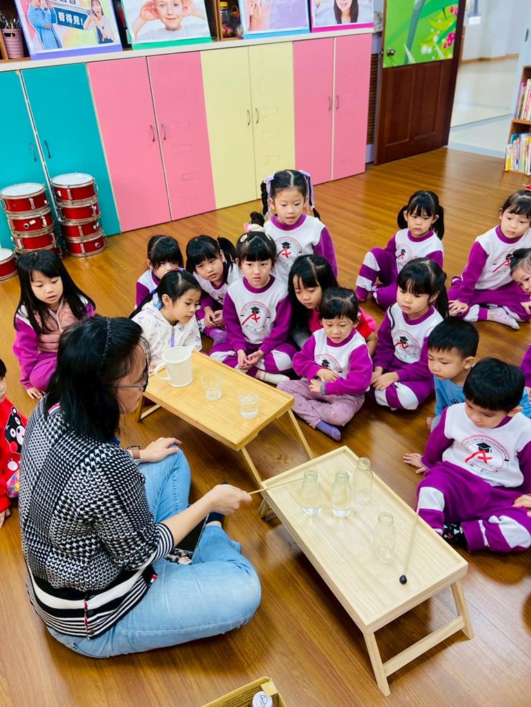 老師敲兩個水量不同的杯子,詢問:「你們覺得這兩個杯子發出的聲音有一樣嗎?」並進行分組操作,邀請孩子自己來敲敲看