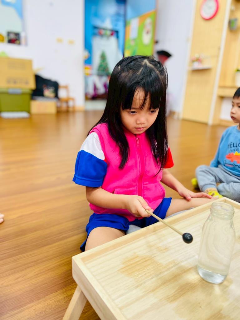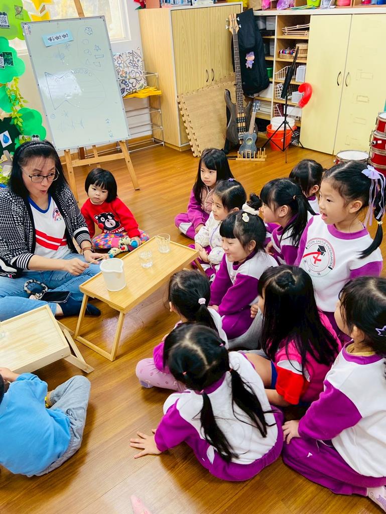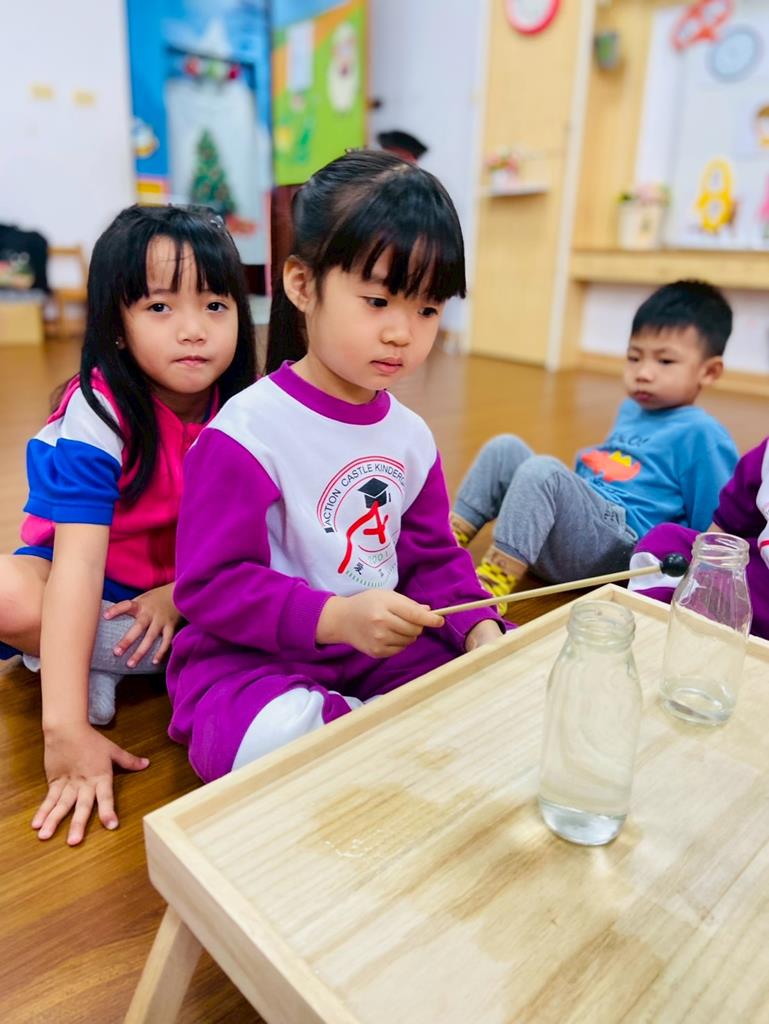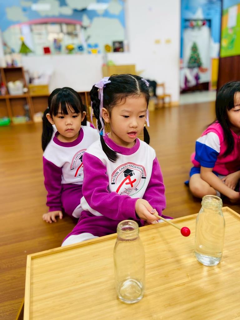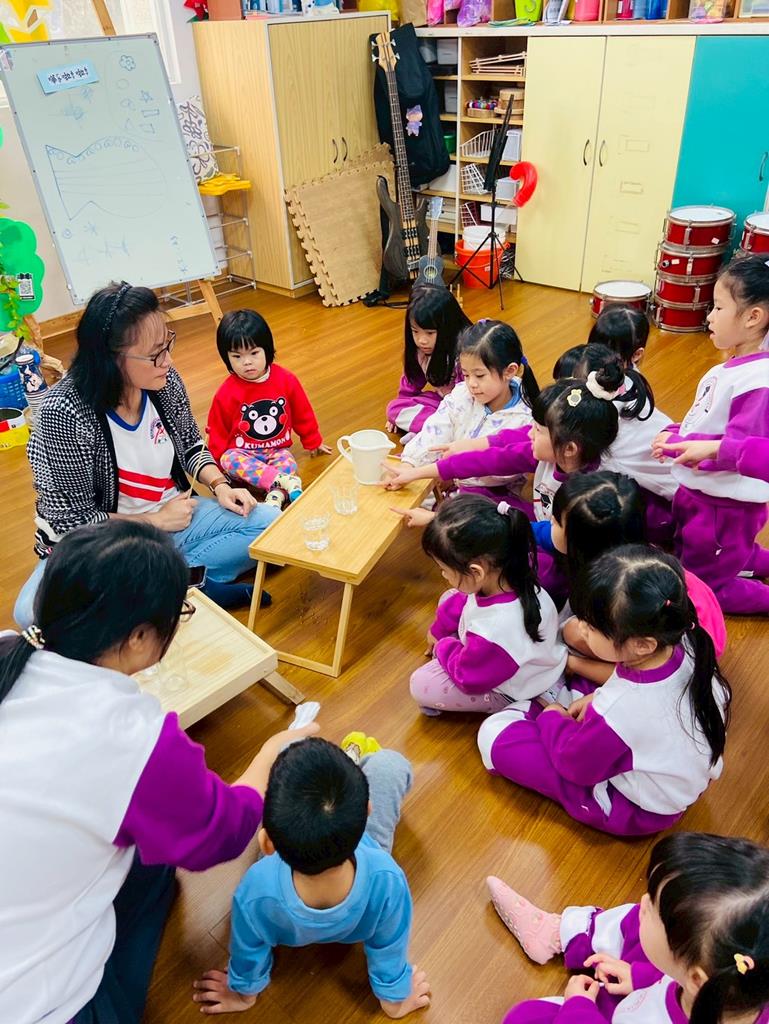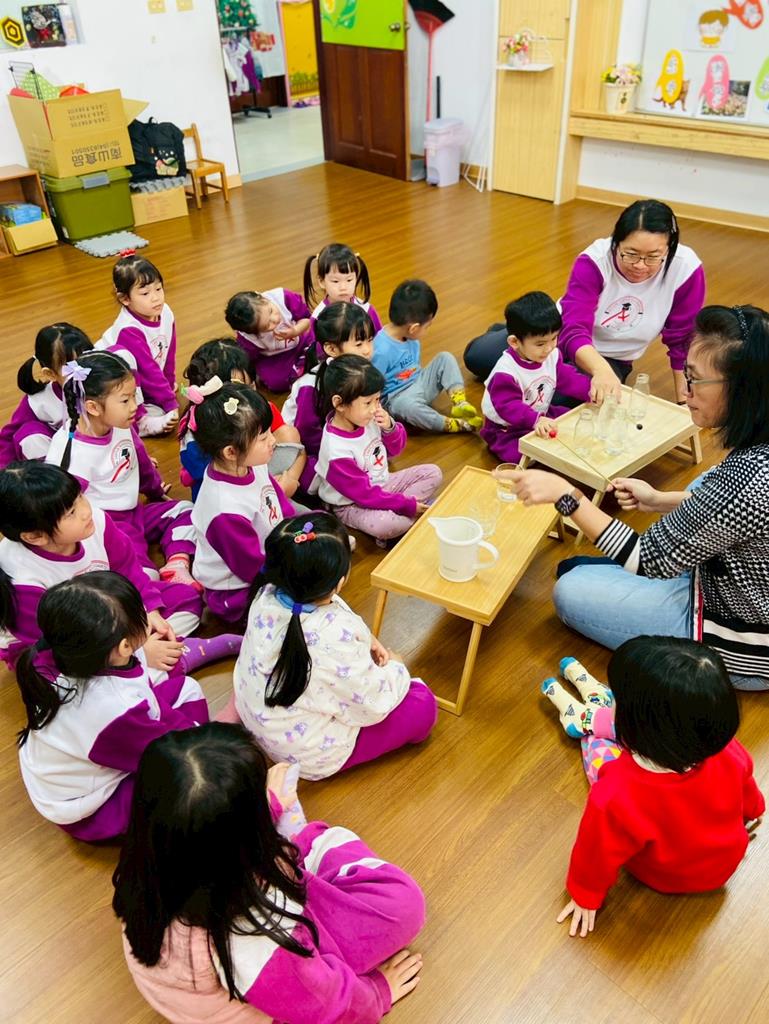 老師敲兩個水量不同的杯子,詢問:「你們覺得這兩個杯子發出的聲音有一樣嗎?」並進行分組操作,邀請孩子自己來敲敲看