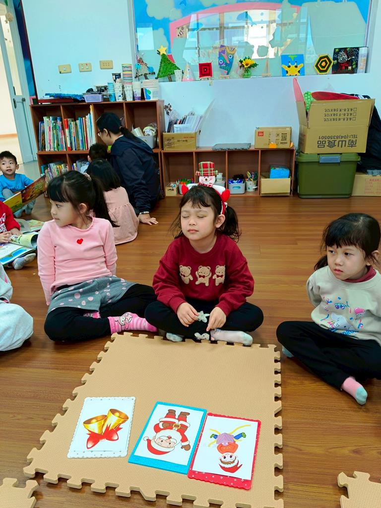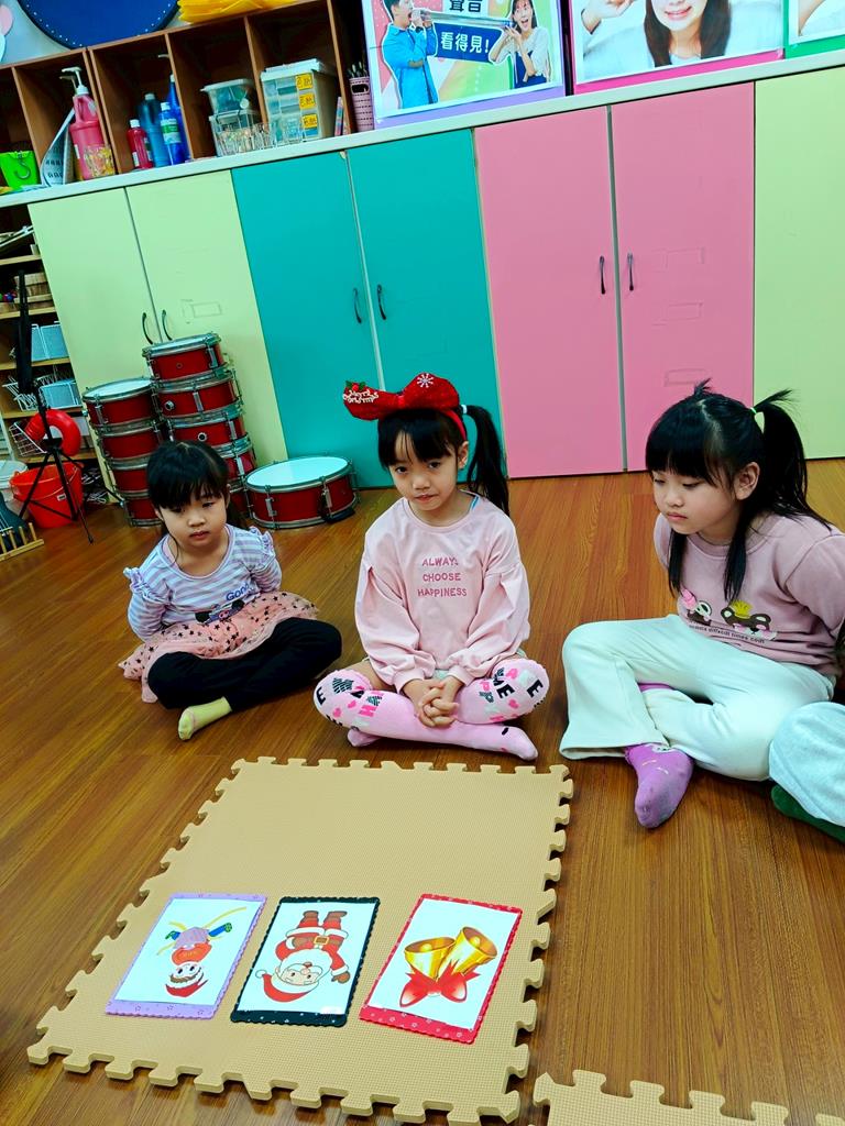 我們進行聖誕聲音配對遊戲,透過聆聽不同的生活與節慶聲音引導孩子辨識聲音進行配對