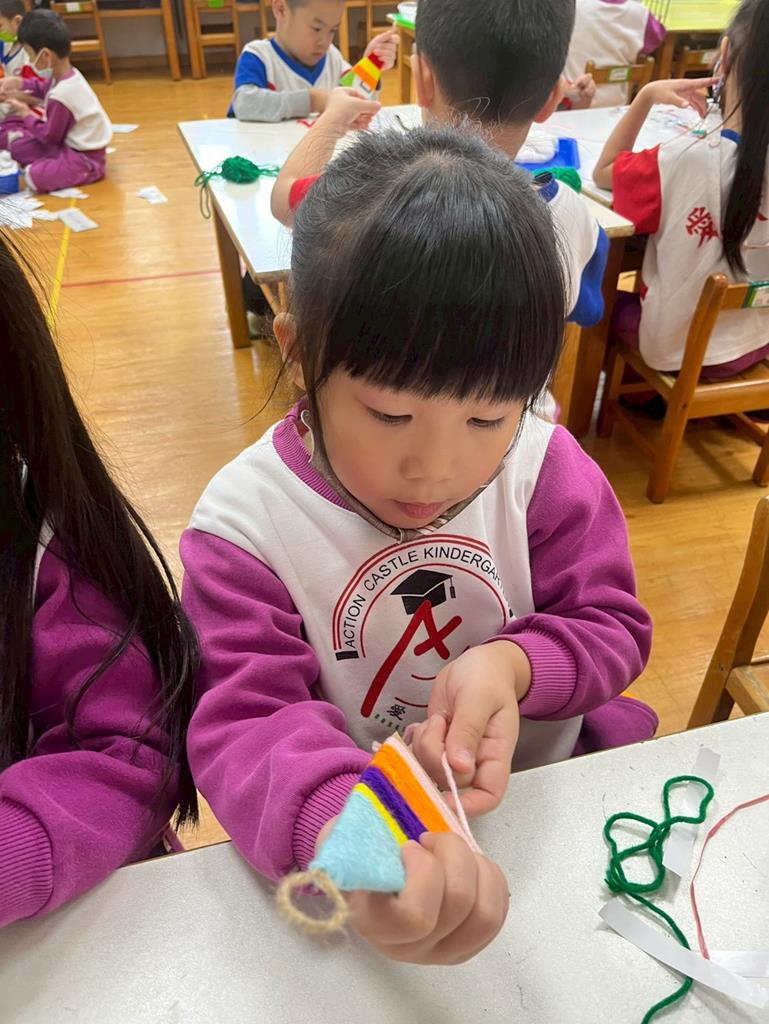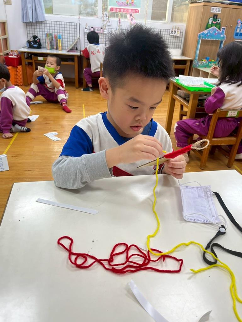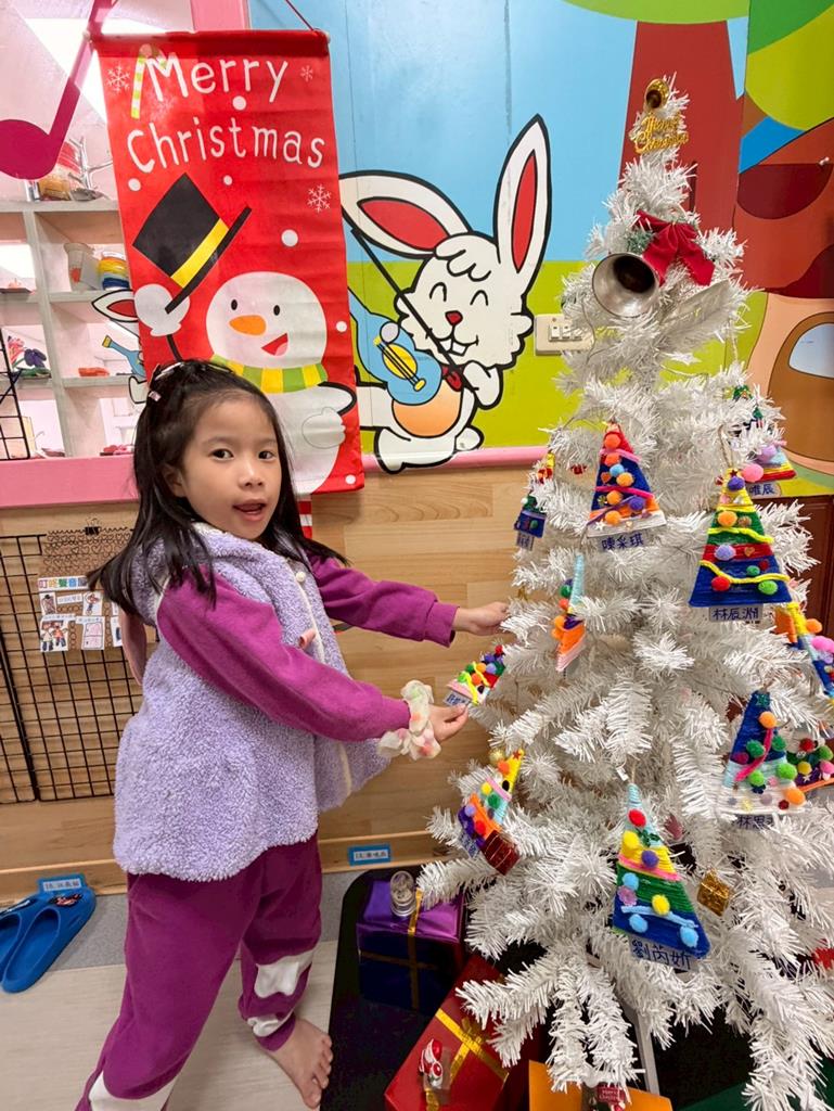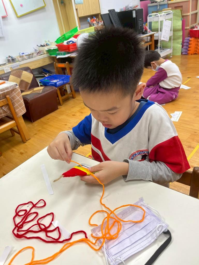邀請孩子們利用美勞素材進行毛線纏繞,並裝飾在聖誕樹上