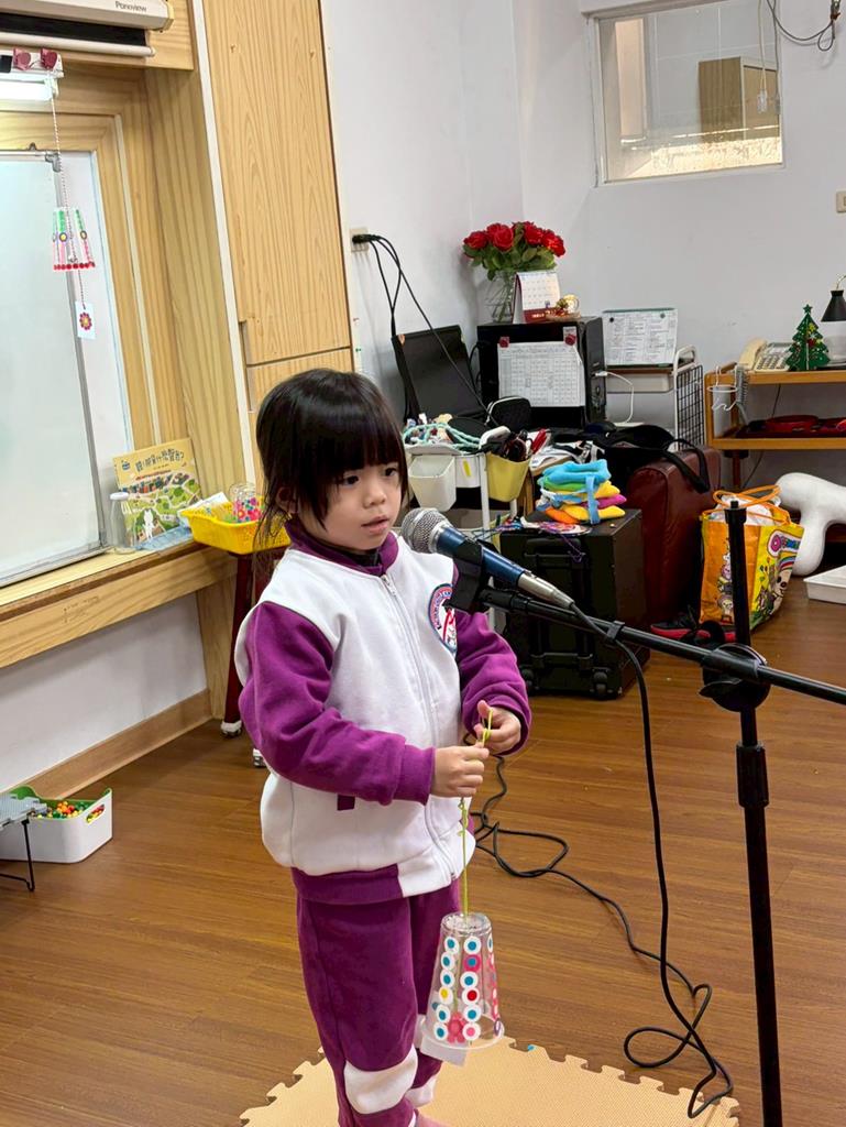 孩子站在麥克風前,用簡單的比喻介紹自己的風鈴聲音