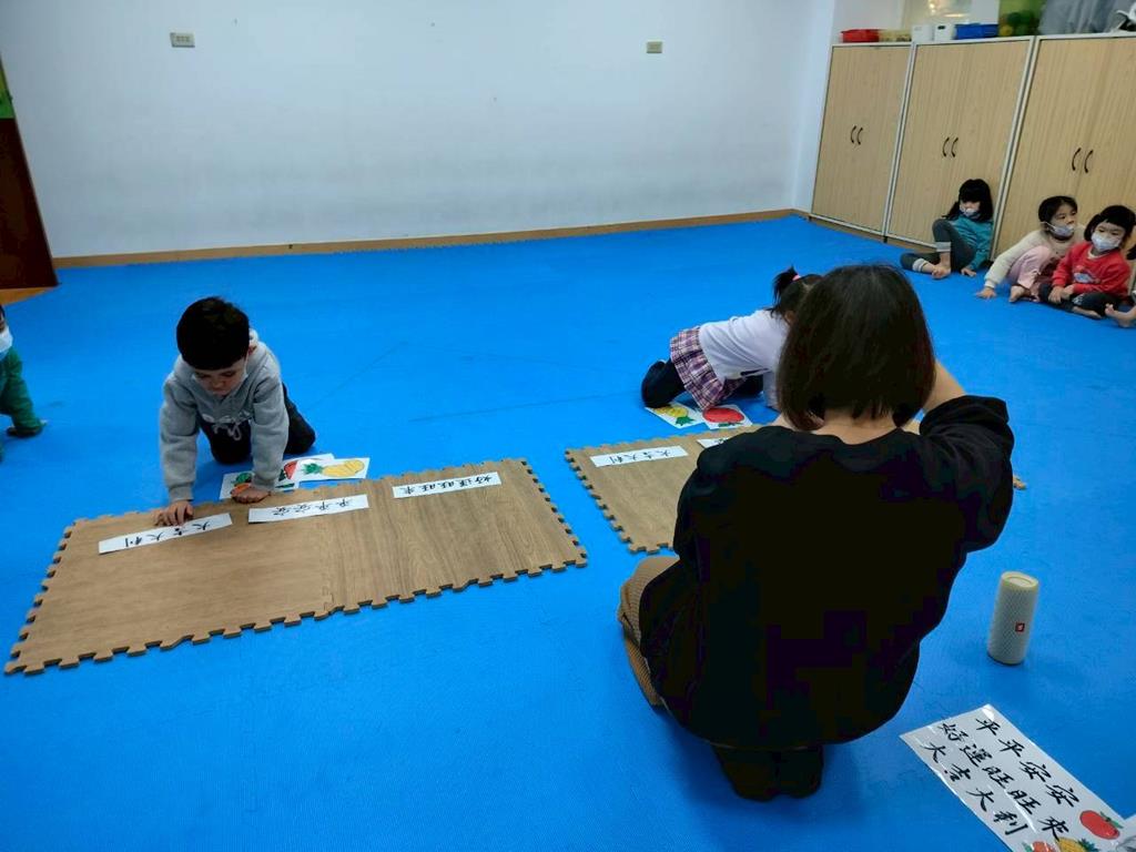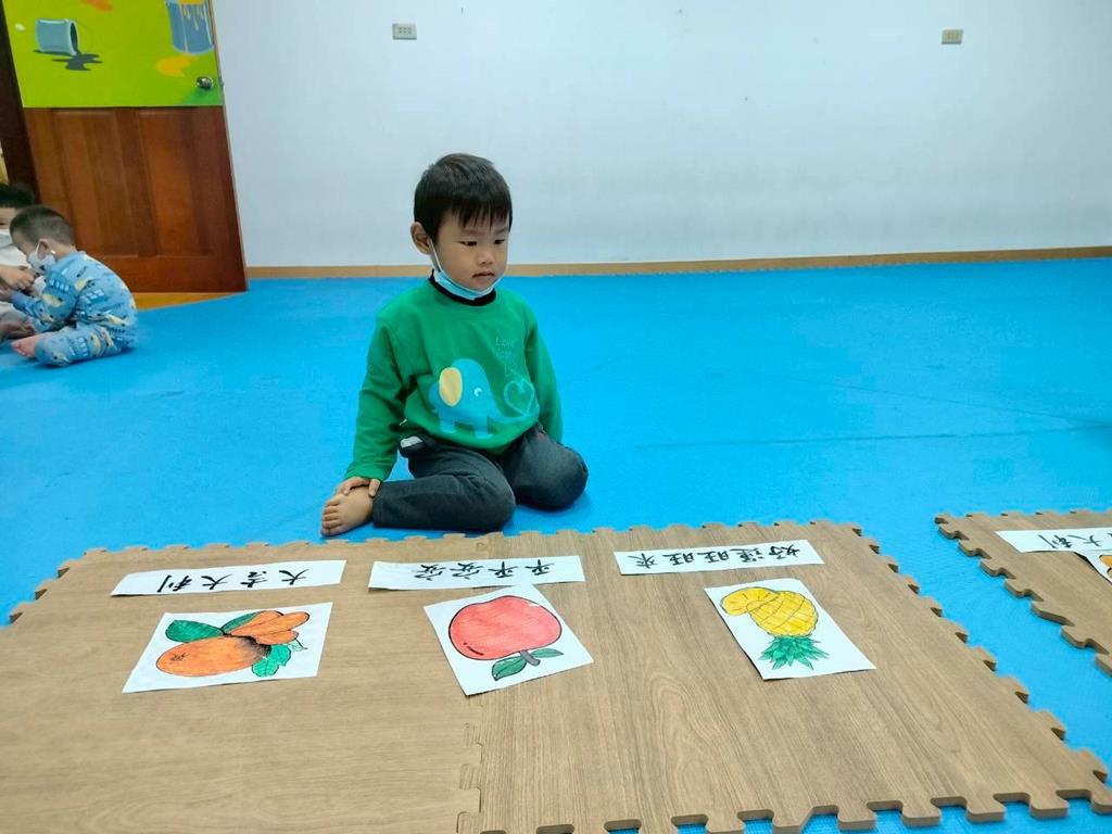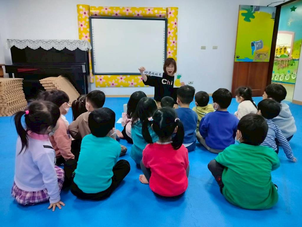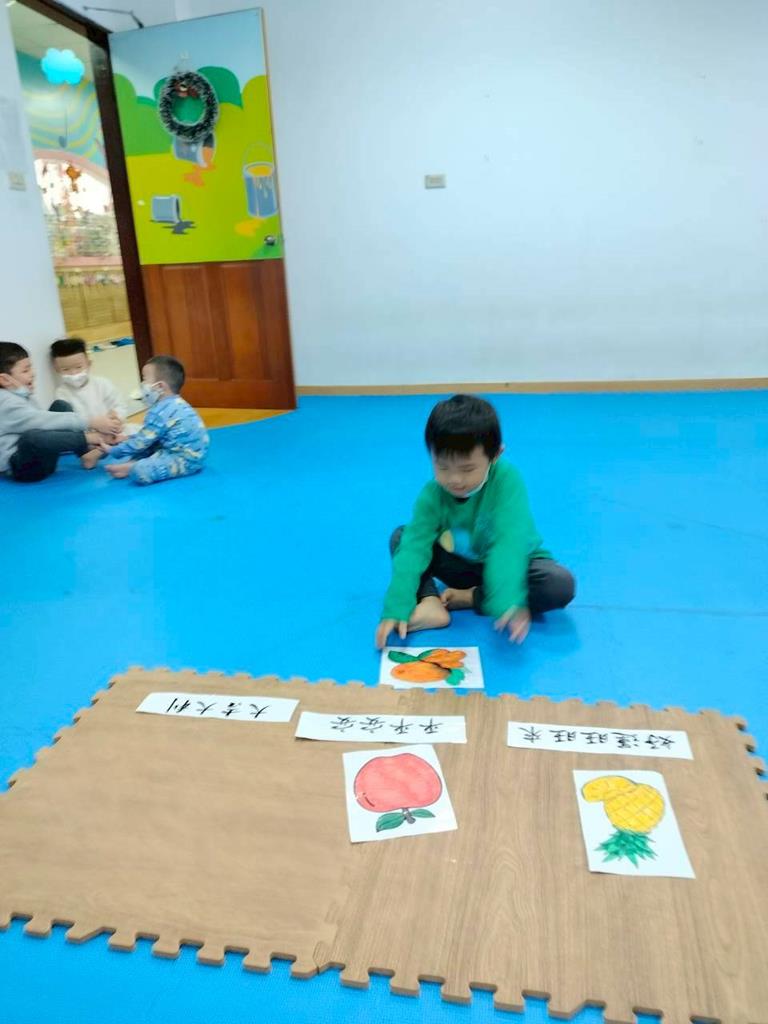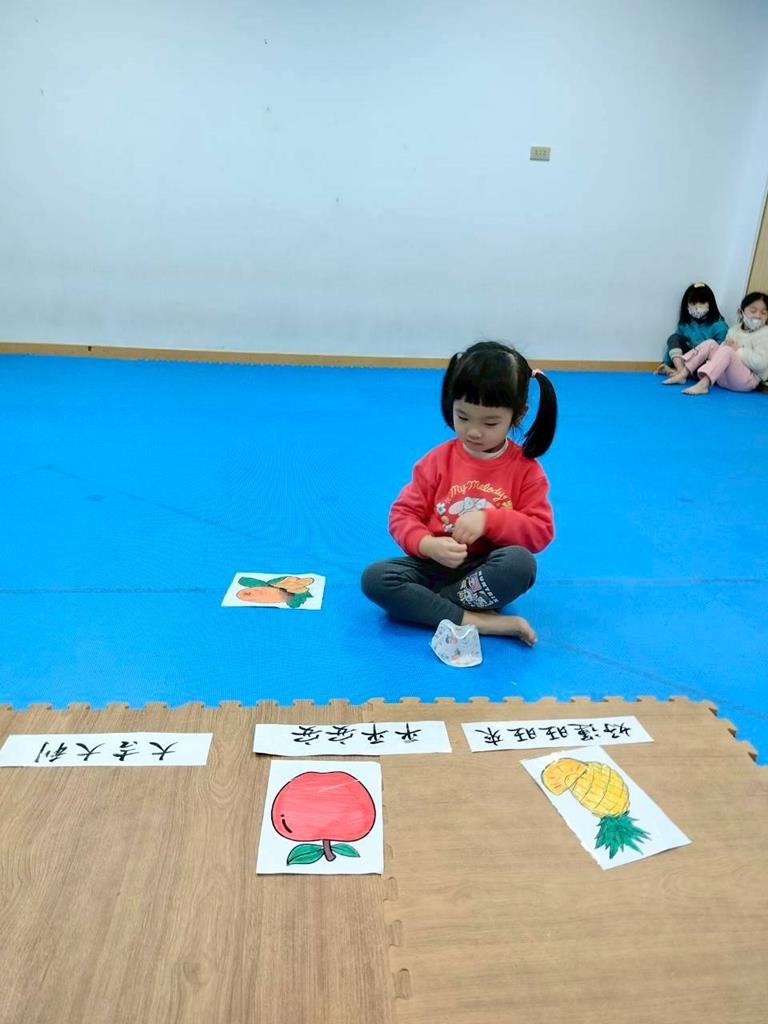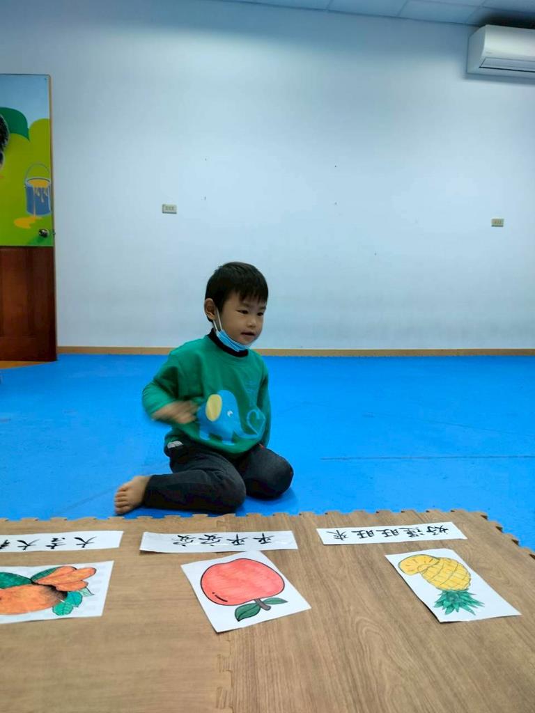 老師帶領孩子認識3種水果的吉祥話,並帶領幼兒進行配對遊戲