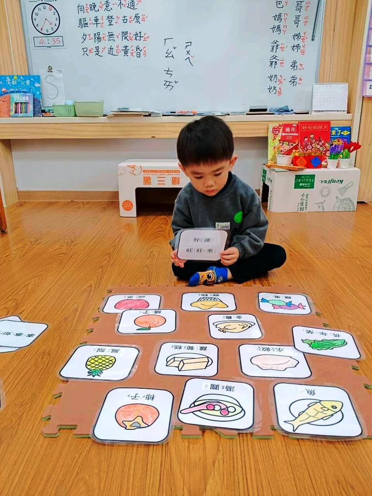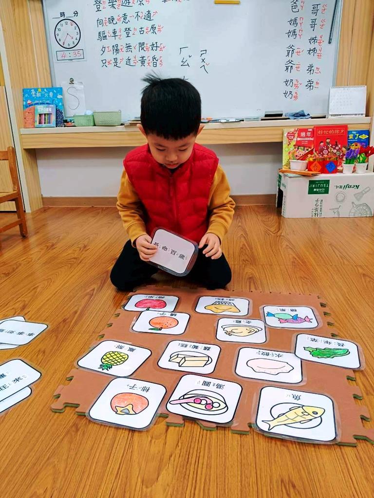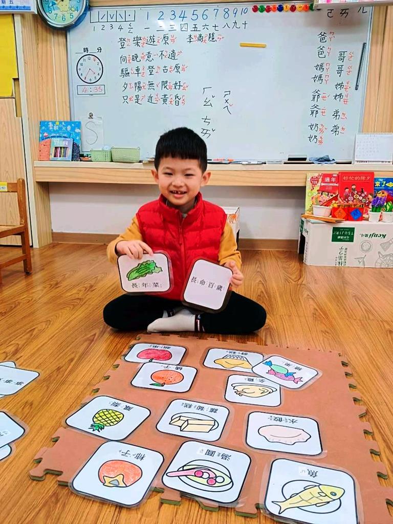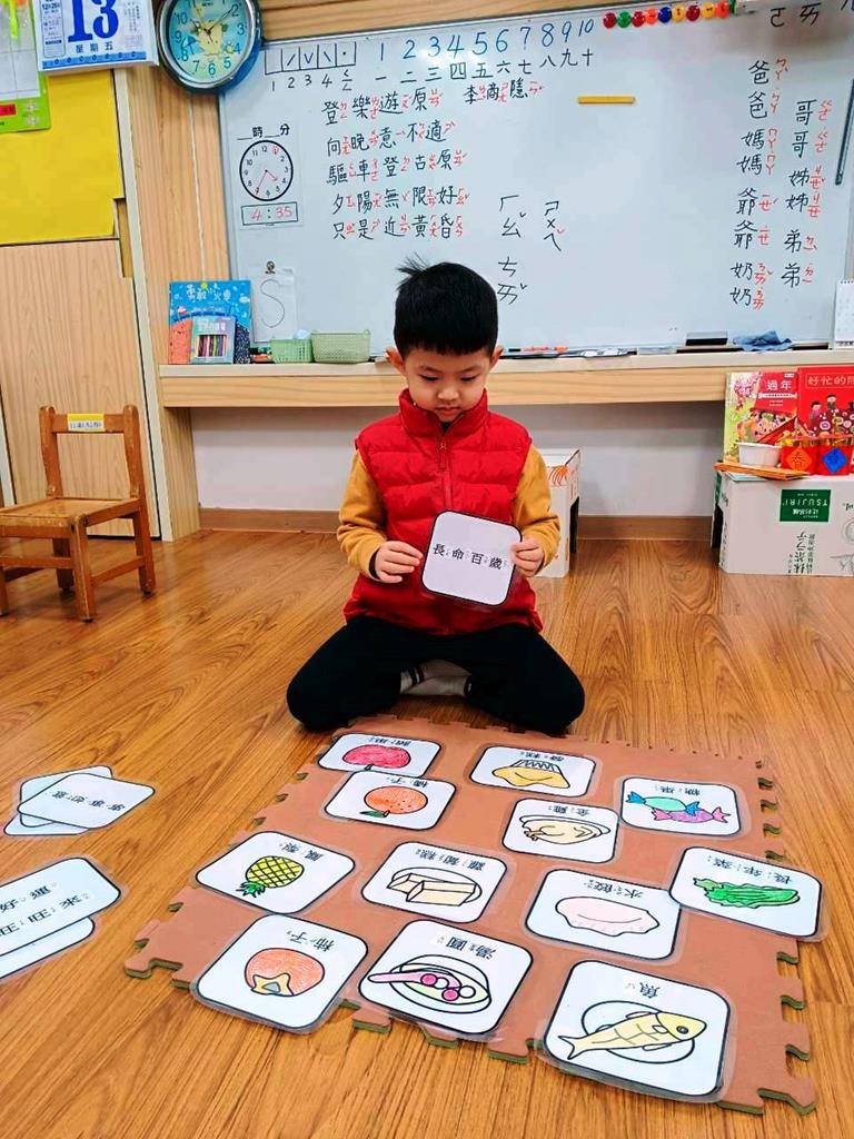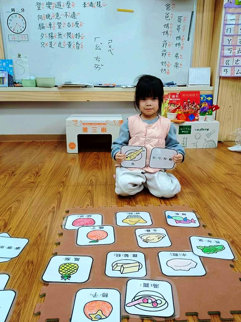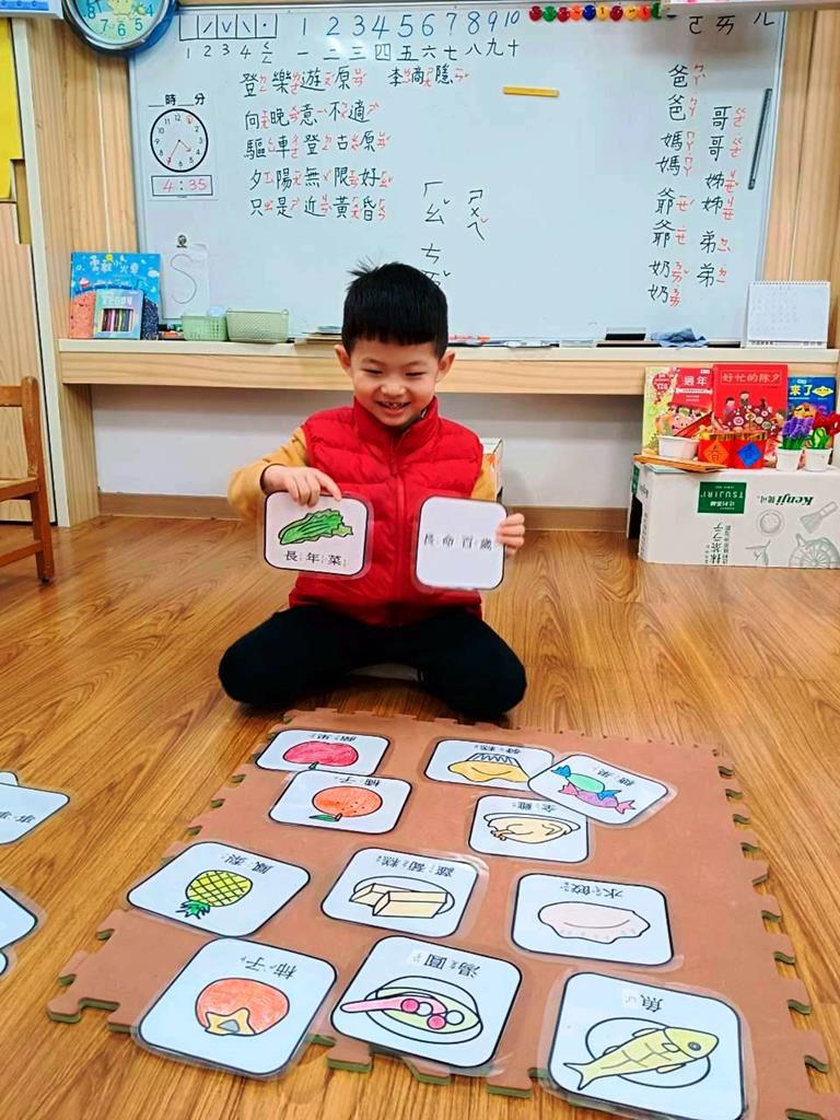老師介紹各種年菜所代表的含意,並帶領幼兒進行「吉祥話配對」活動。