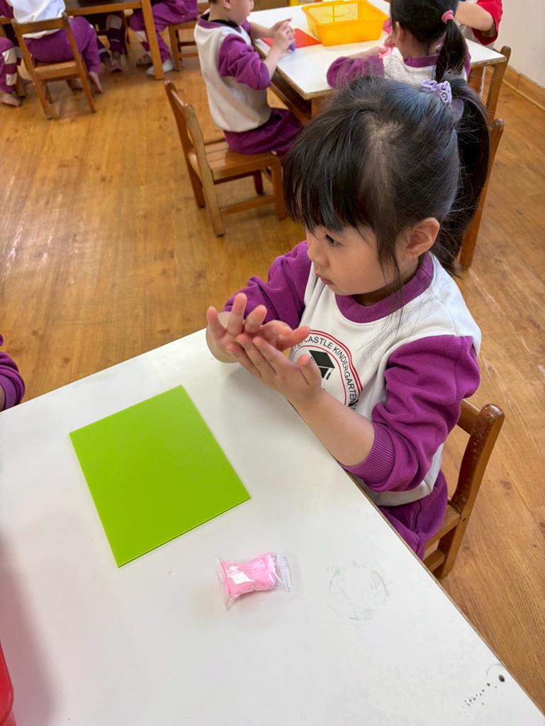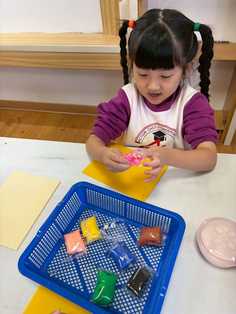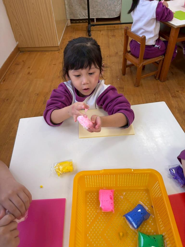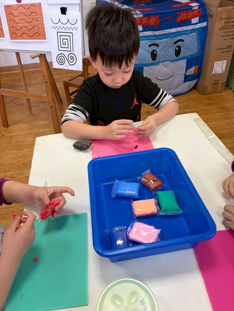 老師進行立體創作,發放黏土與毛根素材,邀請孩子依自 己想像捏塑出聲音形狀。