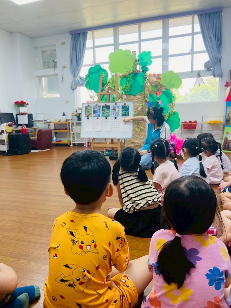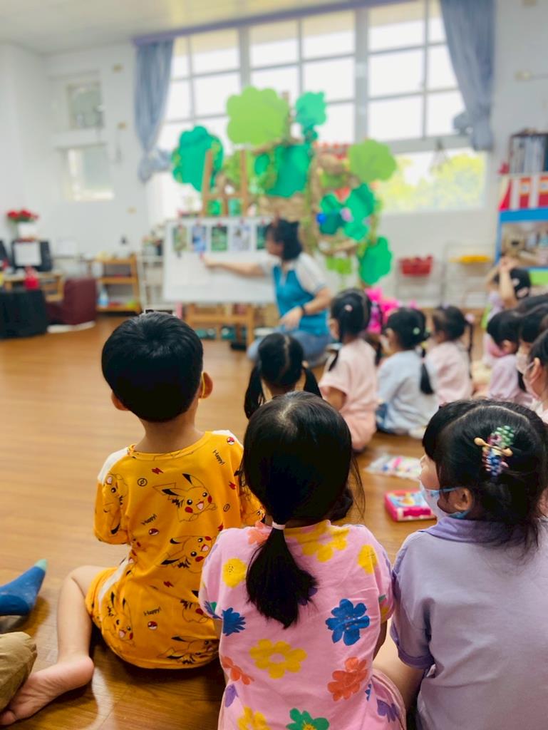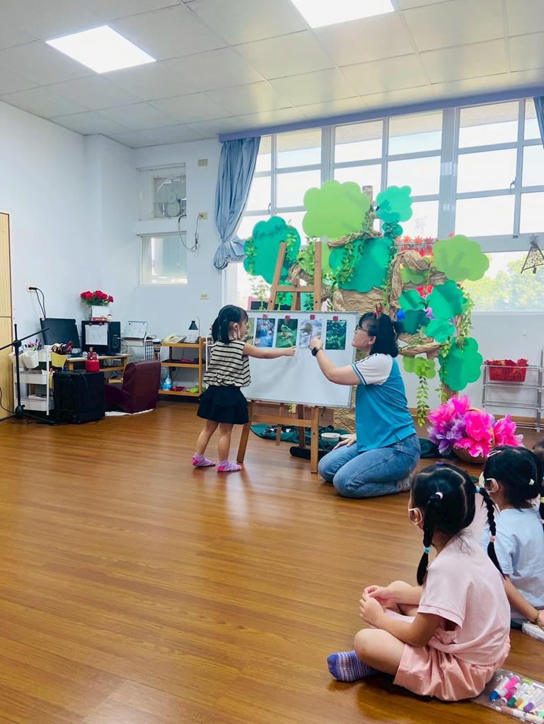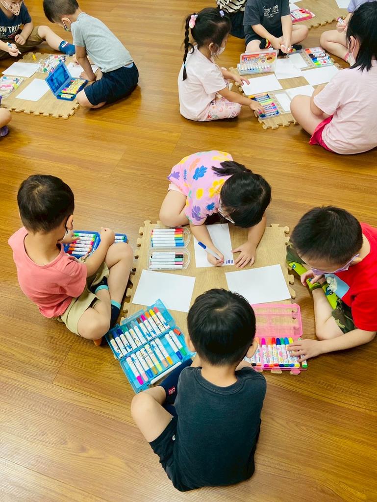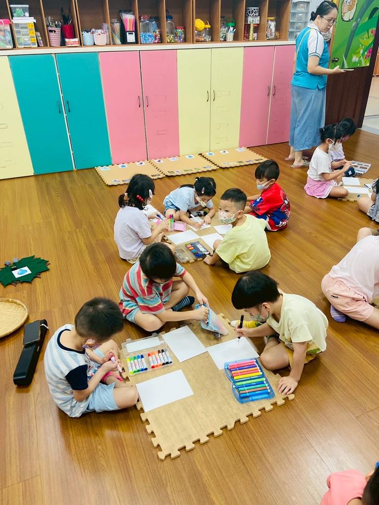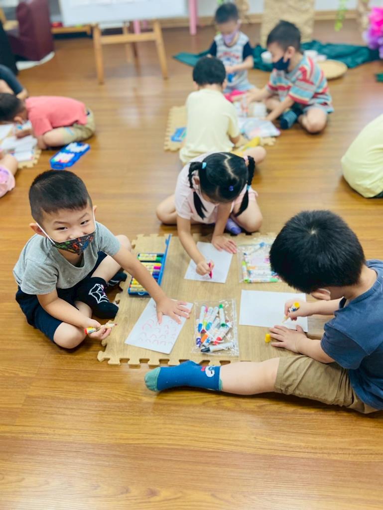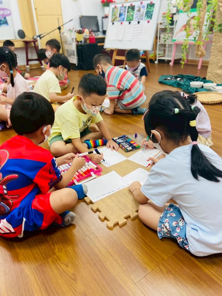 孩子們在課程中聆聽各種大自然的聲音並嘗試用線條和顏色在圖畫紙上表達-我聽到的聲音長甚麼樣子