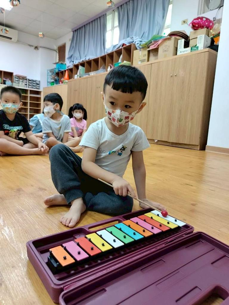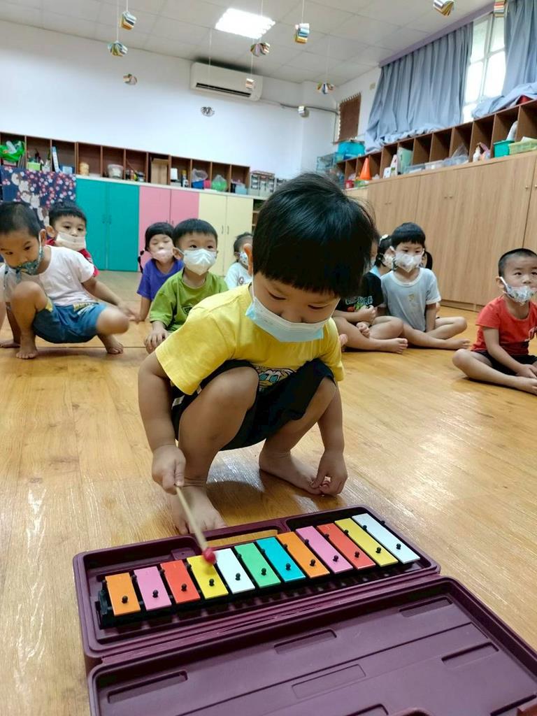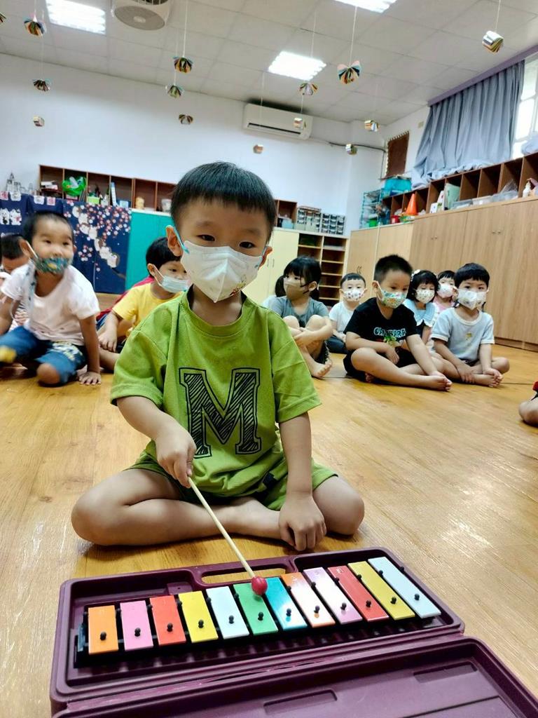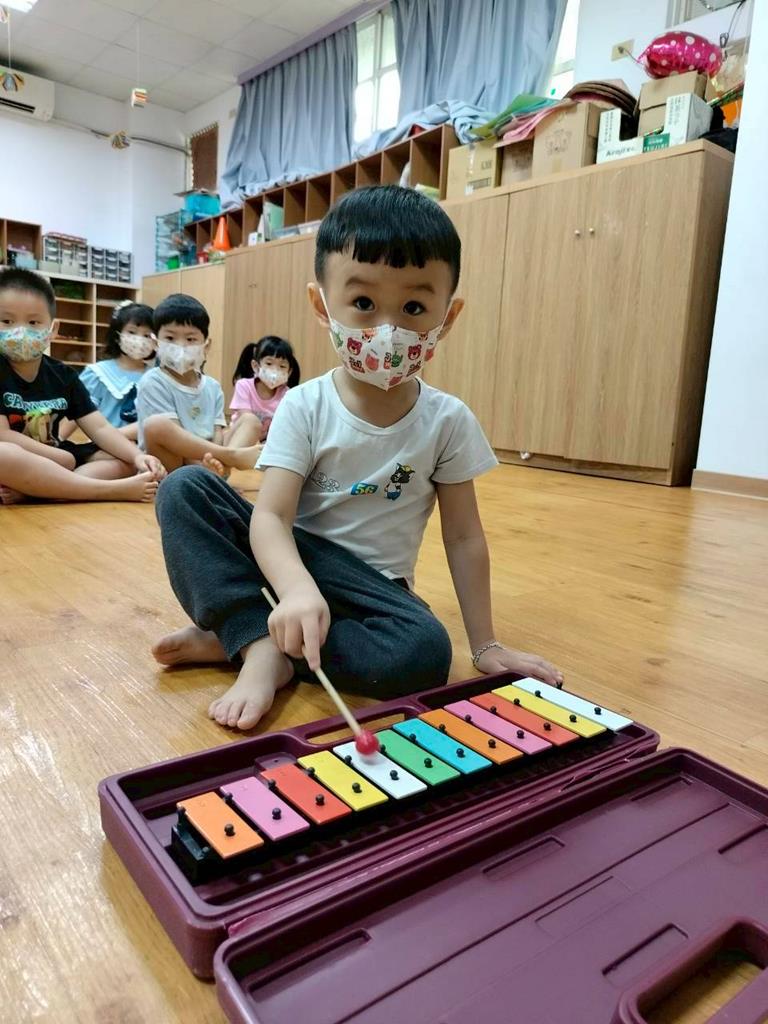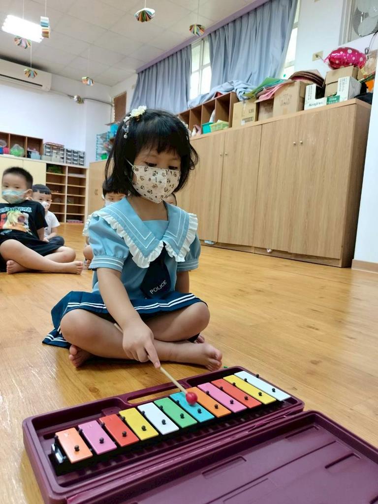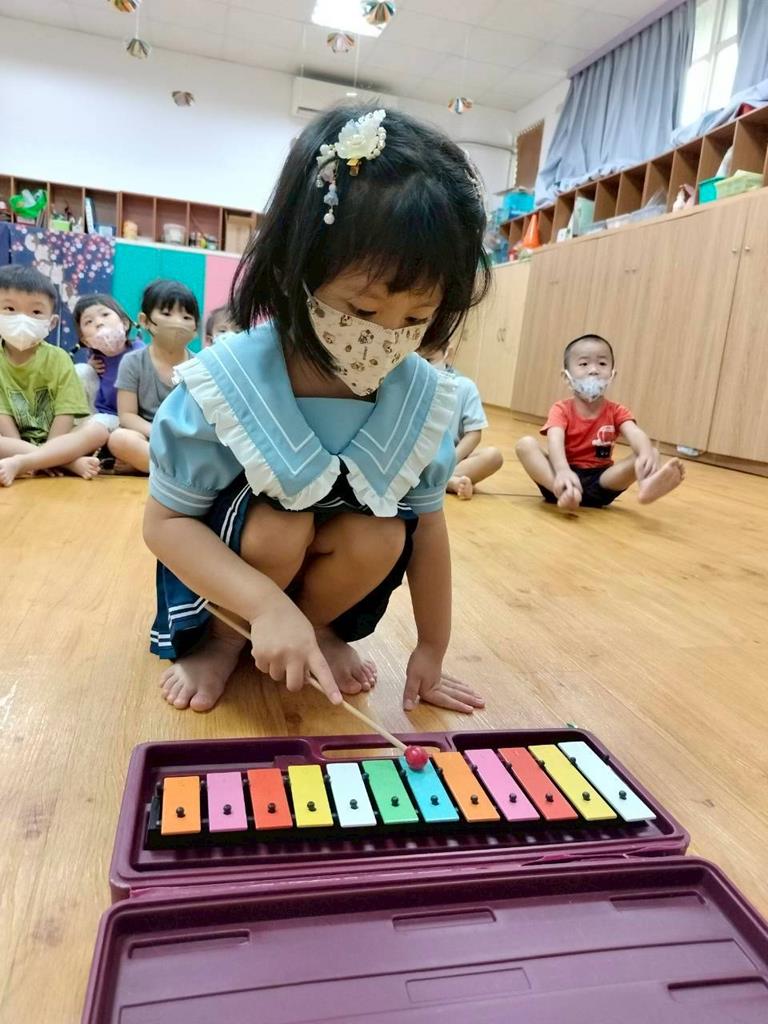 幼兒穿著鮮豔衣服,並準備鐵琴按照幼兒穿衣服的顏色,對應一樣的顏色敲打