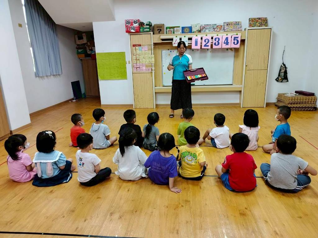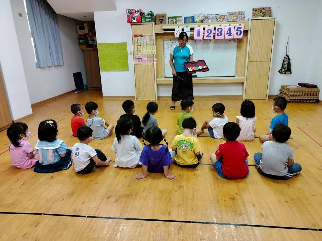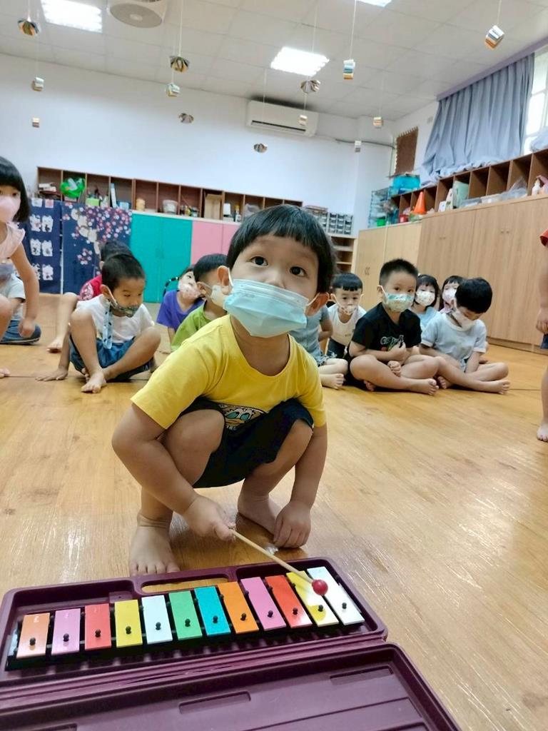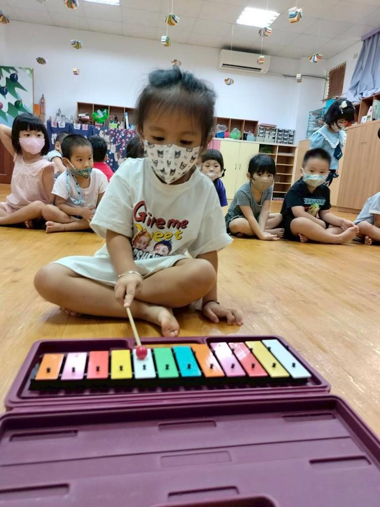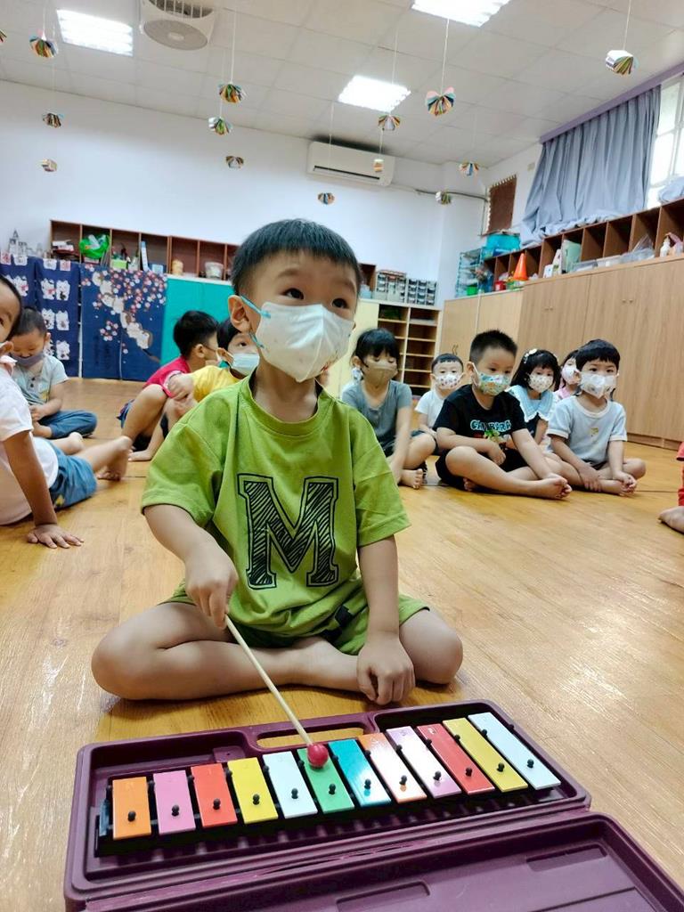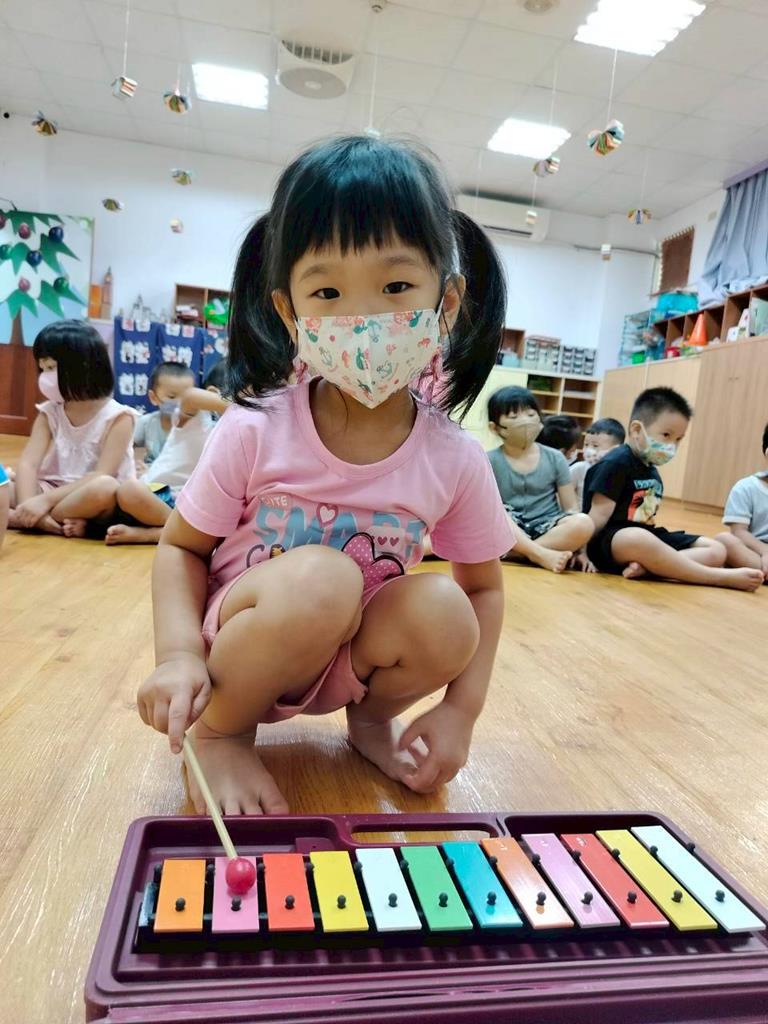 幼兒穿著鮮豔衣服,並準備鐵琴按照幼兒穿衣服的顏色,對應一樣的顏色敲打