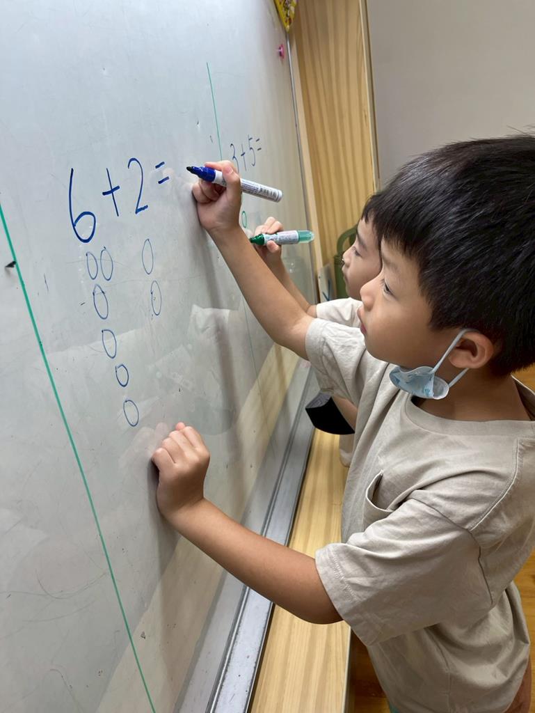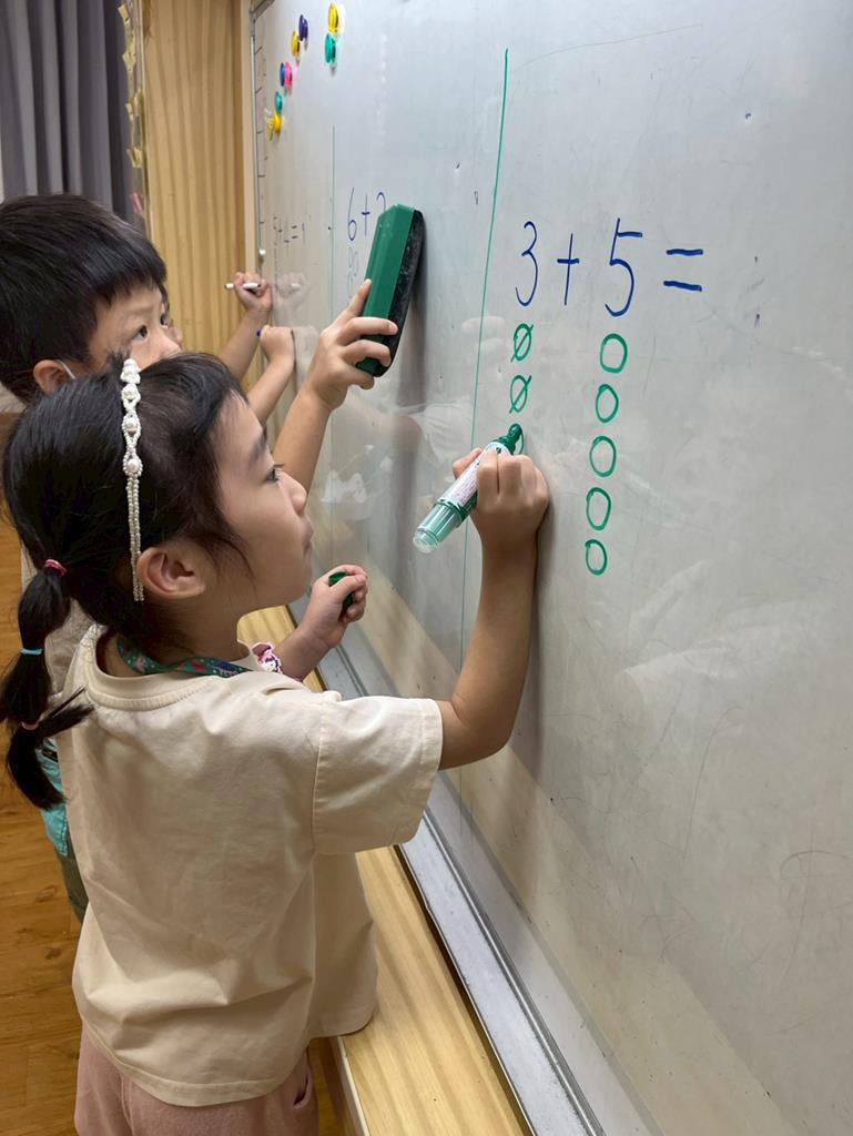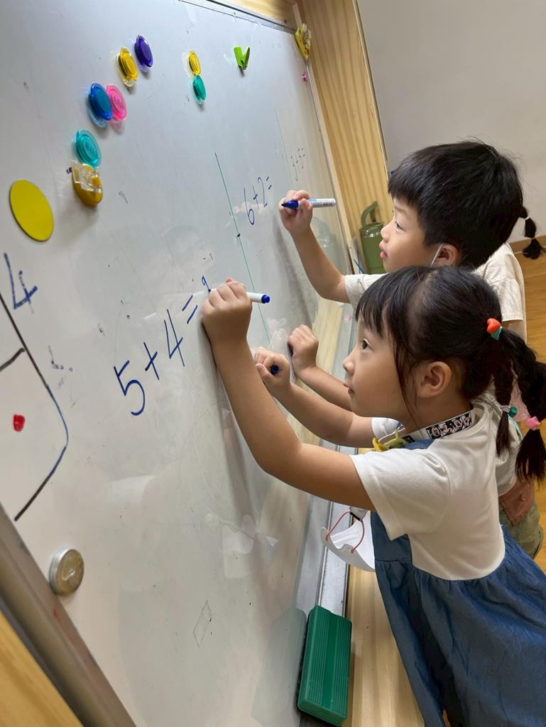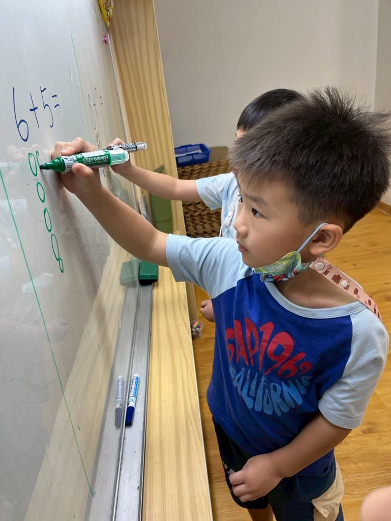 幼兒利用數字卡練習加法算式,並運用二十以內的合成整理數量訊息