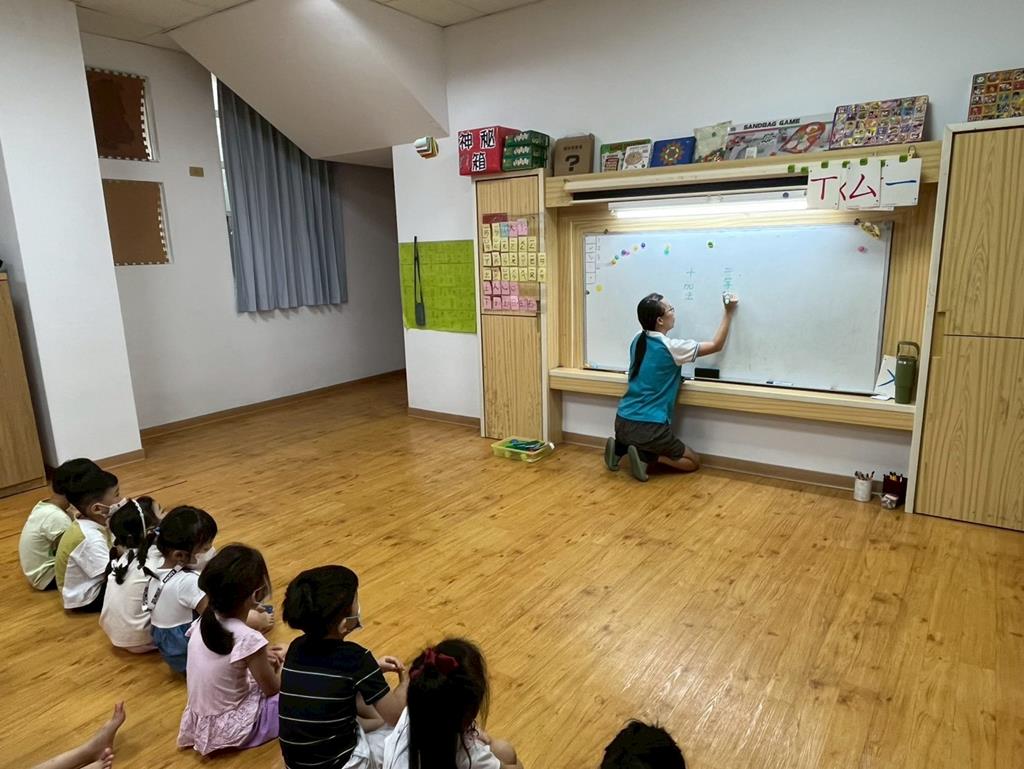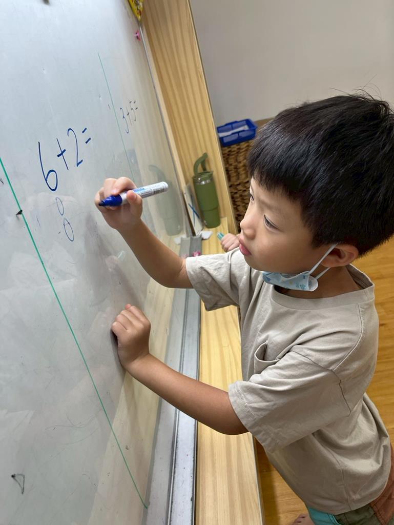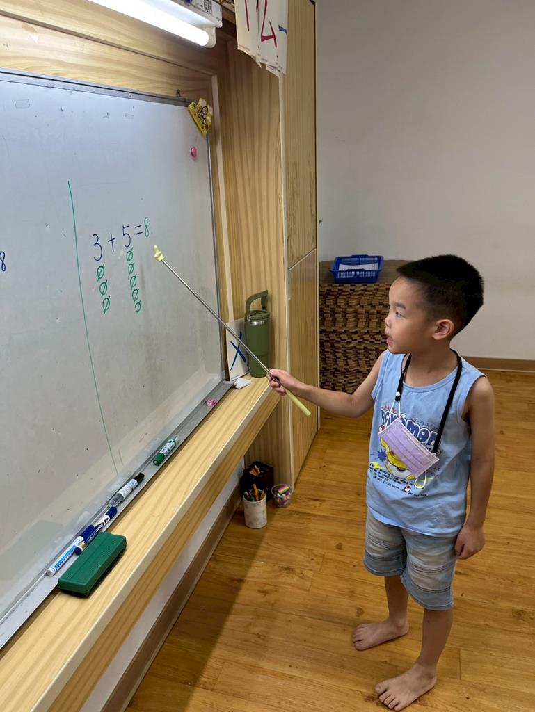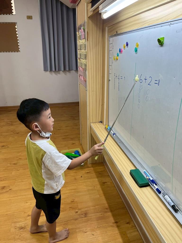 幼兒利用數字卡練習加法算式,並運用二十以內的合成整理數量訊息