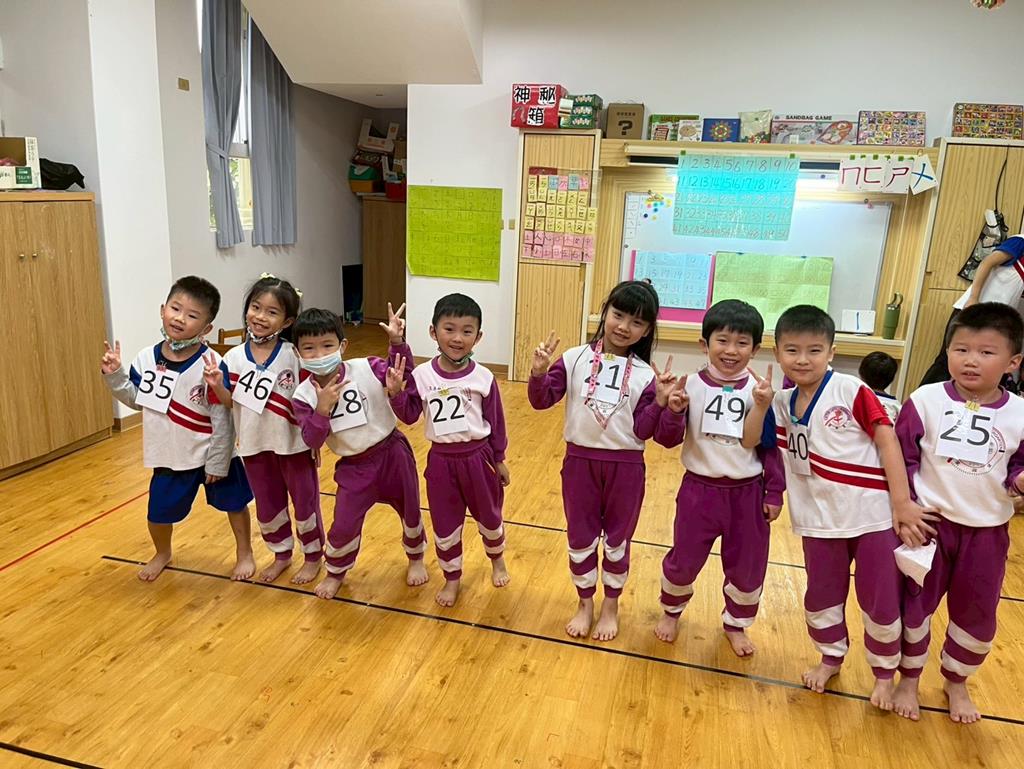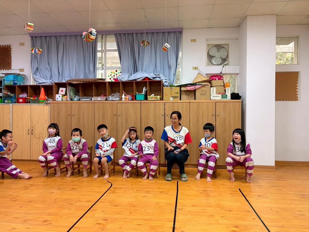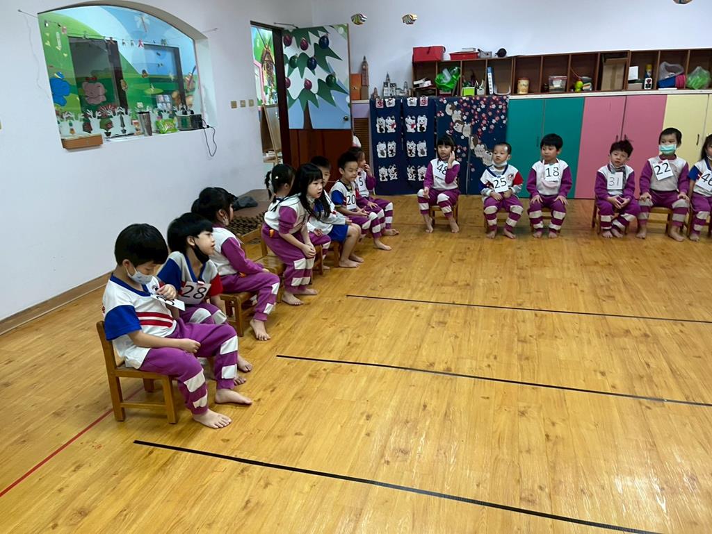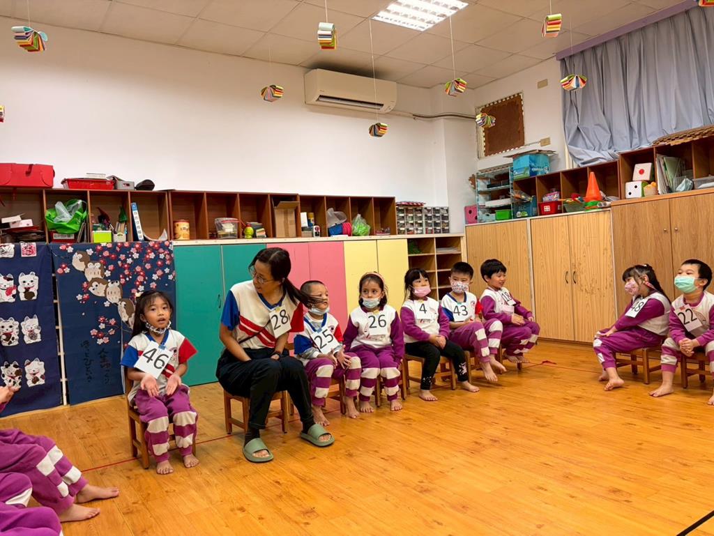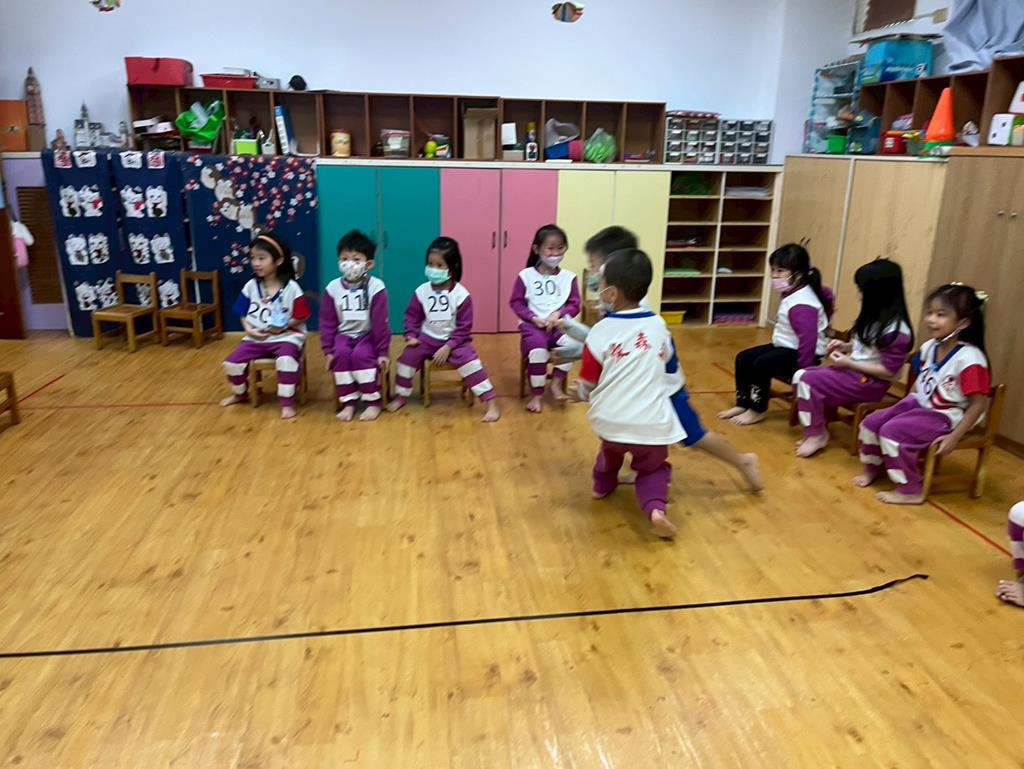 老師帶著幼兒進行遊戲,將數字夾在幼兒身上,進行數字大風吹
