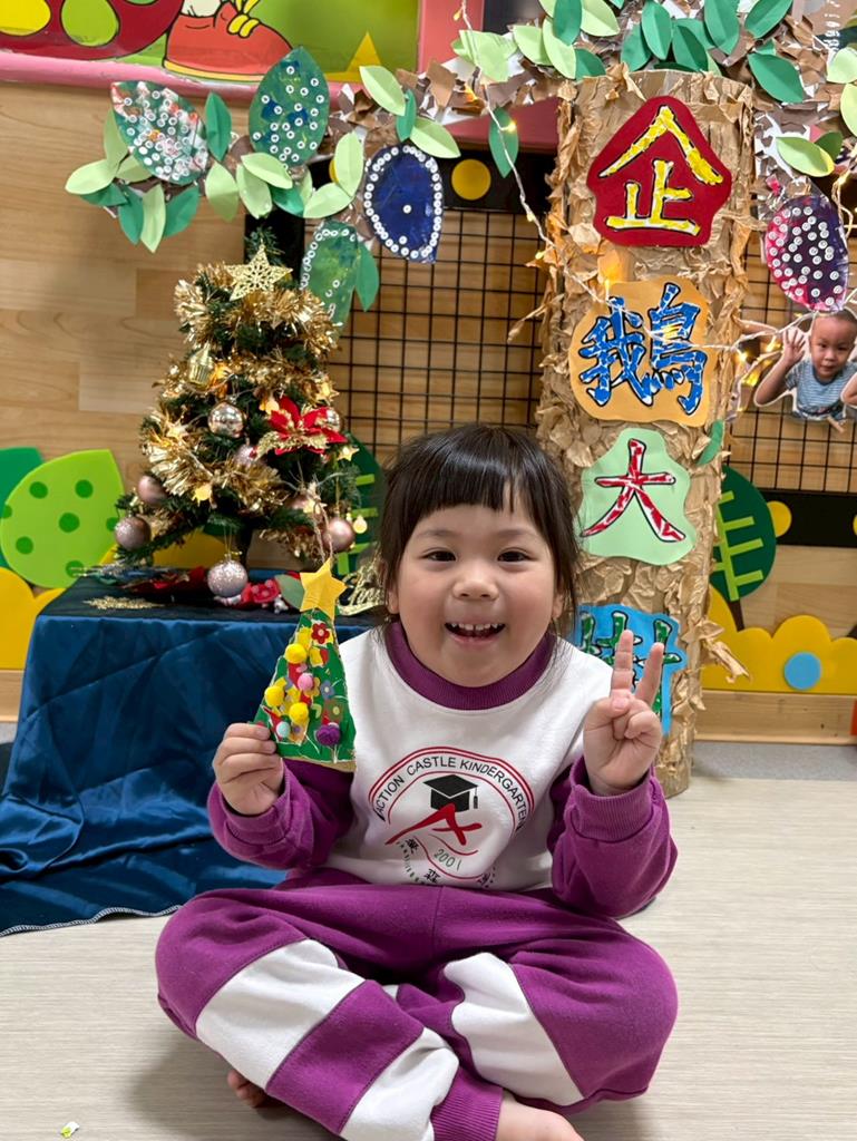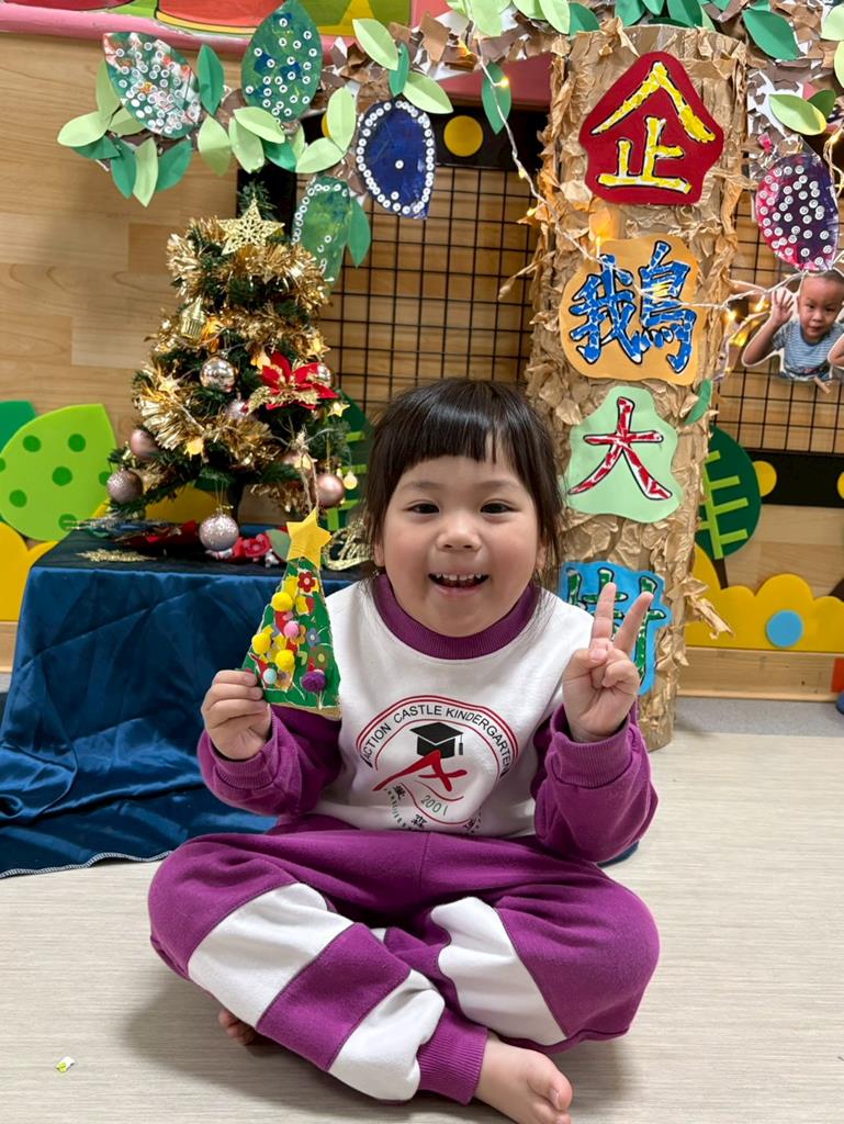 幼兒運用色紙撕貼黏貼毛球創作可愛聖誕樹