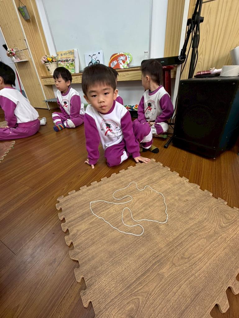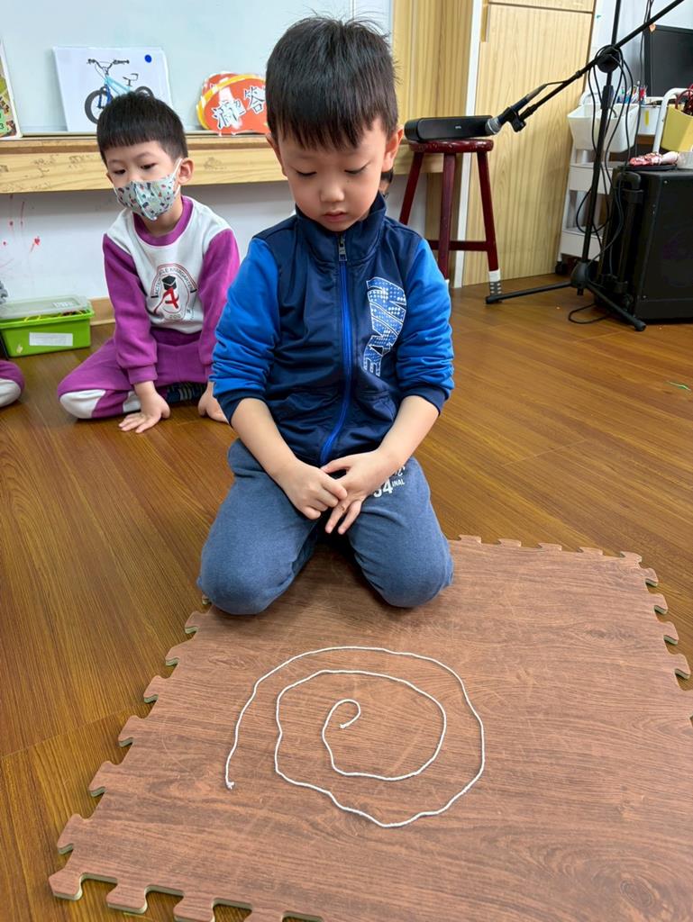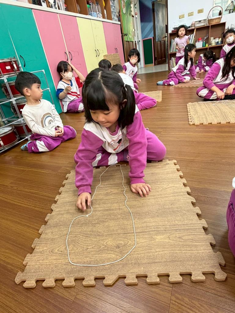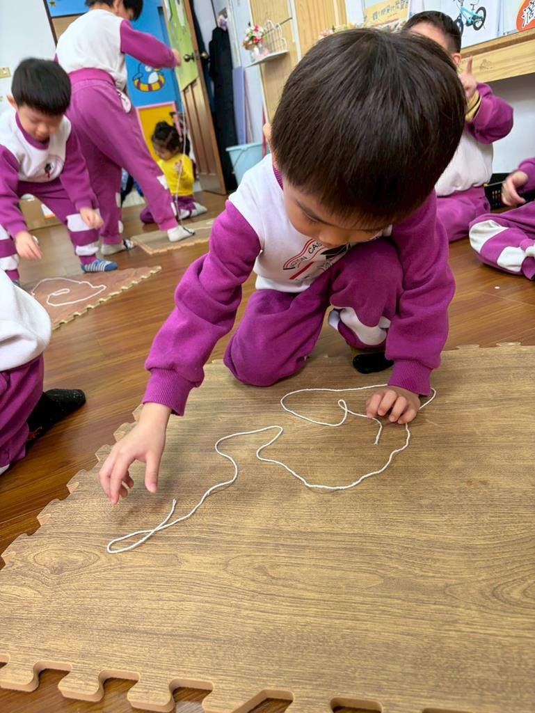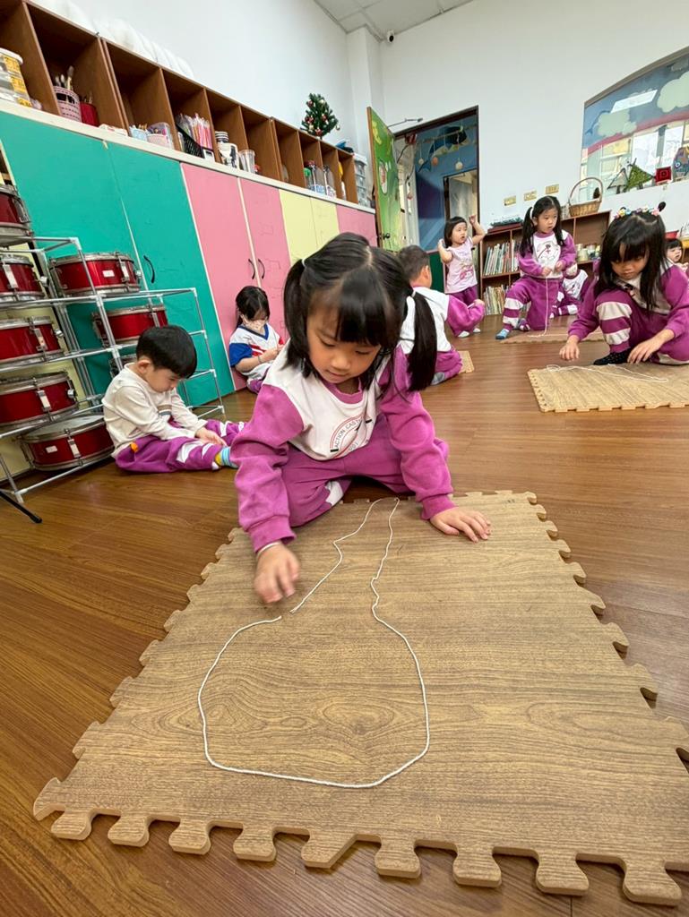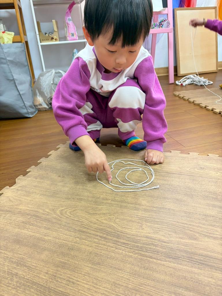 邀請孩子進行線條創作,孩子先用長繩子在地上排出 耳朵聽到的聲音節奏。