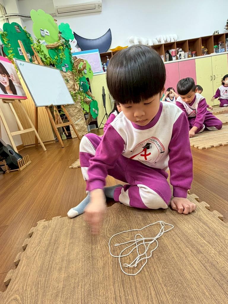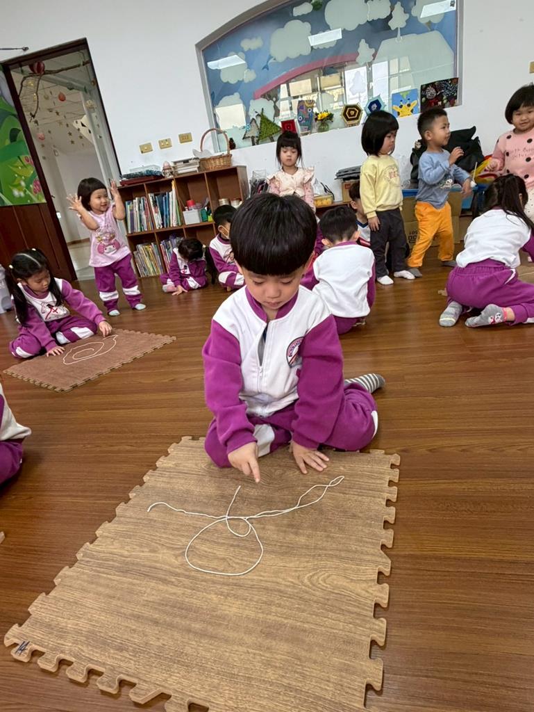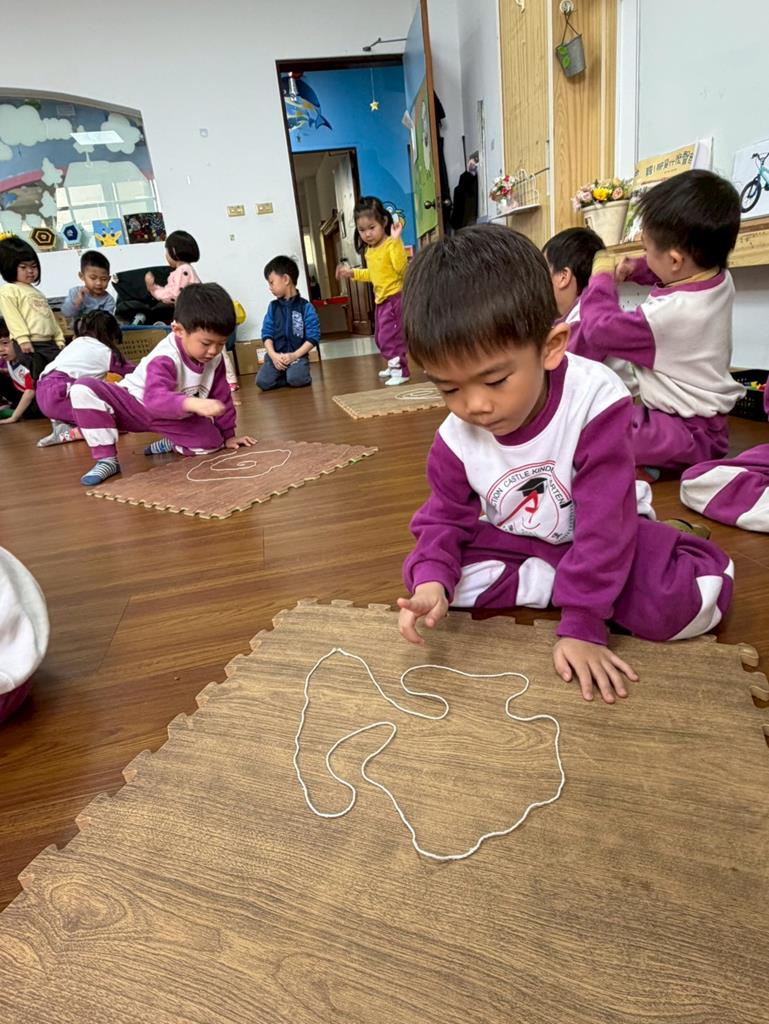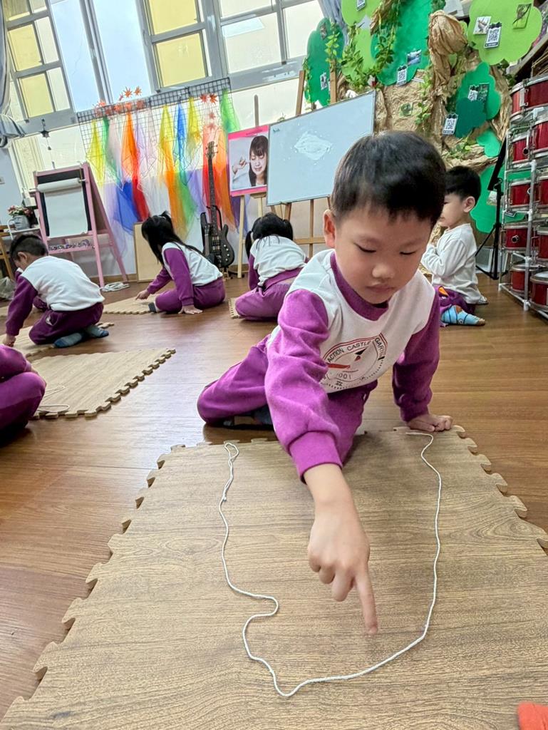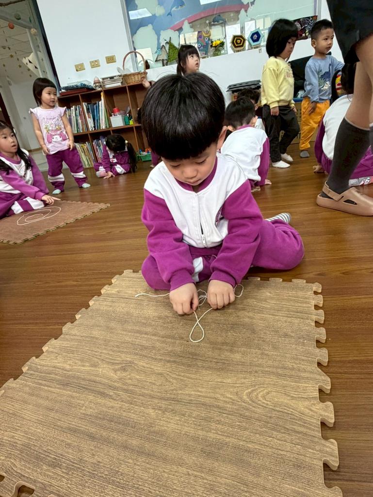 邀請孩子進行線條創作,孩子先用長繩子在地上排出 耳朵聽到的聲音節奏。