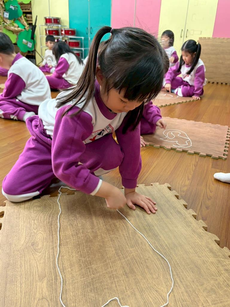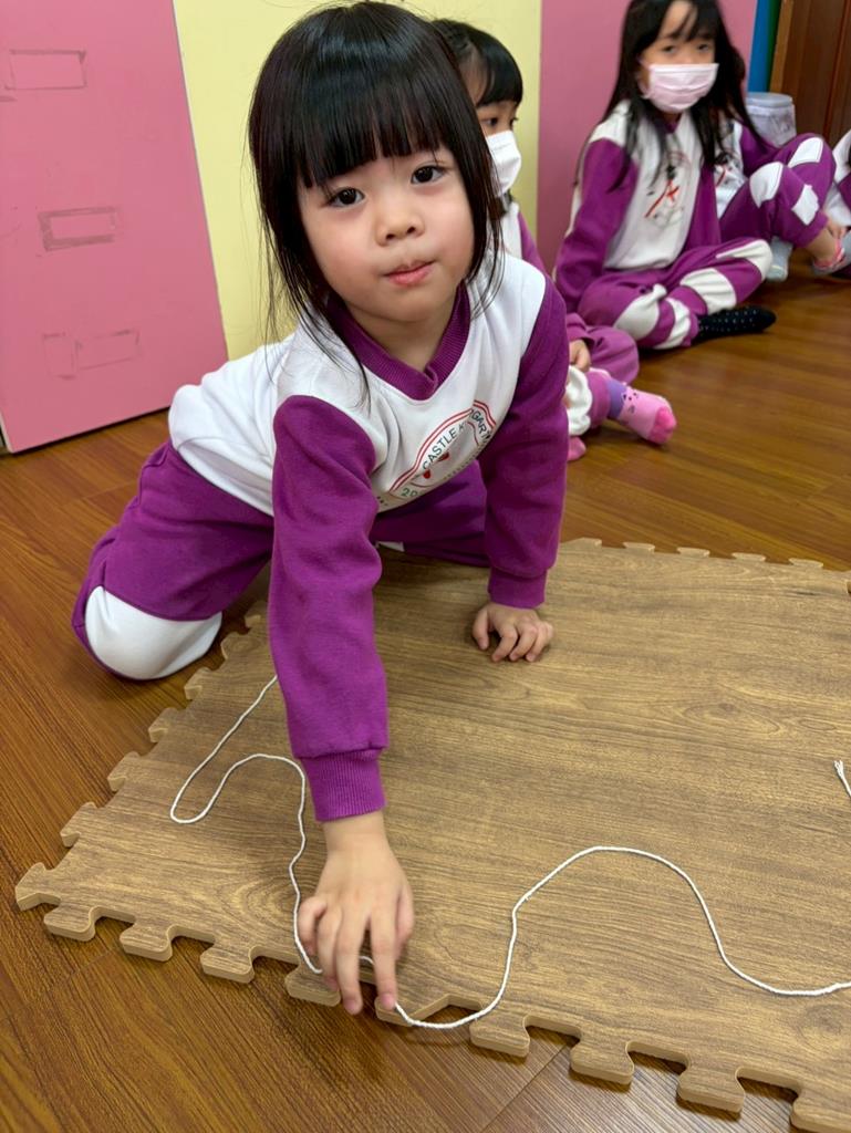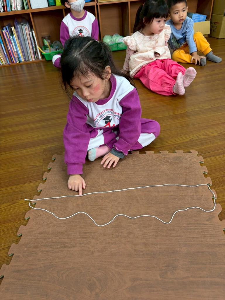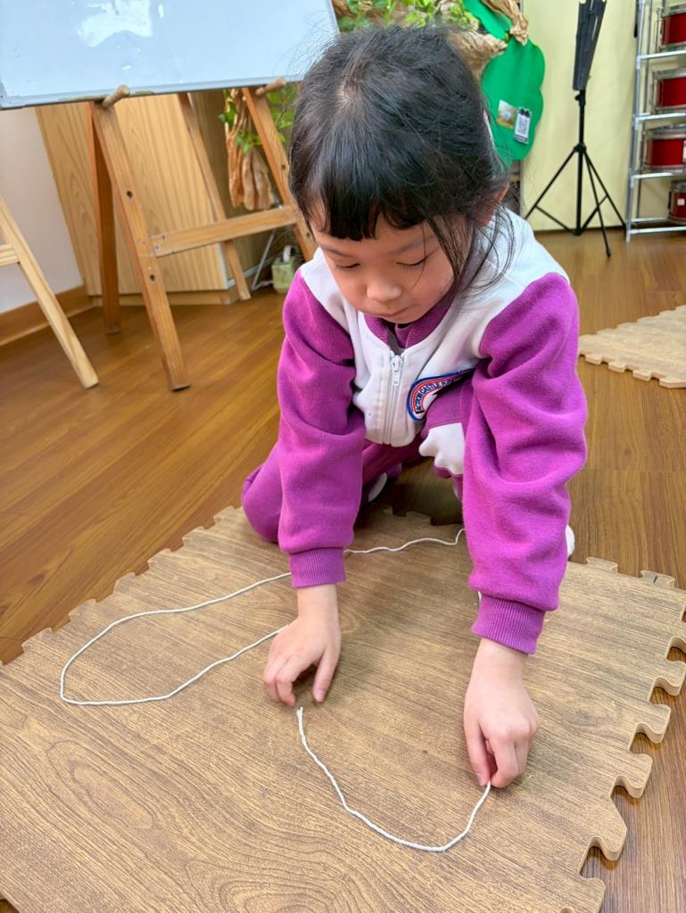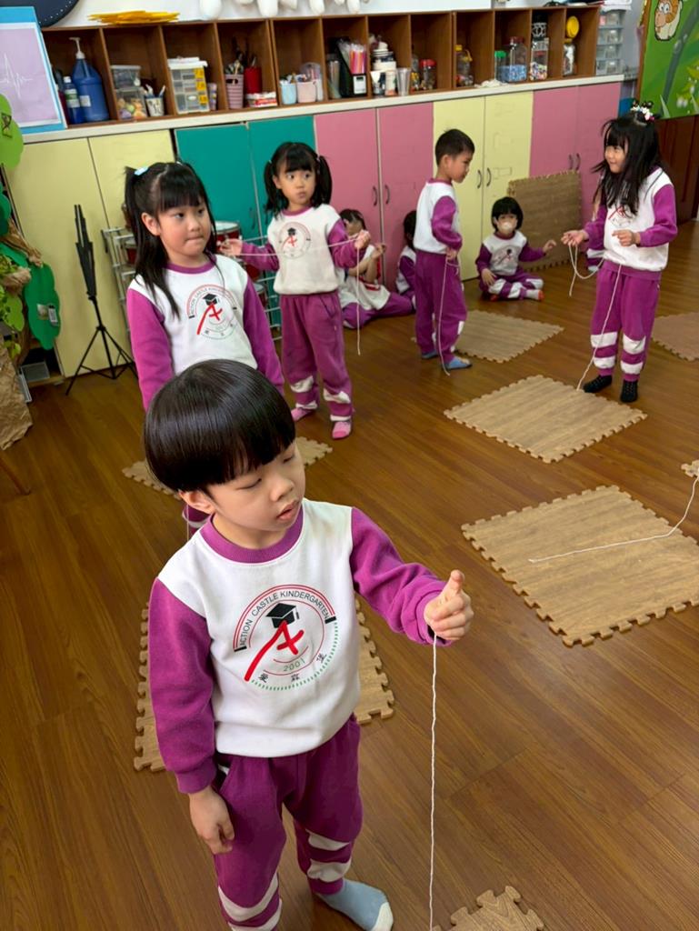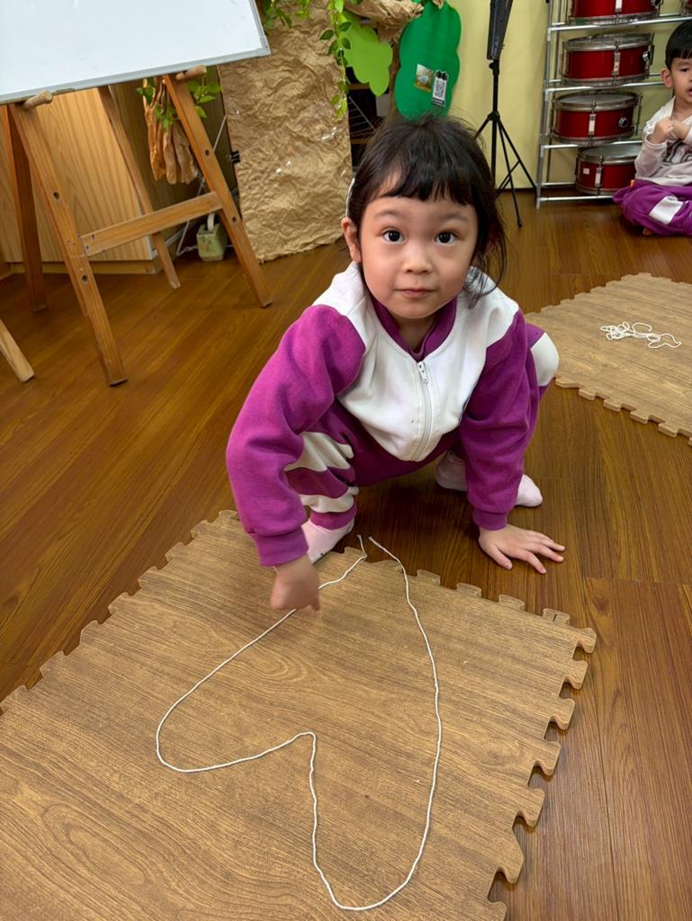 邀請孩子進行線條創作,孩子先用長繩子在地上排出 耳朵聽到的聲音節奏。